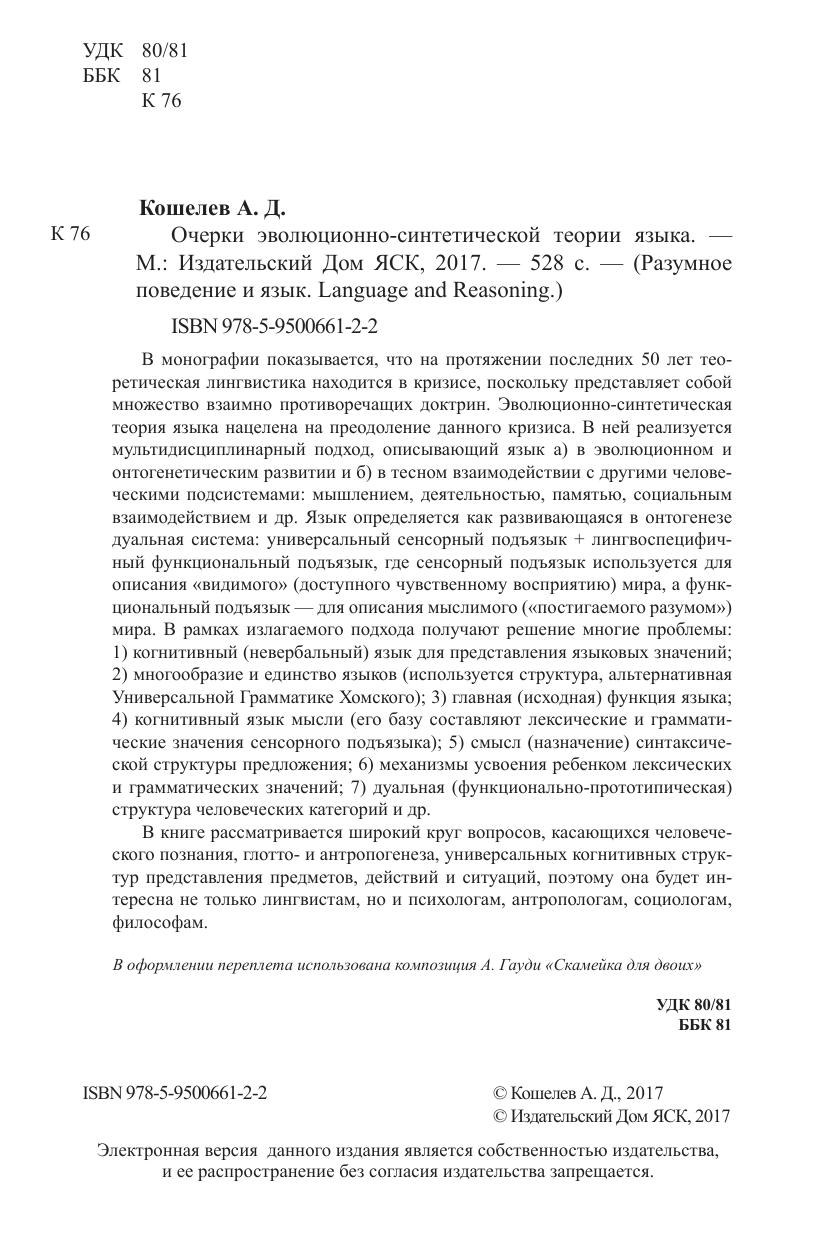 В монографии показывается, что на протяжении последних 50 лет теоретическая лингвистика находится в кризисе, поскольку представляет собой множество взаимно противоречащих доктрин. Эволюционно-синтетическая теория языка нацелена на преодоление данного кризиса. В ней реализуется мультидисциплинарный подход, описывающий язык а) в эволюционном и онтогенетическим развитии и б) в тесном взаимодействии с другими человеческими подсистемами: мышлением, деятельностью, памятью, социальным взаимодействием и др. Язык определяется как развивающаяся в онтогенезе дуальная система: универсальный сенсорный подъязык + лингвоспецифичный функциональный подъязык, где сенсорный подъязык используется для описания «видимого» (доступного чувственному восприятию) мира, а функциональный подъязык – для описания мыслимого («постигаемого разумом») мира. При этом лексические и грамматические значения сенсорного подъязыка составляют базу универсального языка мысли. В рамках излагаемого подхода получают объяснение многие проблемные вопросы: многообразие и единство языков, сущность человеческого языка и его отличие от протоязыка, языковая классификация фрагментов действительности, механизмы усвоения ребенком лексических и грамматических значений, факторы социально обусловленного развития языка и др. .В книге рассматривается широкий круг вопросов, касающихся человеческого познания, глотто- и антропогенеза, универсальных когнитивных структур представления предметов, действий и ситуаций, поэтому она будет интересна не только лингвистам, но и психологам, антропологам, социологам, философам.