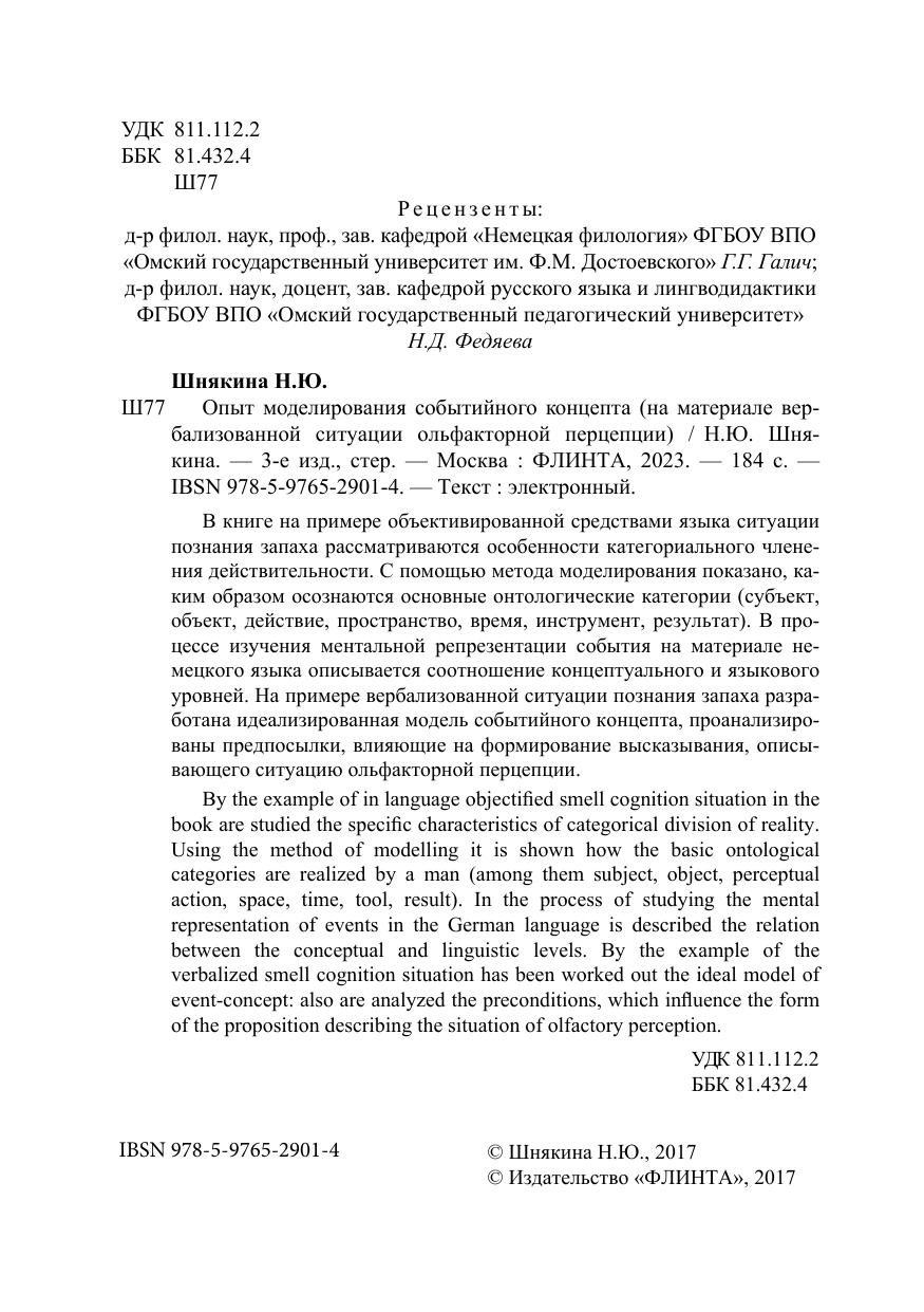 В книге на примере объективированной средствами языка ситуации познания запаха рассматриваются особенности категориального членения действительности. С помощью метода моделирования показано, каким образом осознаются основные онтологические категории (субъект, объект, действие, пространство, время, инструмент, результат). В процессе изучения ментальной репрезентации события на материале немецкого языка описывается соотношение концептуального и языкового уровней. На примере вербализованной ситуации познания запаха разра-ботана идеализированная модель событийного концепта, проанализированы предпосылки, влияющие на формирование высказывания, описывающего ситуацию ольфакторной перцепции.