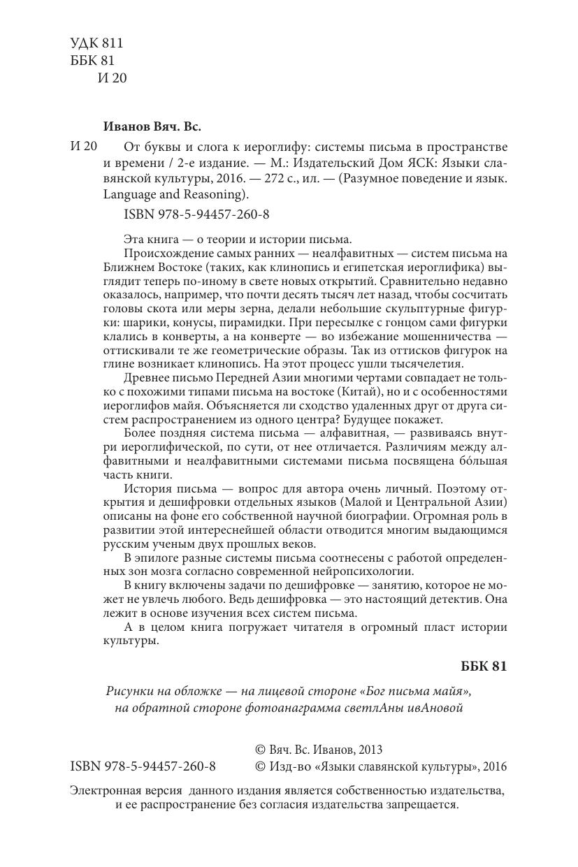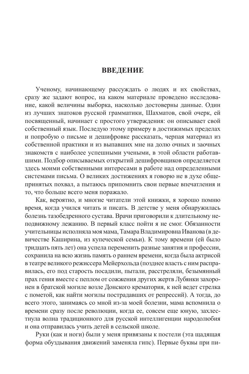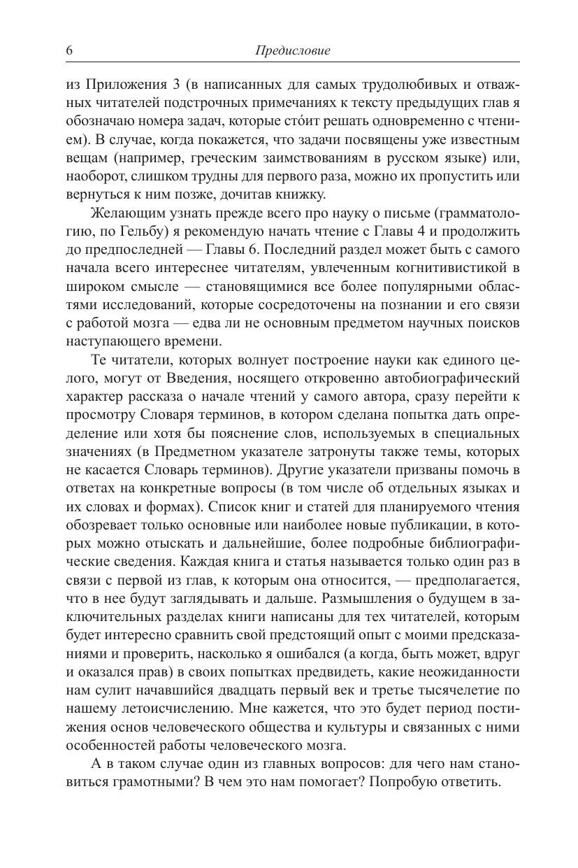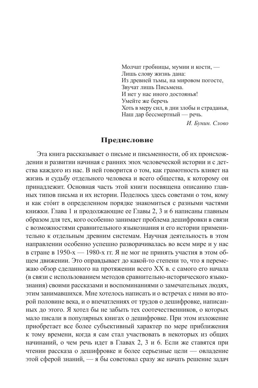 Эта книга - о теории и истории письма. Происхождение самых ранних - неалфавитных - систем письма на Ближнем Востоке (таких, как клинопись и египетская иероглифика) выглядит теперь по-иному в свете новых открытий. Сравнительно недавно оказалось, например, что почти десять тысяч лет назад, чтобы сосчитать головы скота или меры зерна, делали небольшие скульптурные фигурки: шарики, конусы, пирамидки. При пересылке с гонцом сами фигурки клались в конверты, а на конверте - во избежание мошенничества - оттискивали те же геометрические образы. Так из оттисков фигурок на глине возникает клинопись. На этот процесс ушли тысячелетия. Древнее письмо Передней Азии многими чертами совпадает не только с похожими типами письма на востоке (Китай), но и с особенностями иероглифов майя. Объясняется ли сходство удаленных друг от друга систем распространением из одного центра? Будущее покажет. Более поздняя система письма - алфавитная, - развиваясь внутри иероглифической, по сути, от нее отличается. Различиям между алфавитными и неалфавитными системами письма посвящена большая часть книги. История письма - вопрос для автора очень личный. Поэтому открытия и дешифровки отдельных языков (Малой и Центральной Азии) описаны на фоне его собственной научной биографии. Огромная роль в развитии этой интереснейшей области отводится многим выдающимся русским ученым двух прошлых веков. В эпилоге разные системы письма соотнесены с работой определенных зон мозга согласно современной нейропсихологии. В книгу включены задачи по дешифровке - занятию, которое не может не увлечь любого. Ведь дешифровка - это настоящий детектив. Она лежит в основе изучения всех систем письма. А в целом книга погружает читателя в огромный пласт истории культуры.