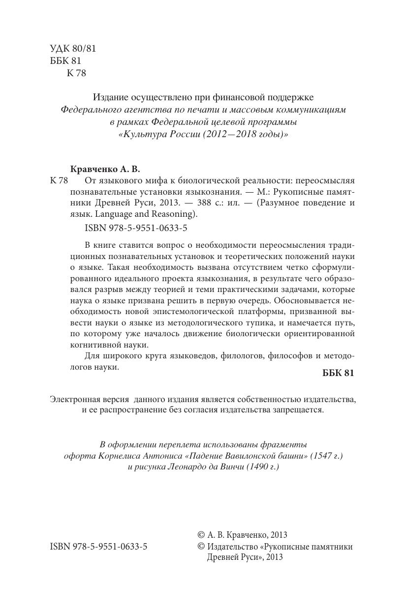 В книге ставится вопрос о необходимости переосмысления традиционных познавательных установок и теоретических положений науки о языке. Такая необходимость вызвана отсутствием четко сформулированного идеального проекта языкознания, в результате чего образовался разрыв между теорией и теми практическими задачами, которые наука о языке призвана решить в первую очередь. Обосновывается необходимость новой эпистемологической платформы, призванной вывести науки о языке из методологического тупика, и намечается путь, по которому уже началось движение биологически ориентированной когнитивной науки. Для широкого круга языковедов, филологов, философов и методологов науки.