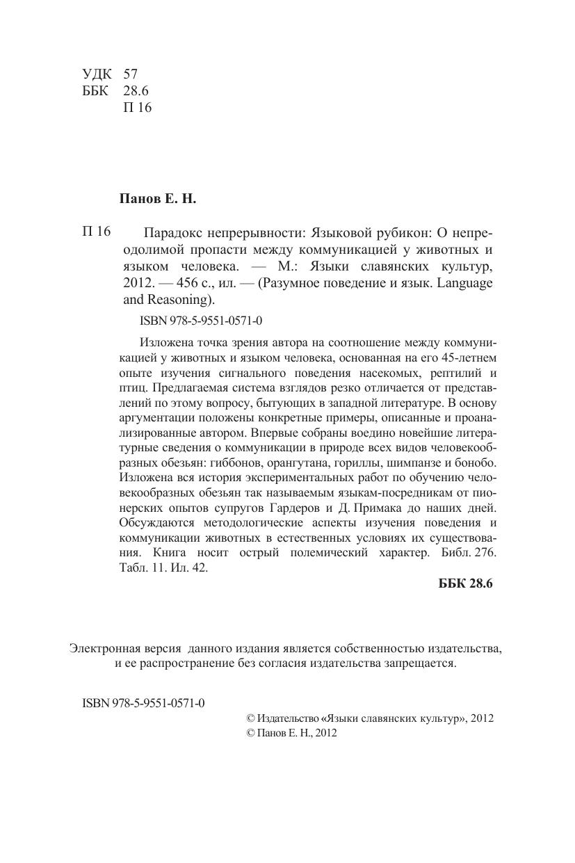 Изложена точка зрения автора на соотношение между коммуникацией у животных и языком человека, основанная на его 45-летнем опыте изучения сигнального поведения наcекомых, рептилий и птиц. Предлагаемая система взглядов резко отличается от представлений по этому вопросу, бытующих в западной литературе. В основу аргументации положены конкретные примеры, описанные и проанализированные автором. Впервые собраны воедино новейшие литературные сведения о коммуникации в природе всех видов человекообразных обезьян: гиббонов, орангутана, гориллы, шимпанзе и бонобо. Изложена вся история экспериментальных работ по обучению человекообразных обезьян так называемым языкам - посредникам от пионерских опытов супругов Гардеров и Д. Примака до наших дней. Обсуждаются методологические аспекты изучения поведения и коммуникации животных в естественных условиях их существования. Книга носит острый полемический характер.