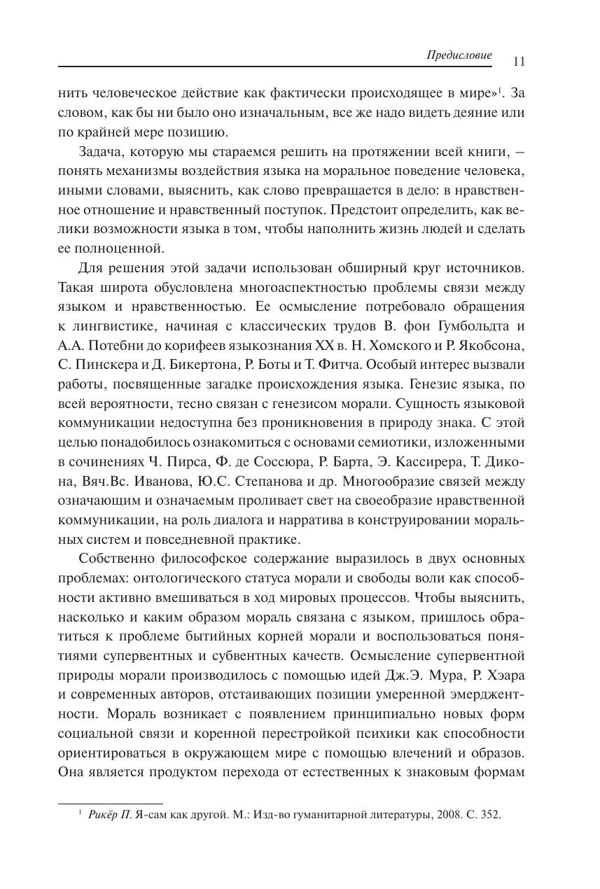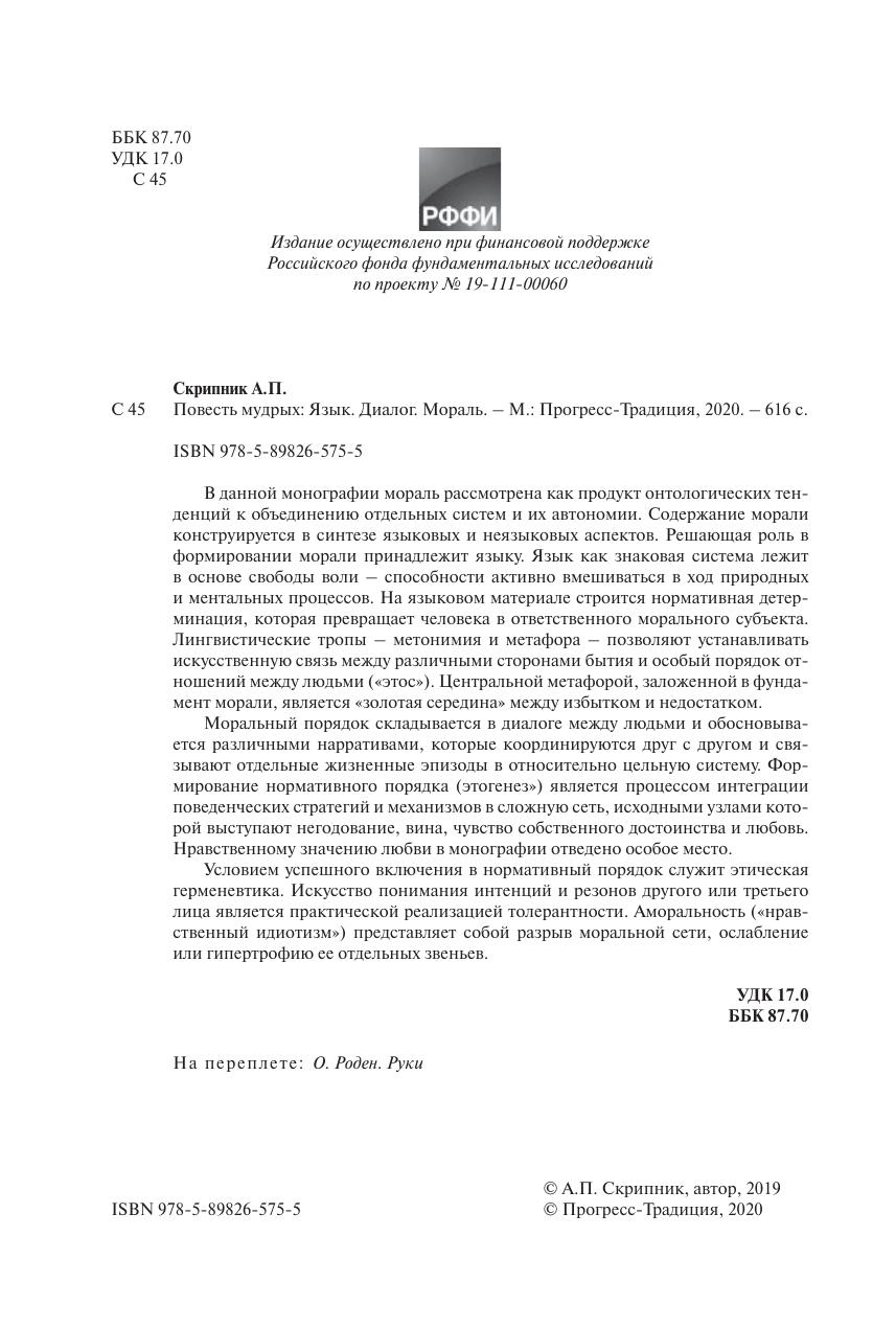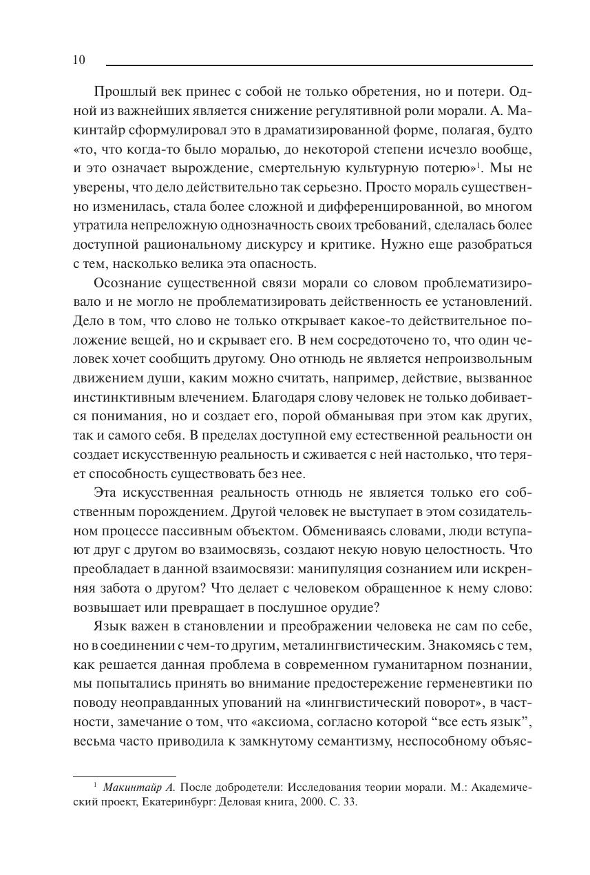 В данной монографии мораль рассмотрена как продукт онтологических тенденций к объединению отдельных систем и их автономии. Содержание морали конструируется в синтезе языковых и неязыковых аспектов. Решающая роль в формировании морали принадлежит языку. Язык как знаковая система лежит в основе свободы воли – способности активно вмешиваться в ход природных и ментальных процессов. На языковом материале строится нормативная детерминация, которая превращает человека в ответственного морального субъекта. Лингвистические тропы – метонимия и метафора – позволяют устанавливать искусственную связь между различными сторонами бытия и особый порядок отношений между людьми («этос»). Центральной метафорой, заложенной в фундамент морали, является «золотая середина» между избытком и недостатком. Моральный порядок складывается в диалоге между людьми и обосновывается различными нарративами, которые координируются друг с другом и связывают отдельные жизненные эпизоды в относительно цельную систему. Формирование нормативного порядка (этогенез») является процессом интеграции поведенческих стратегий и механизмов в сложную сеть, исходными узлами которой выступают негодование, вина, чувство собственного достоинства и любовь. Нравственному значению любви в монографии отведено особое место. Условием успешного включения в нормативный порядок служит этическая