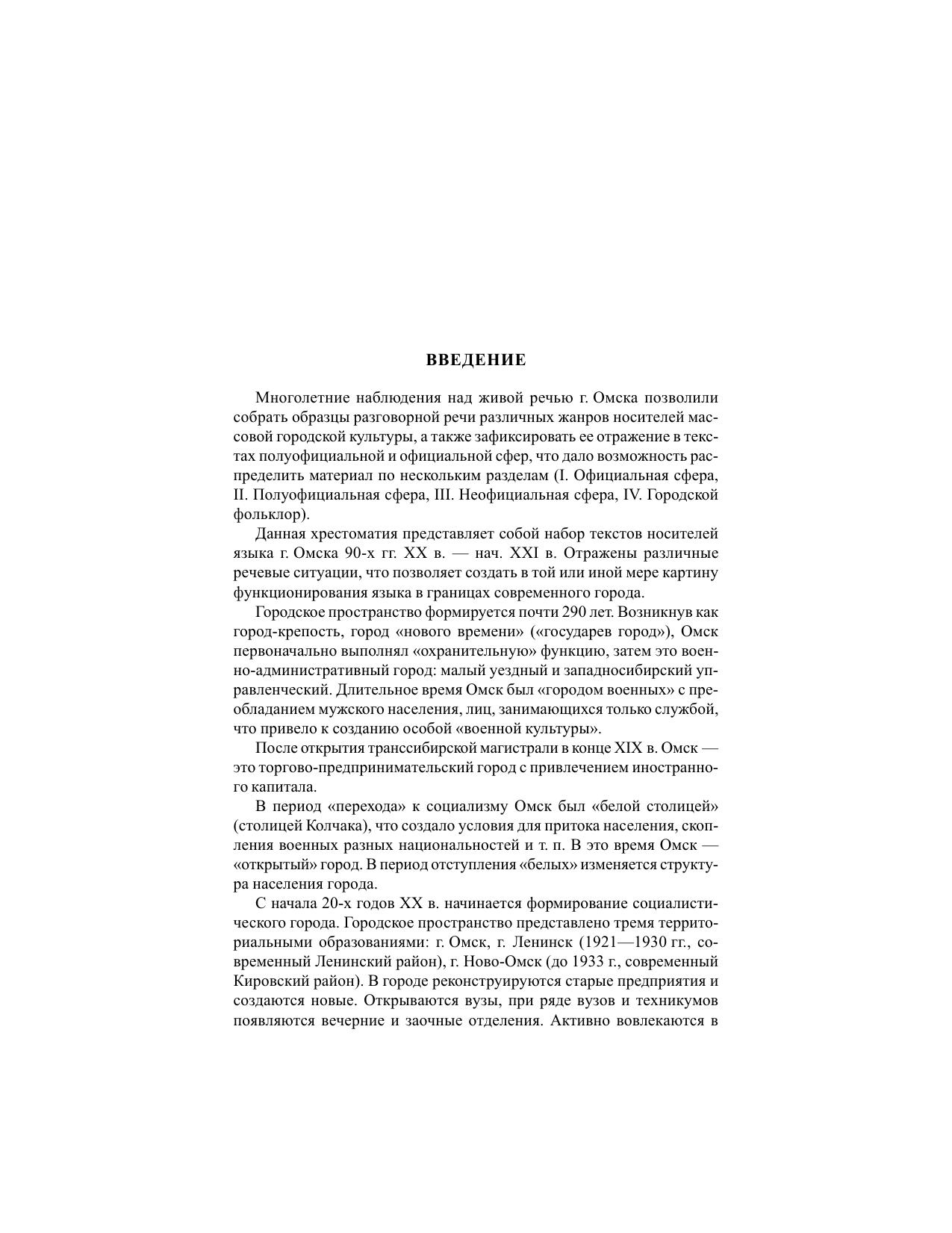 Данная хрестоматия является частью работы по изучению и лексикографическому описанию города, расположенного в Среднем Прииртышье. Это «автопортрет» г. Омска. В хрестоматии сделана попытка отразить речевую практику представителей различных сфер мегаполисной культуры. Для ее формирования использовались речевые произведения, зафиксированные в результате «непосредственного» наблюдения, а также тексты, имеющие письменную форму. Адресована лингвистам, этнографам, краеведам и всем тем, кто интересуется городской культурой и городской речью.