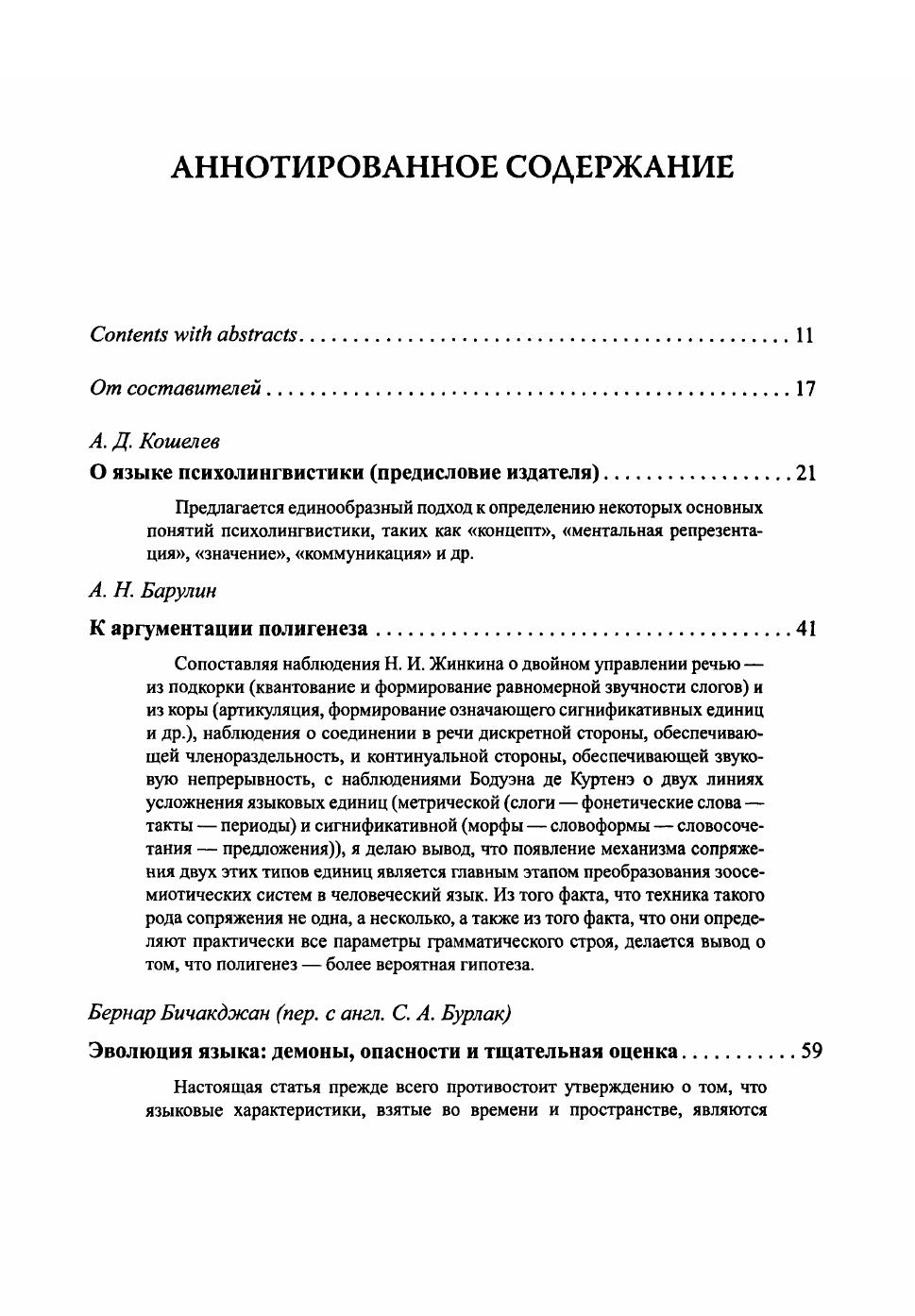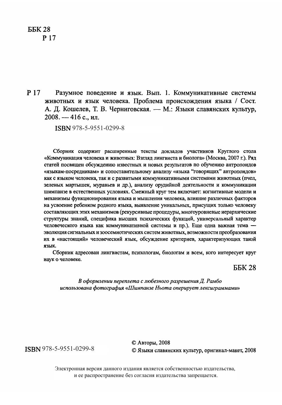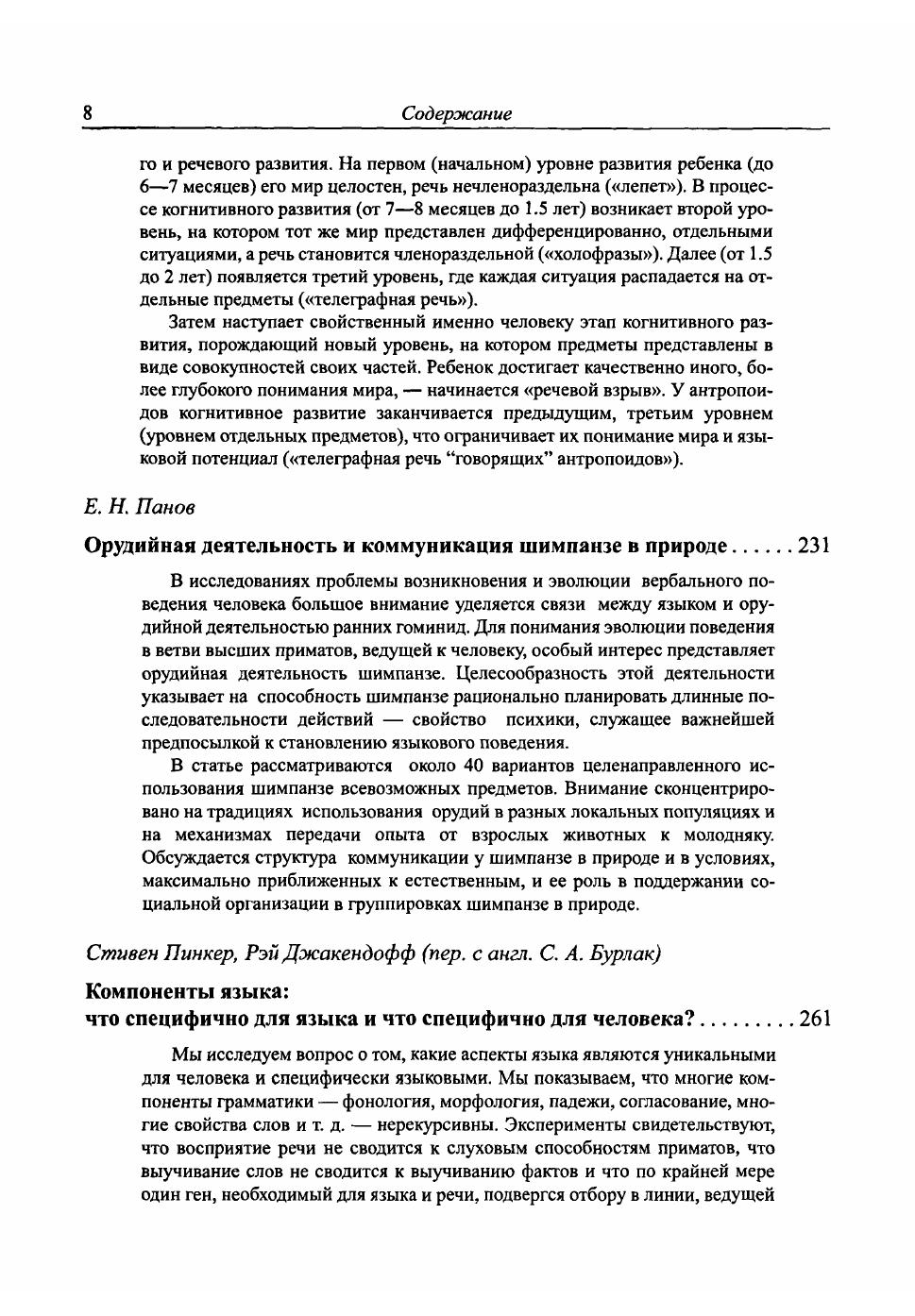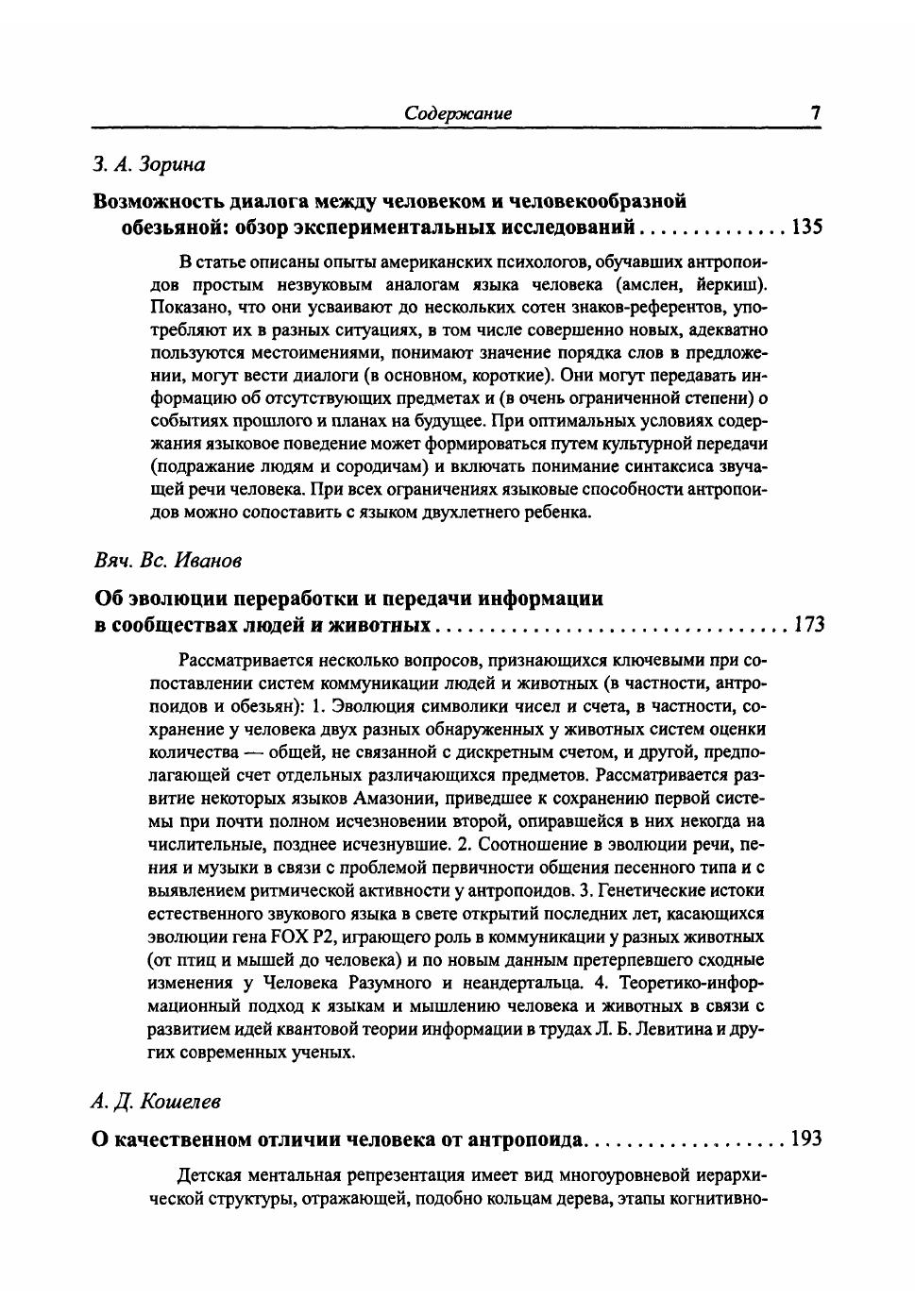 Сборник содержит расширенные тексты докладов участников Круглого стола "Коммуникация человека и животных: Взгляд лингвиста и биолога" (Москва, 2007 г.). Ряд статей посвящен обсуждению известных и новых результатов по обучению антропоидов "языкам-посредникам" и сопоставительному анализу "языка "говорящих" антропоидов" как с языком человека, так и с развитыми коммуникативными системами животных (пчел, зеленых мартышек, муравьев и др.), анализу орудийной деятельности и коммуникации шимпанзе в естественных условиях. Смежный круг тем включает: когнитивные модели и механизмы функционирования языка и мышления человека, влияние различных факторов на усвоение ребенком родного языка, выявление уникальных, присущих только человеку составляющих этих механизмов (рекурсивные процедуры, многоуровневые иерархические структуры знаний, специфика высших психических функций, универсальный характер человеческого языка как коммуникативной системы и пр.). Еще одна важная тема - эволюция сигнальных и зоосемиотических систем животных, возможности преобразования их в "настоящий" человеческий язык, обсуждение критериев, характеризующих такой язык.