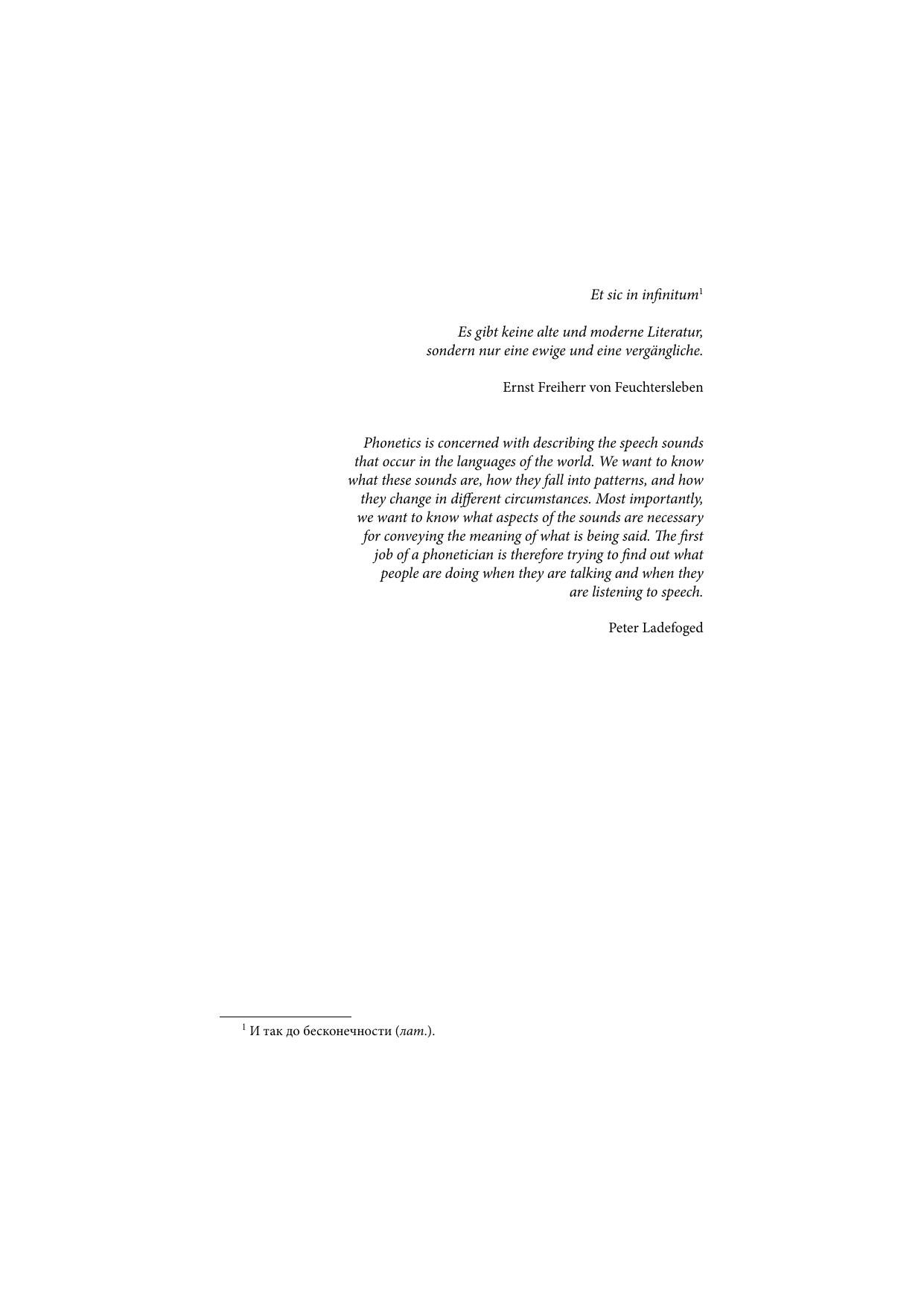 В общей семиотической системе, обеспечивающей успешность межличностной коммуникации, устная речь занимает особое место в силу своих природных свойств (скорости процессов речепорождения и речевосприятия, органической связи со звуковой материей окружающего мира и т. д.), полифункциональности, связанной с актуализацией в речи различных функциональных установок (например, коммуникативной, эмотивной и др.), и полиинформативности, соотносящейся со всем объемом знаний о говорящем, его собеседнике, ситуации общения и т. д. Содержательный диапазон монографии охватывает основные аспекты речеведения как раздела общей семиотики, включающего описание акустической природы звуков речи (сегментного строя языков) и просодии (супрасегментных характеристик различных речевых единиц). Детально представлен материал, позволяющий отразить все многообразие средств микро- и макросегментации речевого потока. Антропоцентрический подход к изучению звуковой материи обусловлен всесторонним анализом проблематики, связанной с триадой "еербалика - паравербапика - коммуникация". Особое внимание уделено различным аспектам речеведения с позиций прагмалингвистики. Монография включает результаты целого ряда авторских экспериментальных исследований и оригинальных концептуальных разработок.