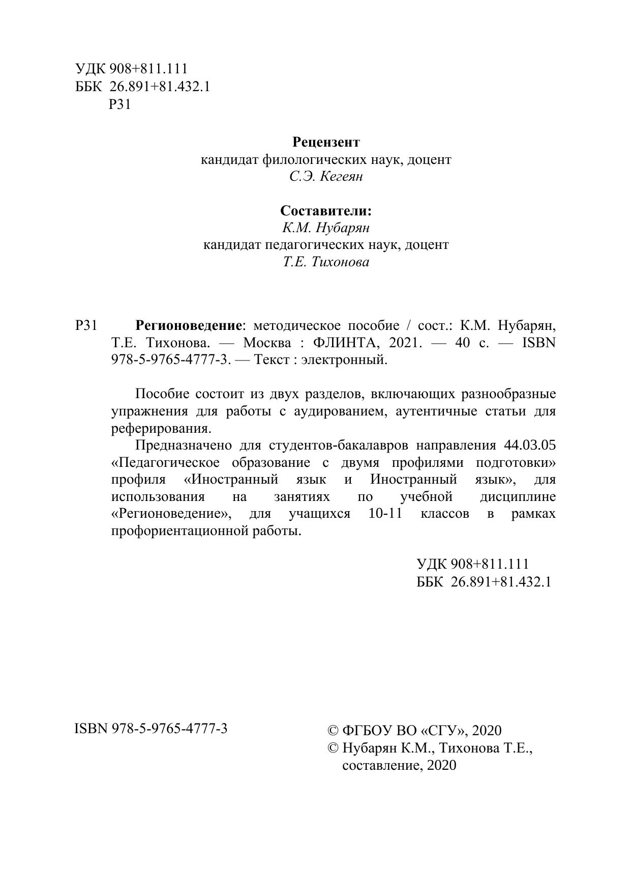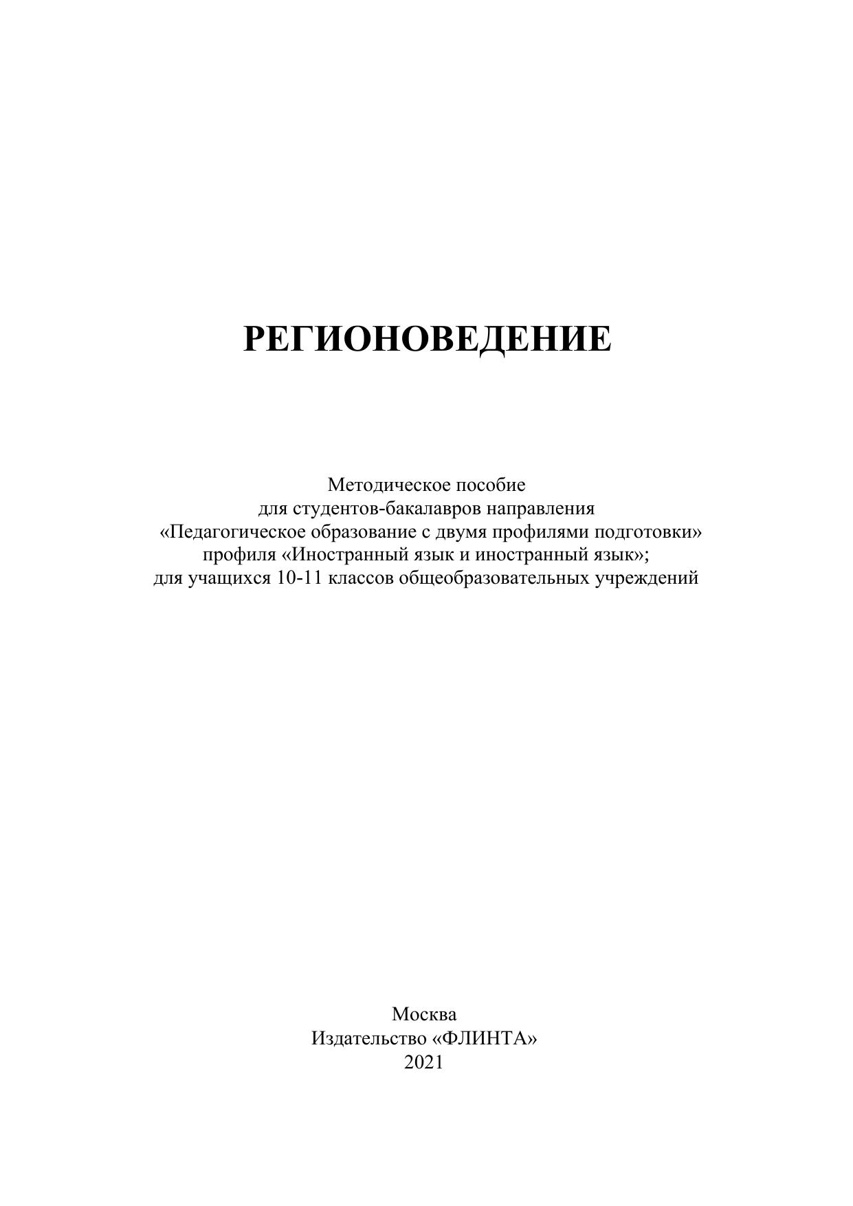 Предназначено для студентов-бакалавров направления 44.03.05 «Педагогическое образование с двумя профилями подготовки» профиля «Иностранный язык и Иностранный язык», для использования на занятиях по учебной дисциплине «Регионоведение», для учащихся 10-11 классов в рамках профориентационной работы.