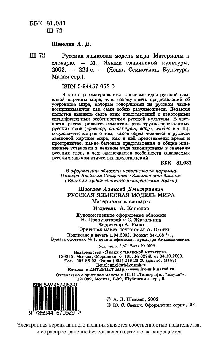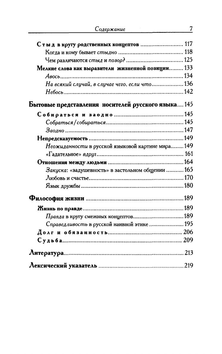 В книге рассматриваются ключевые идеи русской языковой картины мира, т. е. совокупность представлений об устройстве мира, которые говорящими на русском языке воспринимаются как сами собою разумеющиеся. Делается попытка выявить связь этих представлений с некоторыми специфическими особенностями русской культуры. В частности, рассматривается семантика ряда трудно переводимых русских слов ( простор, попрекнуть, вдруг, заодно и т. п.), обсуждается вопрос о том, каков образ человека в русской языковой картине мира, как в ней представлены время и пространство, какие бытовые представления и общие жизненные установки в неявном виде закодированы в значении русских слов, в чем заключаются особенности задаваемых русским языком этических представлений.
