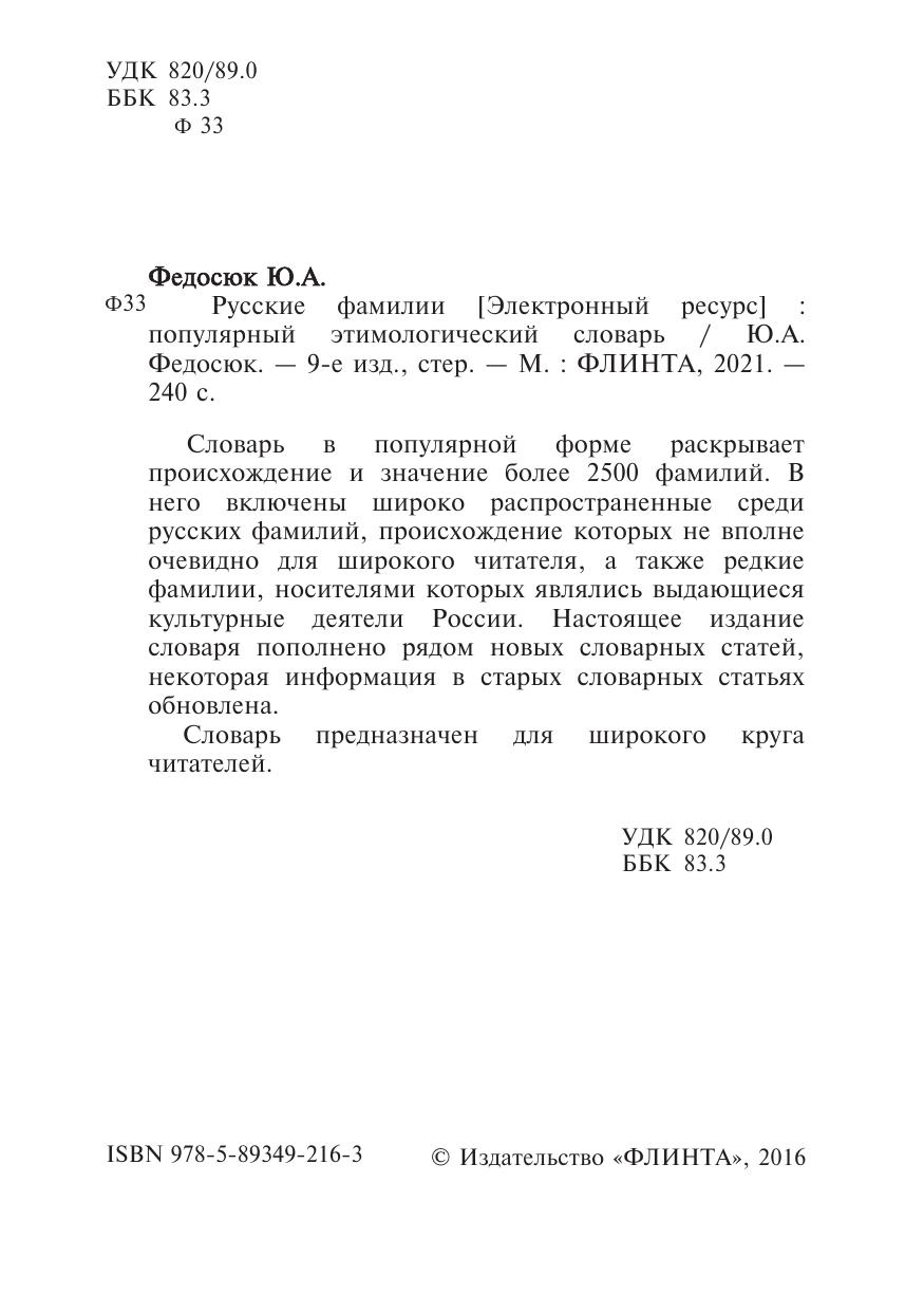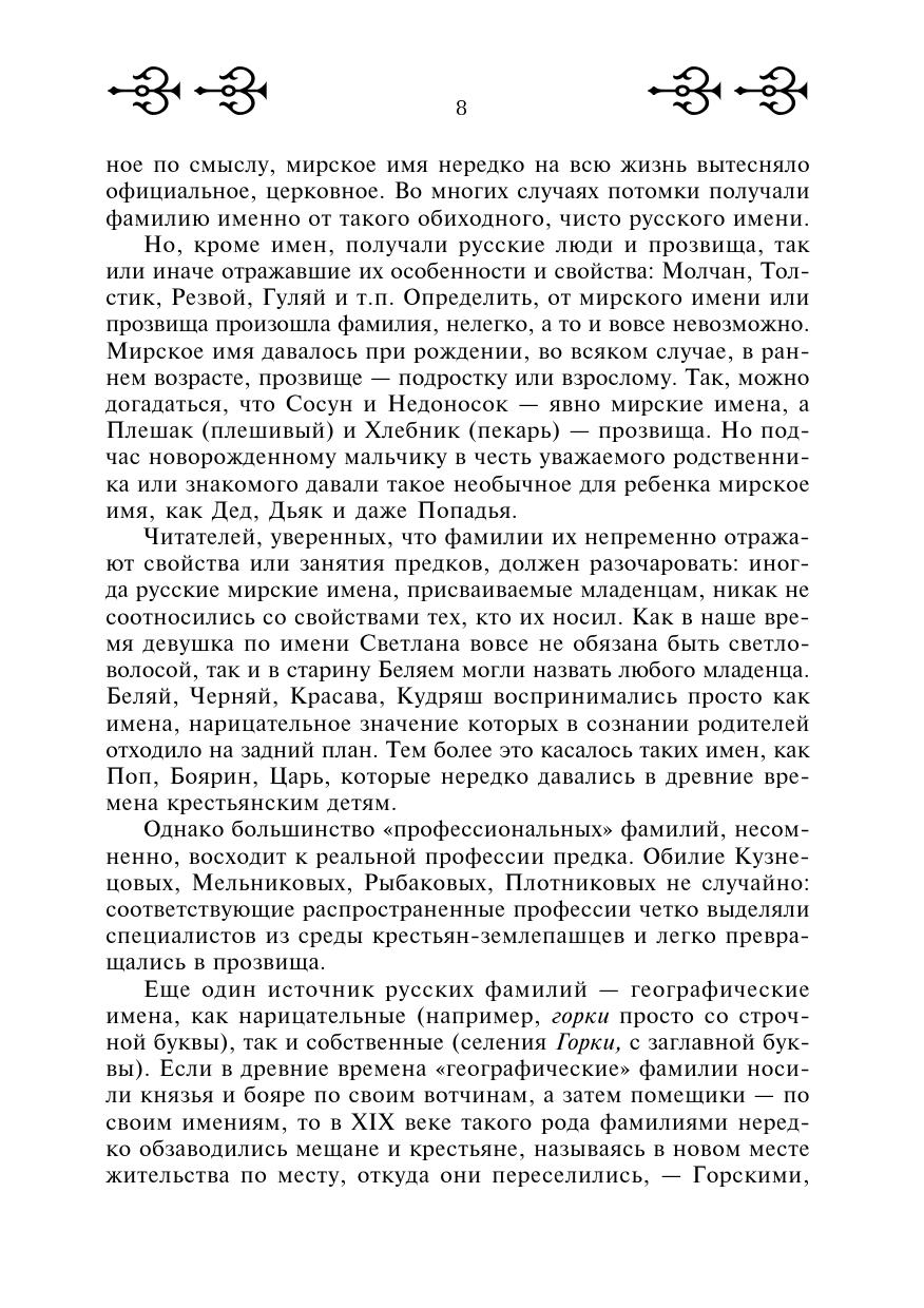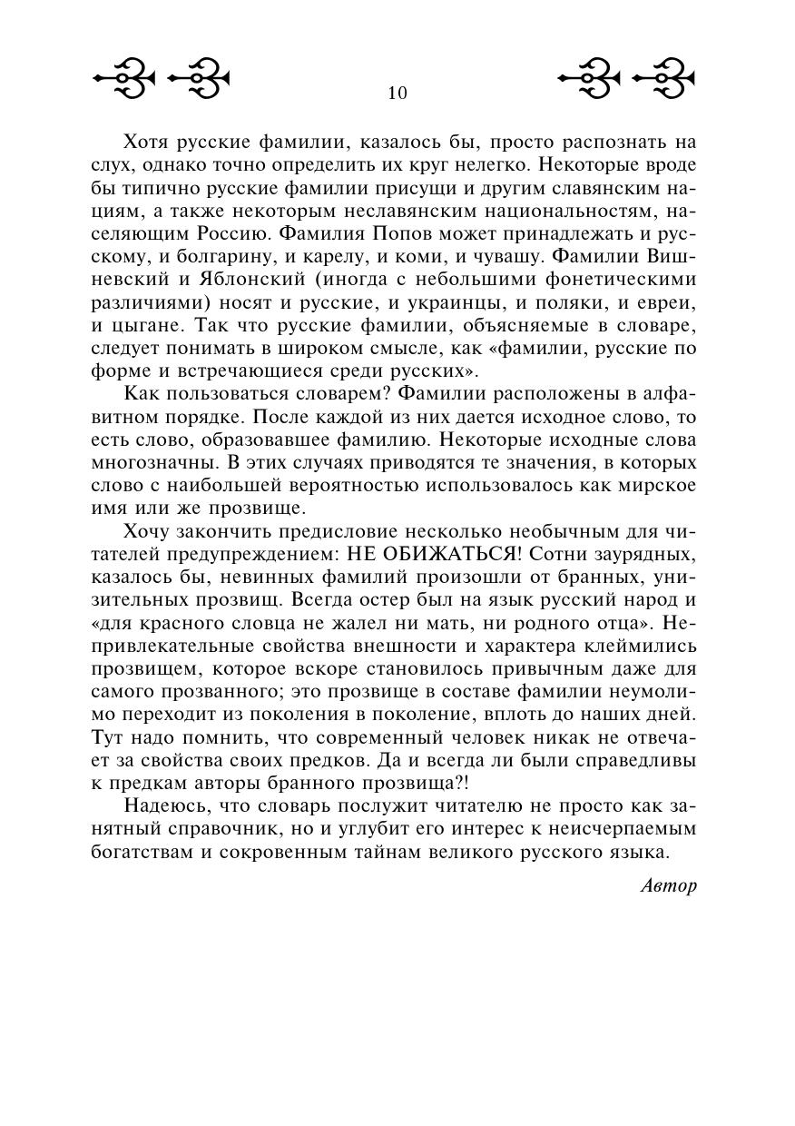 Словарь в популярной форме раскрывает происхождение и значение более 2500 фамилий. В него включены широко распространенные среди русских фамилий, происхождение которых не вполне очевидно для широкого читателя, а также редкие фамилии, носителями которых являлись выдающиеся культурные деятели России. Настоящее издание словаря пополнено рядом новых словарных статей, некоторая информация в старых словарных статьях обновлена.