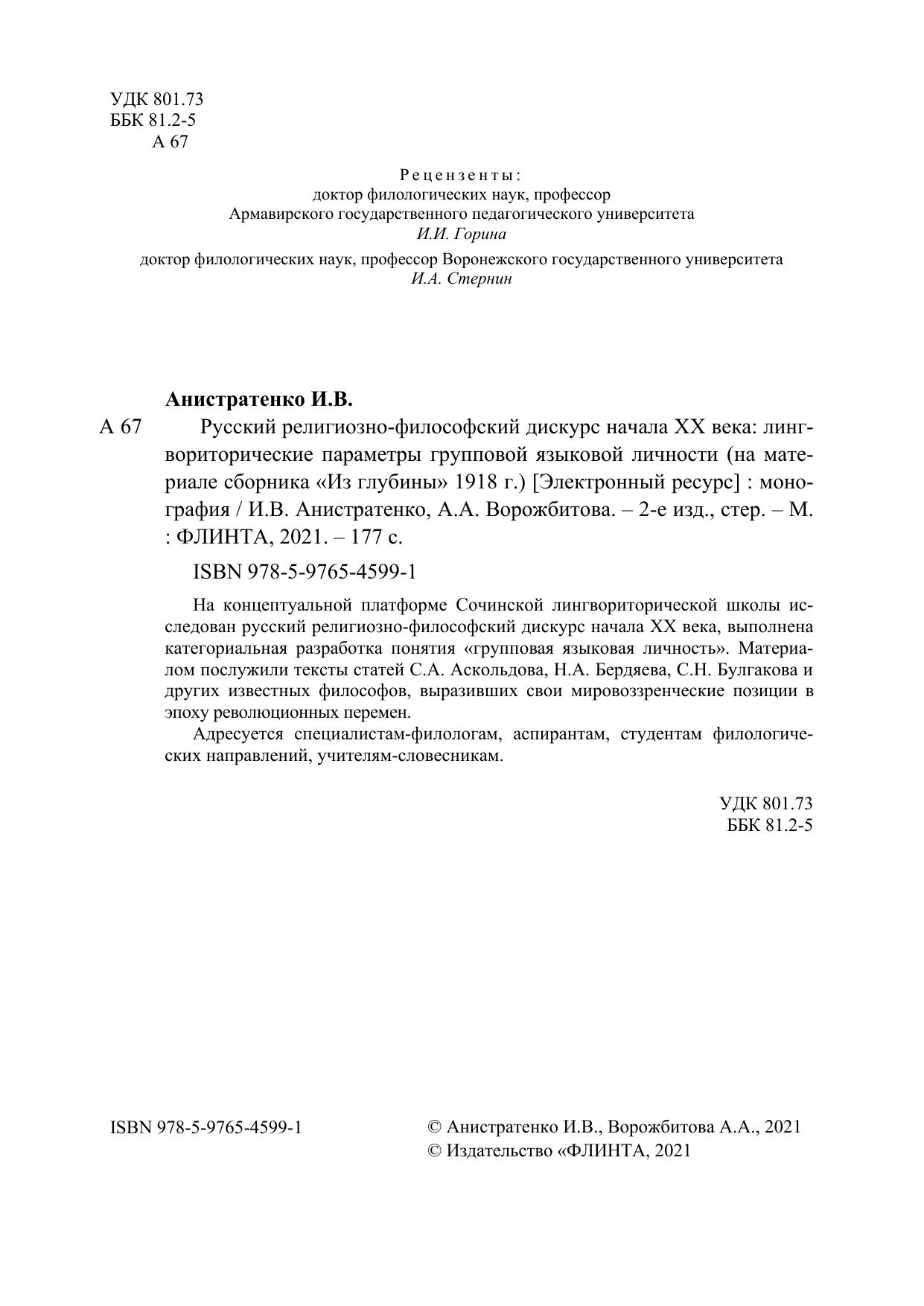 На концептуальной платформе Сочинской лингвориторической школы исследован русский религиозно-философский дискурс начала ХХ века, выполнена категориальная разработка понятия «групповая языковая личность». Материалом послужили тексты статей С.А. Аскольдова, Н.А. Бердяева, С.Н. Булгакова и других известных философов, выразивших свои мировоззренческие позиции в эпоху революционных перемен.