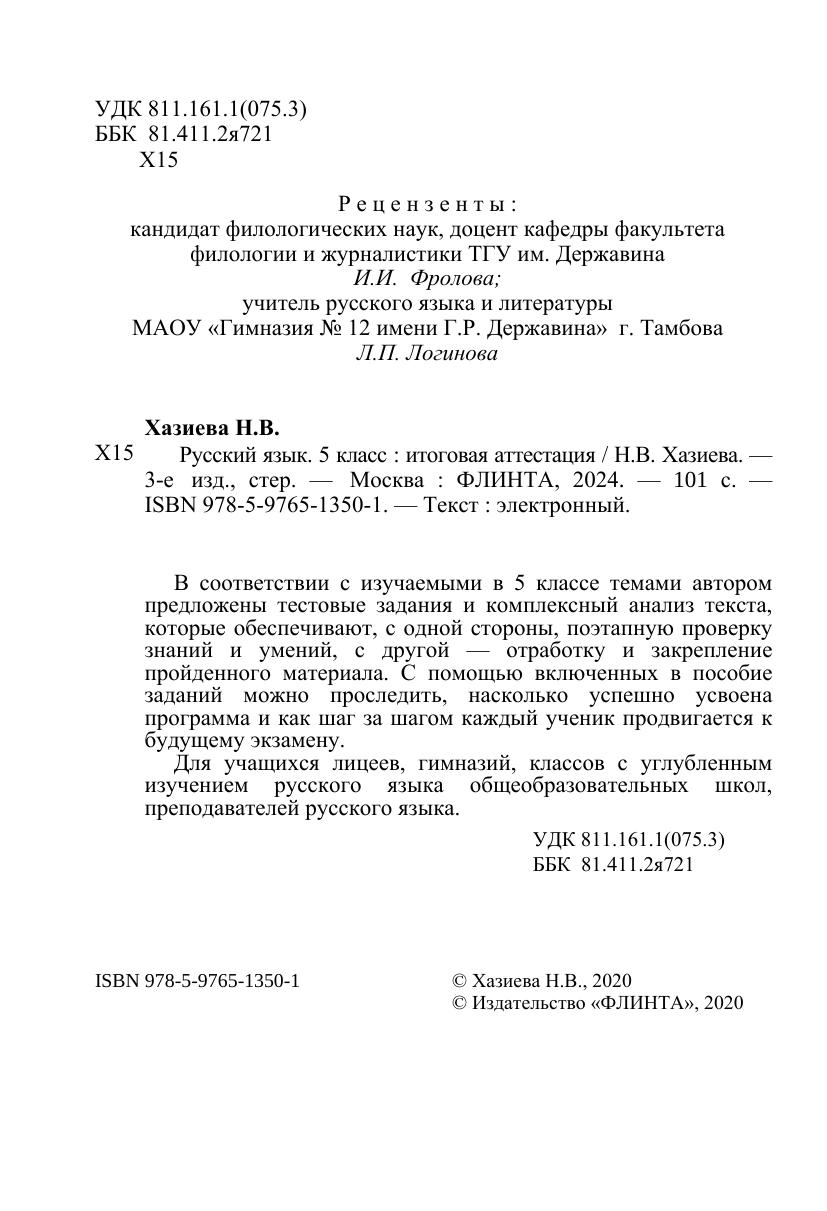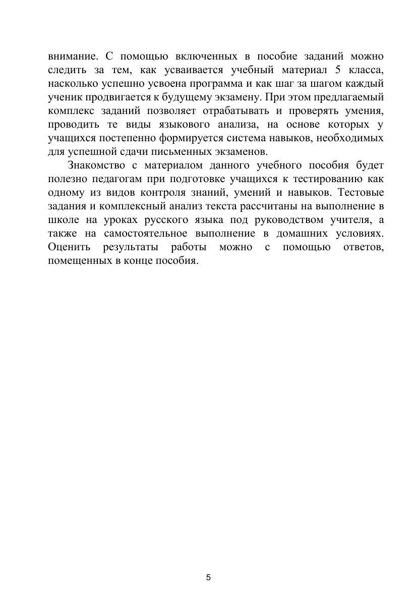 В соответствии с изучаемыми в 5 классе темами автором предложены тестовые задания и комплексный анализ текста,которые обеспечивают, с одной стороны, поэтапную проверку знаний и умений, с другой — отработку и закрепление пройденного материала. С помощью включенных в пособие заданий можно проследить, насколько успешно усвоена программа и как шаг за шагом каждый ученик продвигается к будущему экзамену. Для учащихся лицеев, гимназий, классов с углубленным изучением русского языка общеобразовательных школ, преподавателей русского языка.