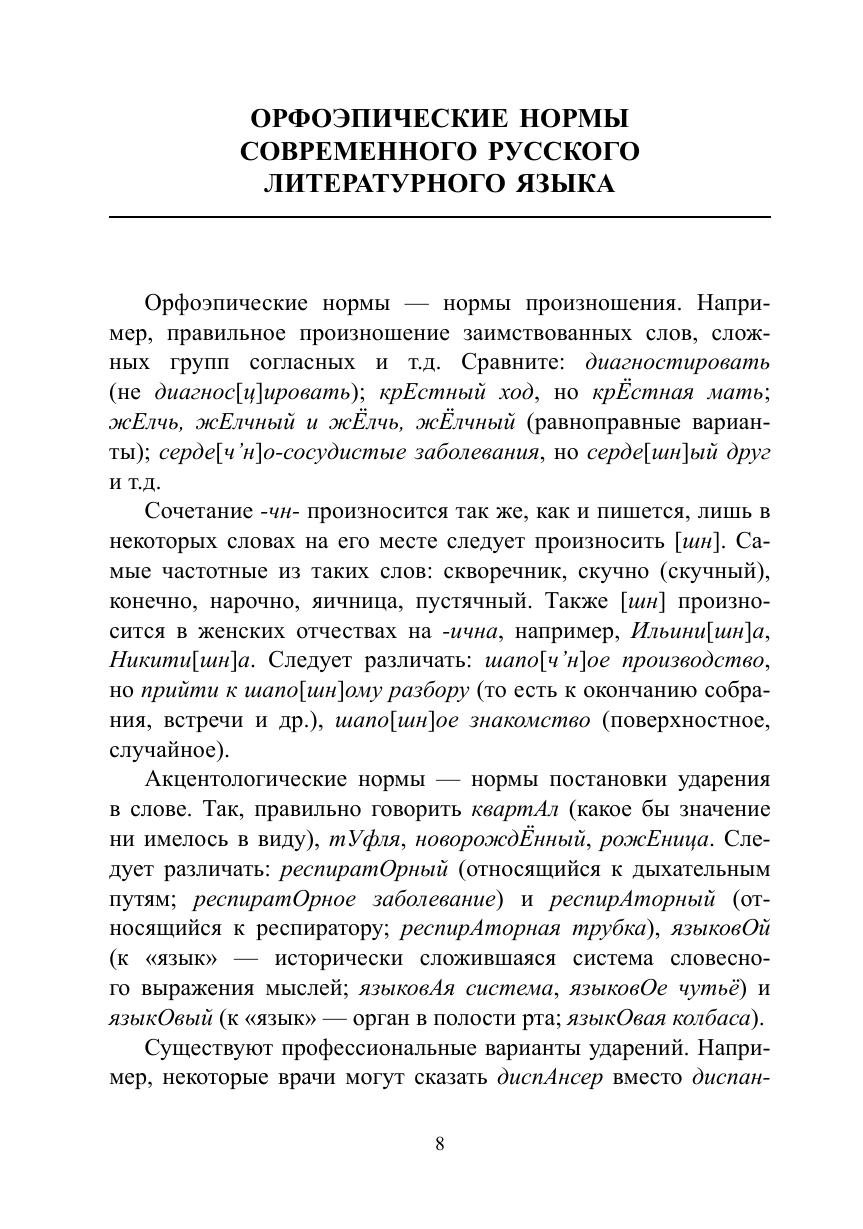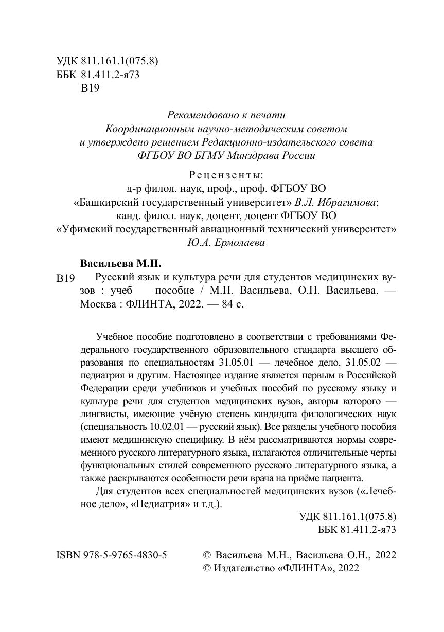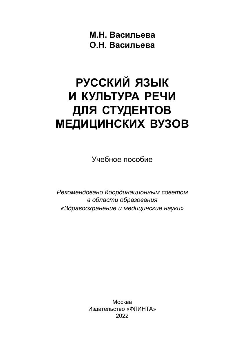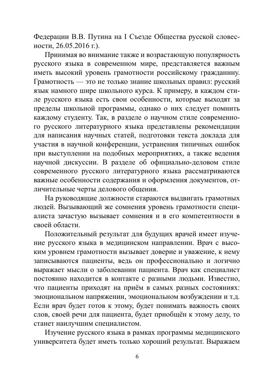 Учебное пособие подготовлено в соответствии с требованиями Федерального государственного образовательного стандарта высшего образования по специальностям 31.05.01 — лечебное дело, 31.05.02 — педиатрия и другим. Настоящее издание является первым в Российской Федерации среди учебников и учебных пособий по русскому языку и культуре речи для студентов медицинских вузов, авторы которого — лингвисты, имеющие учёную степень кандидата филологических наук (специальность 10.02.01 — русский язык). Все разделы учебного пособия имеют медицинскую специфику. В нём рассматриваются нормы современного русского литературного языка, излагаются отличительные черты функциональных стилей современного русского литературного языка, а также раскрываются особенности речи врача на приёме пациента. Для студентов всех специальностей медицинских вузов («Лечебное дело», «Педиатрия» и т.д.).