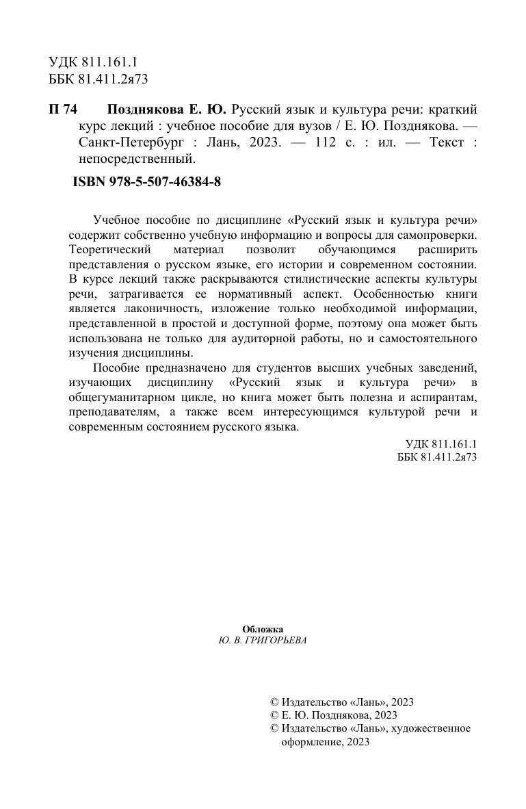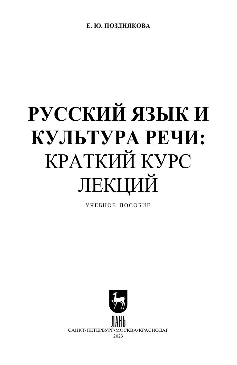 Учебное пособие по дисциплине «Русский язык и культура речи» содержит собственно учебную информацию и вопросы для самопроверки. Теоретический материал позволит обучающимся расширить представления о русском языке, его истории и современном состоянии языка. Также в курсе лекций раскрываются стилистические аспекты культуры речи, затрагивается ее нормативный аспект. Особенностью книги является лаконичность, изложение только необходимой информации, представленной в простой и доступной форме. Поэтому она может быть использована не только для аудиторной работы, но и самостоятельного изучения дисциплины. Пособие предназначено для студентов высших учебных заведений, изучающих дисциплину «Русский язык и культура речи» в общегуманитарном цикле. Но книга может быть полезна и аспирантам, преподавателям, а также всем интересующимся культурой речи и современным состоянием русского языка.