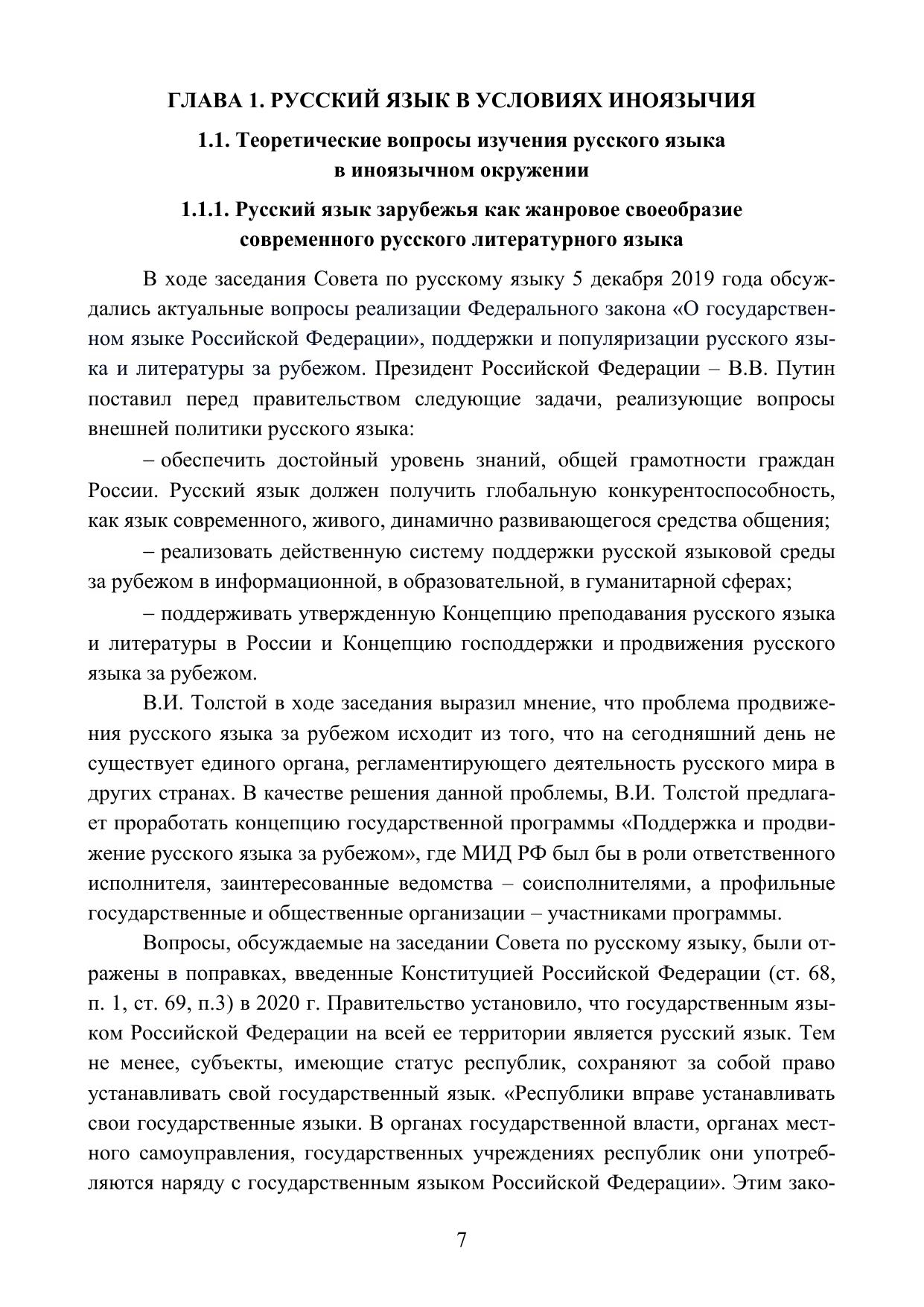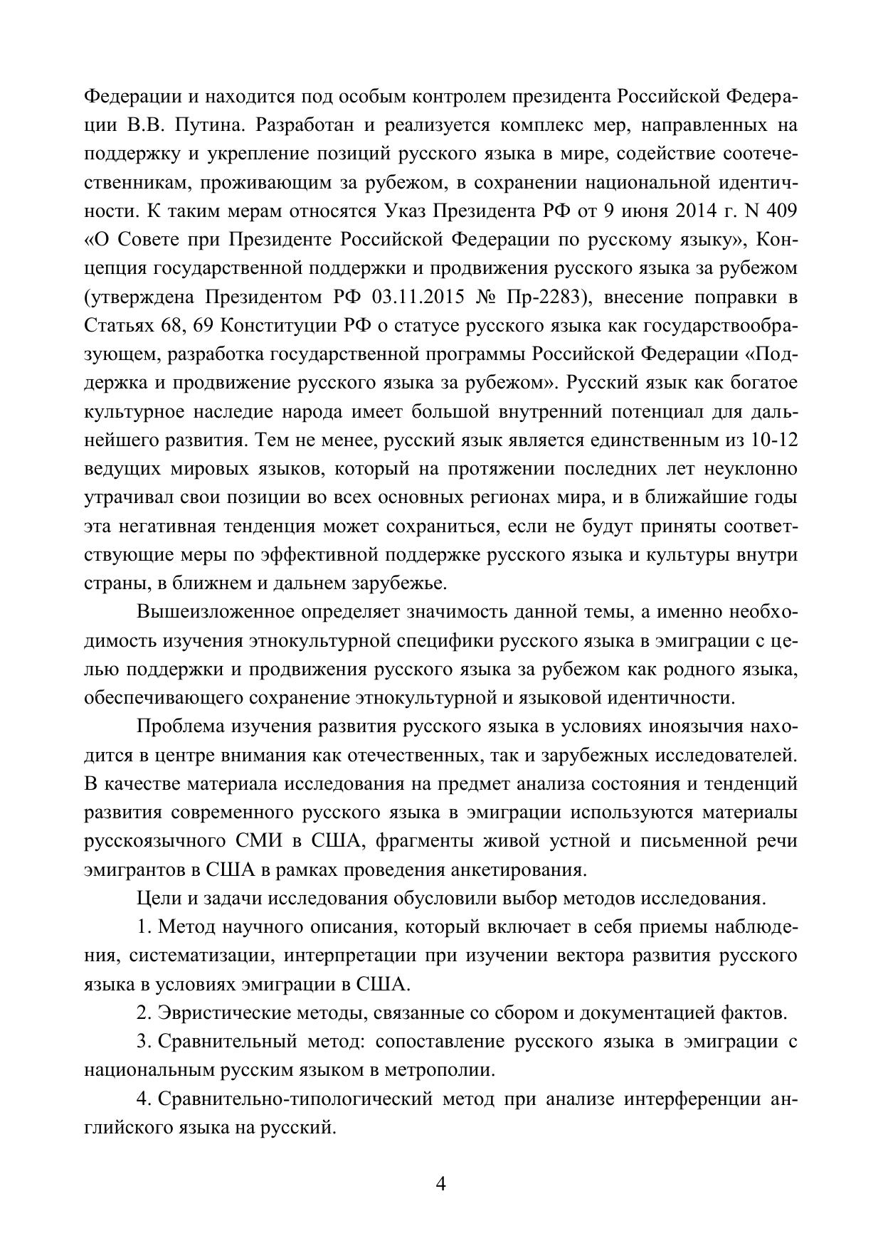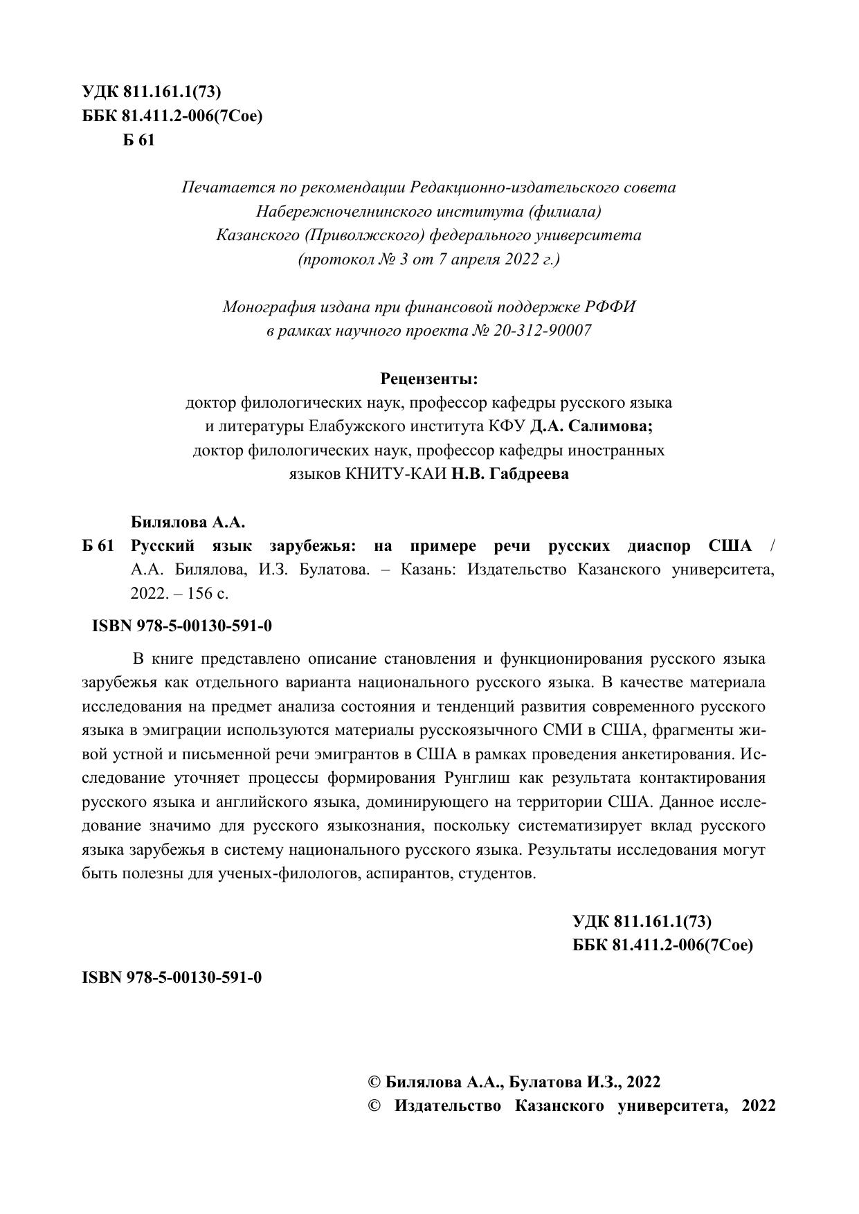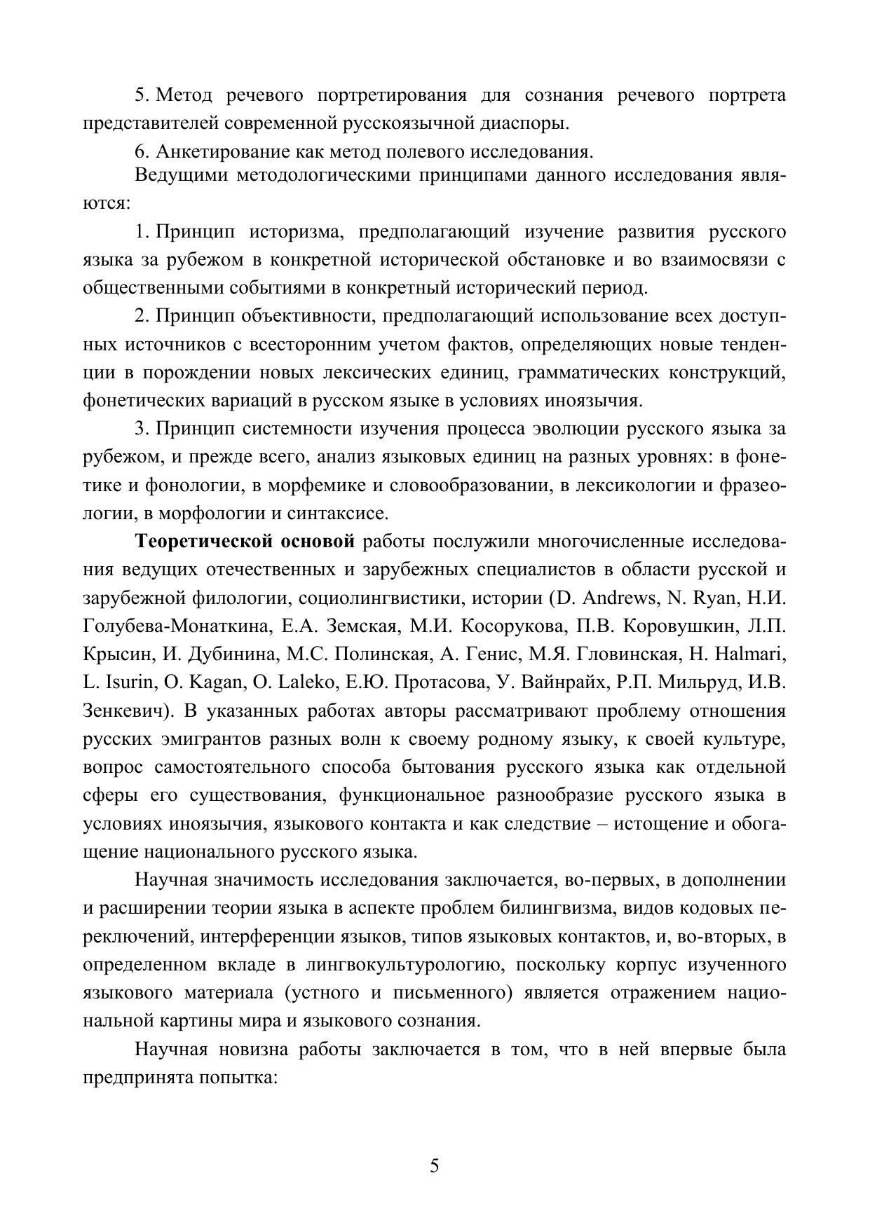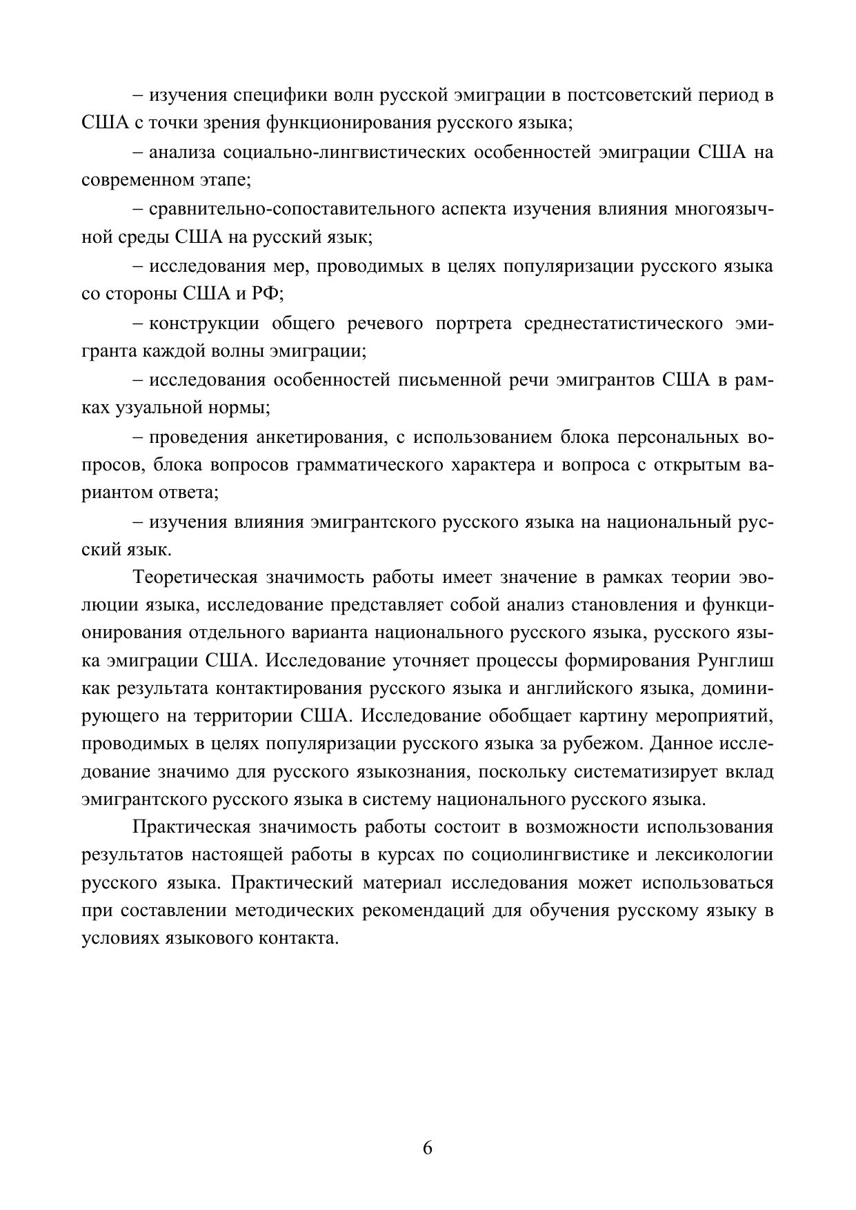 В книге представлено описание становления и функционирования русского языка зарубежья как отдельного варианта национального русского языка. В качестве материала исследования на предмет анализа состояния и тенденций развития современного русского языка в эмиграции используются материалы русскоязычного СМИ в США, фрагменты живой устной и письменной речи эмигрантов в США в рамках проведения анкетирования. Исследование уточняет процессы формирования Рунглиш как результата контактирования русского языка и английского языка, доминирующего на территории США. Данное исследование значимо для русского языкознания, поскольку систематизирует вклад русского языка зарубежья в систему национального русского языка. Результаты исследования могут быть полезны для ученых филологов, аспирантов, студентов.