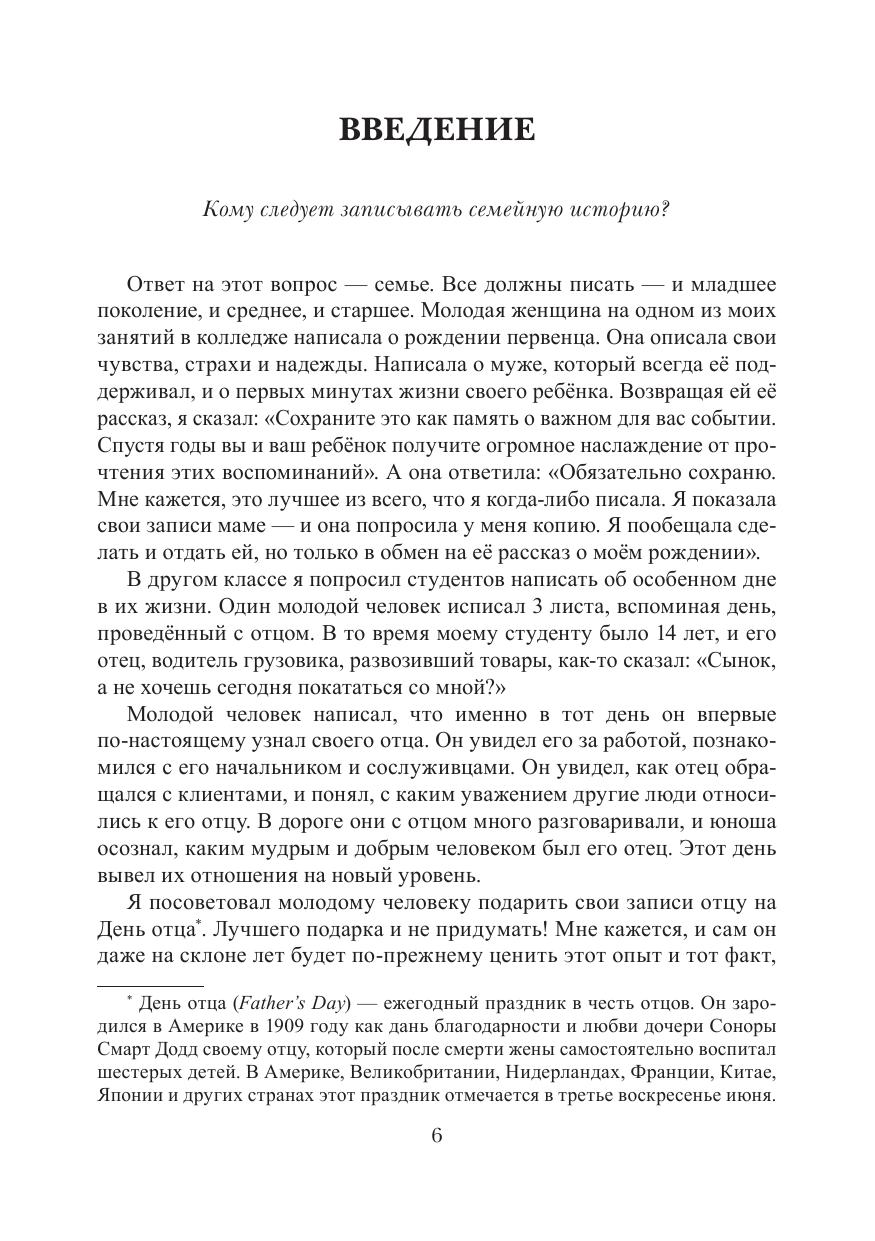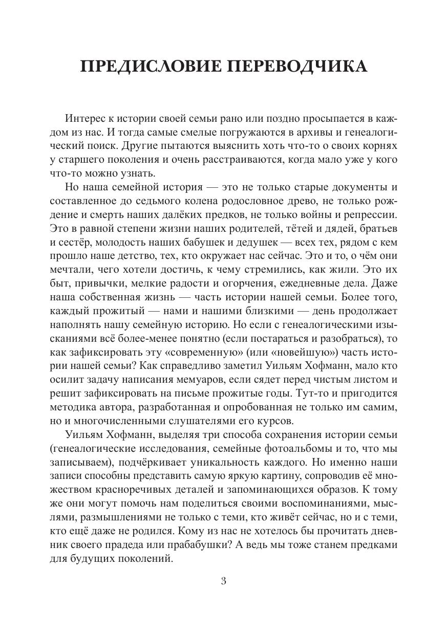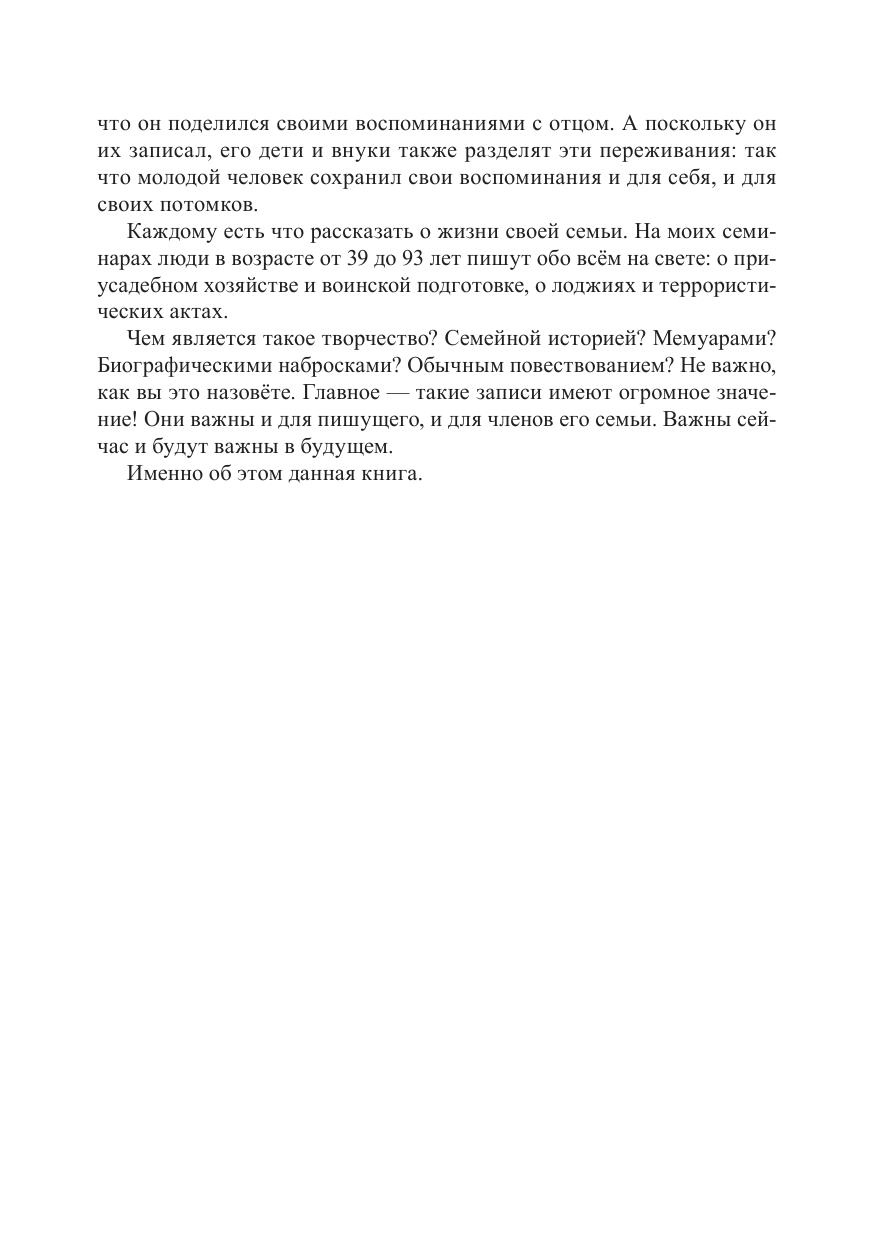 Книга Уильяма Хофманна — американского преподавателя словесности — содержит описание авторского метода фиксации и сохранения личной истории человека. Он пишет о том, как много хранит наша память, о том, как ценны и в то же время недолговечны наши воспоминания. Если, конечно, их не записать. Но как сделать так, чтобы этот процесс — написание текстов, историй своей жизни — оказался посильным каждому? Именно об этом рассказано (и показано на прекрасных примерах) в его книге. Уильям Хофманн предлагает простые способы, приводит множество примеров, высказывает интересные и вдохновляющие мысли, помогает своими наблюдениями и подсказками — и всё это, чтобы помочь нам сохранить самую ценную историю — историю нашей семьи.
