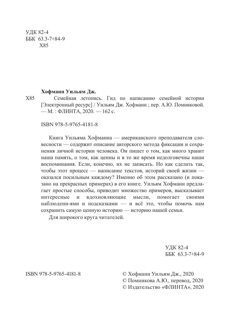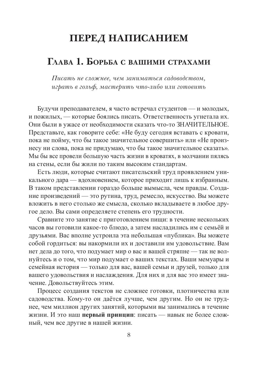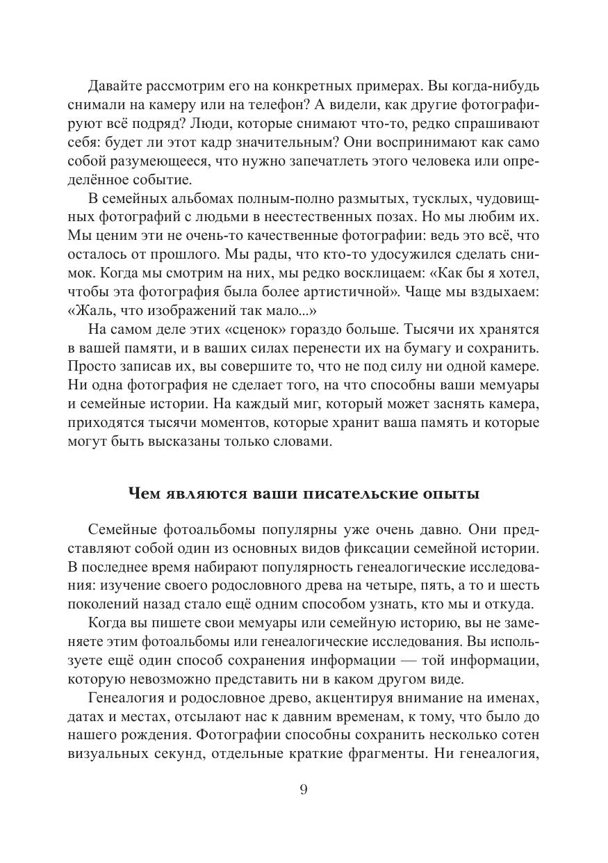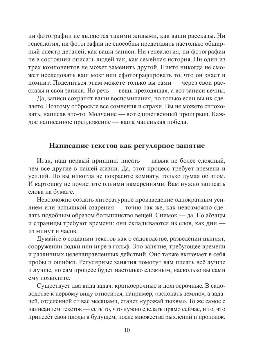 Книга Уильяма Хофманна — американского преподавателя словесности — содержит описание авторского метода фиксации и сохранения личной истории человека. Он пишет о том, как много хранит наша память, о том, как ценны и в то же время недолговечны наши воспоминания. Если, конечно, их не записать. Но как сделать так, чтобы этот процесс — написание текстов, историй своей жизни — оказался посильным каждому? Именно об этом рассказано (и показано на прекрасных примерах) в его книге. Уильям Хофманн предлагает простые способы, приводит множество примеров, высказывает интересные и вдохновляющие мысли, помогает своими наблюдениями и подсказками — и всё это, чтобы помочь нам сохранить самую ценную историю — историю нашей семьи.