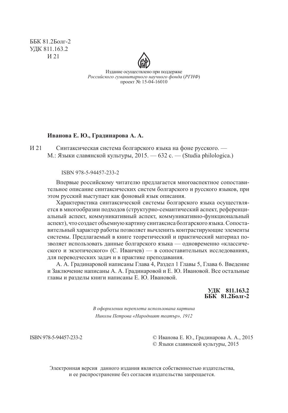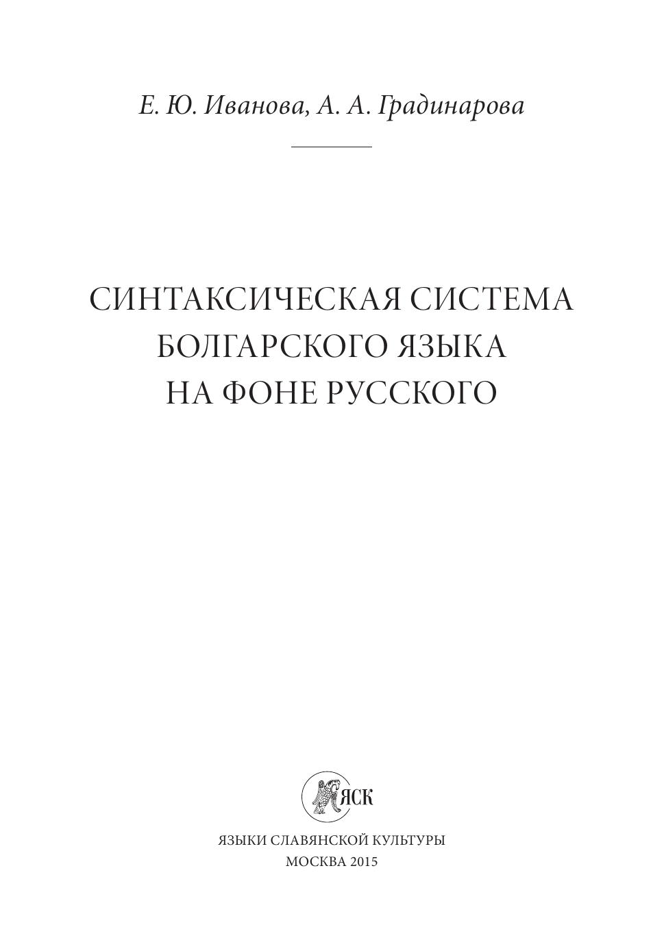 Впервые российскому читателю предлагается многоаспектное сопоставительное описание синтаксических систем болгарского и русского языков, при этом русский выступает как фоновый язык описания. Характеристика синтаксической системы болгарского языка осуществляется в многообразии подходов (структурно-семантический аспект, референциальный аспект, коммуникативный аспект, коммуникативно-функциональный аспект), что создает объемную картину синтаксиса болгарского языка. Сопоставительный характер работы позволяет вычленить контрастирующие элементы системы. Предлагаемый в книге теоретический и практический материал позволяет использовать данные болгарского языка — одновременно «классического и экзотического» (С. Иванчев) — в сопоставительных исследованиях, для переводческих задач и в практике преподавания. А.А. Градинаровой написаны Глава 4, Раздел 1 Главы 5, Глава 6. Введение и Заключение написаны А.А. Градинаровой и Е.Ю. Ивановой. Все остальные главы и разделы книги написаны Е.Ю. Ивановой.