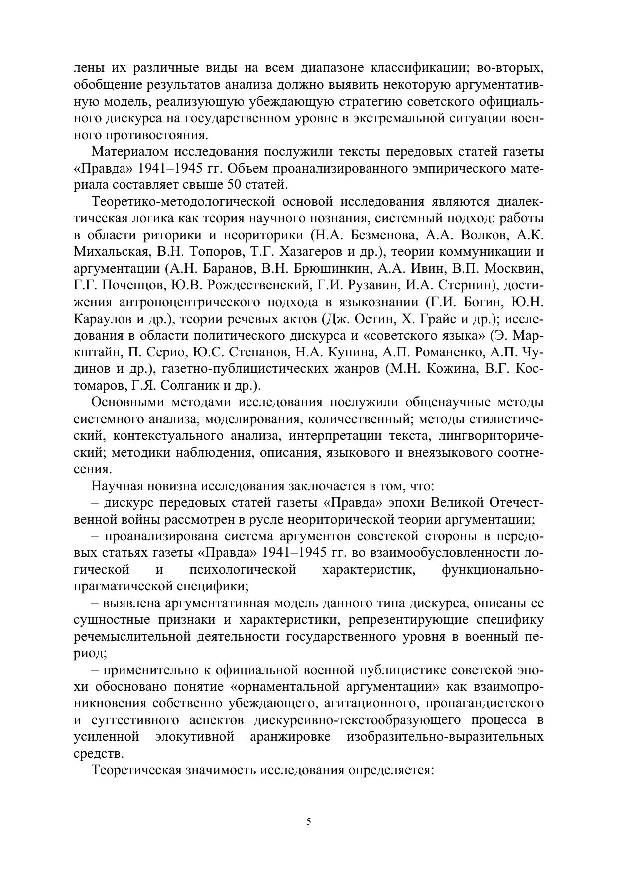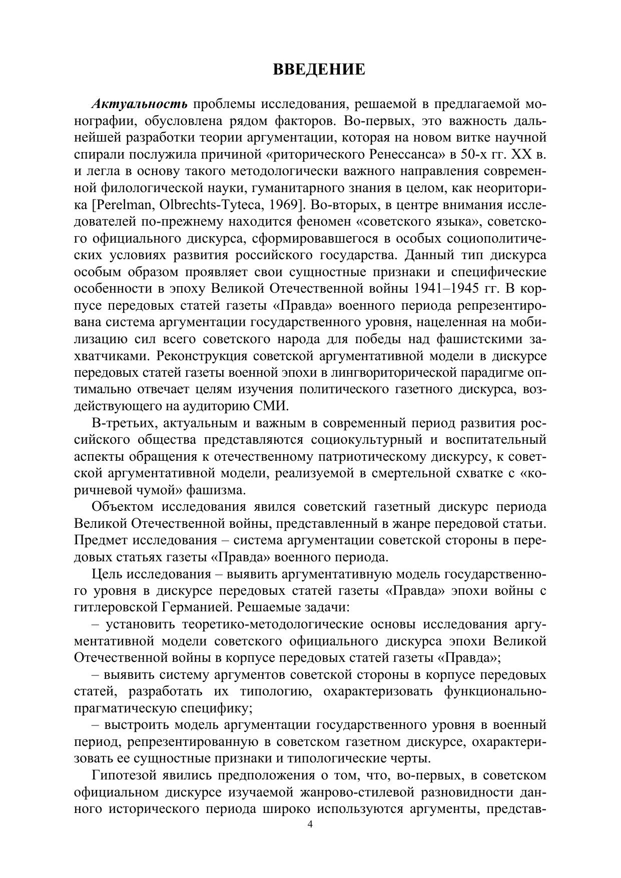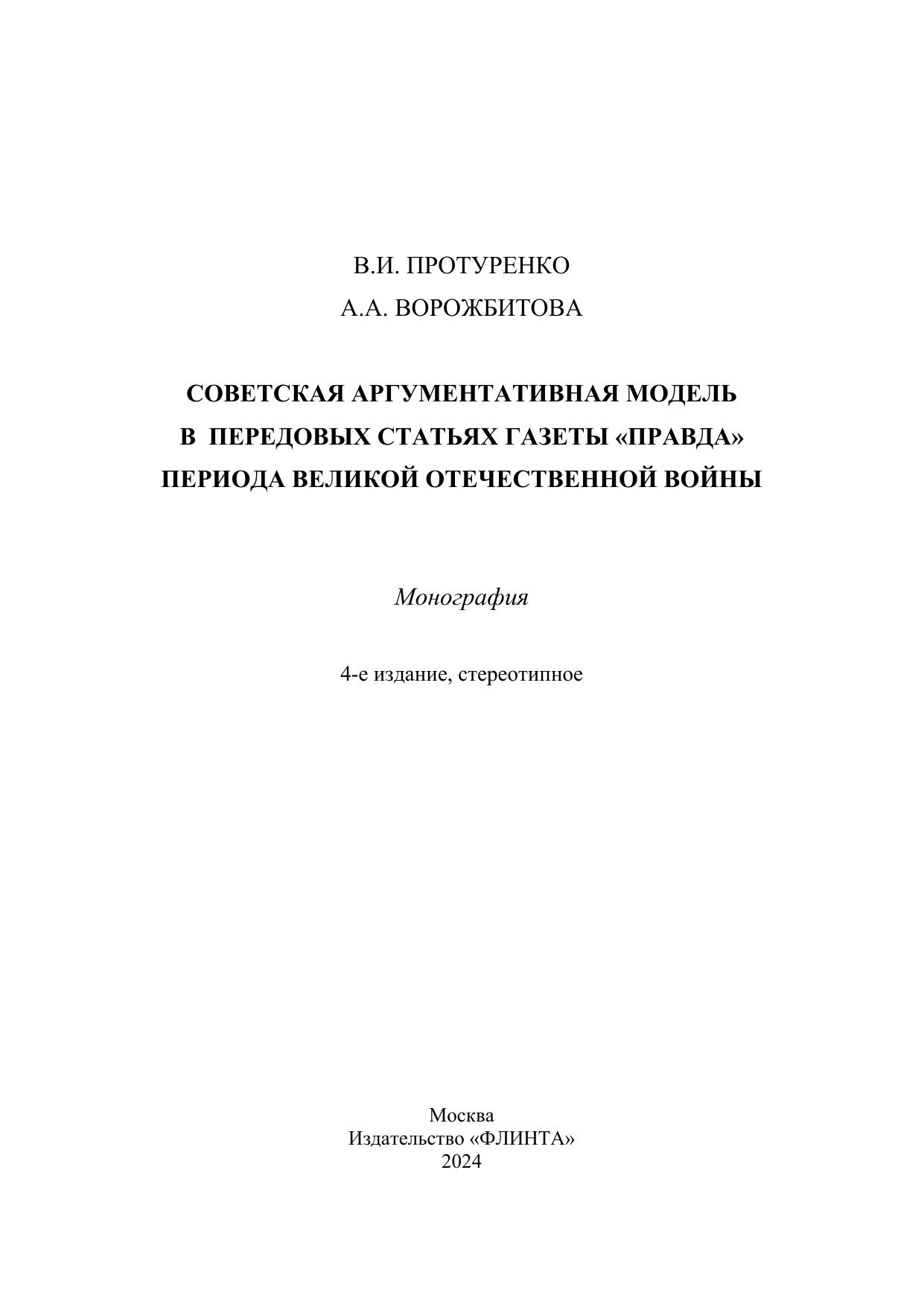 Изложены результаты исследования на комплексной основе научных координат лингвориторической парадигмы системы аргументации, репрезентированной советским официальным дискурсом эпохи Великой Отечественной войны 1941–1945 гг. в текстовом массиве передовых статей газеты «Правда». Адресуется специалистам-филологам, студентам, аспирантам, преподавателям гуманитарных дисциплин.