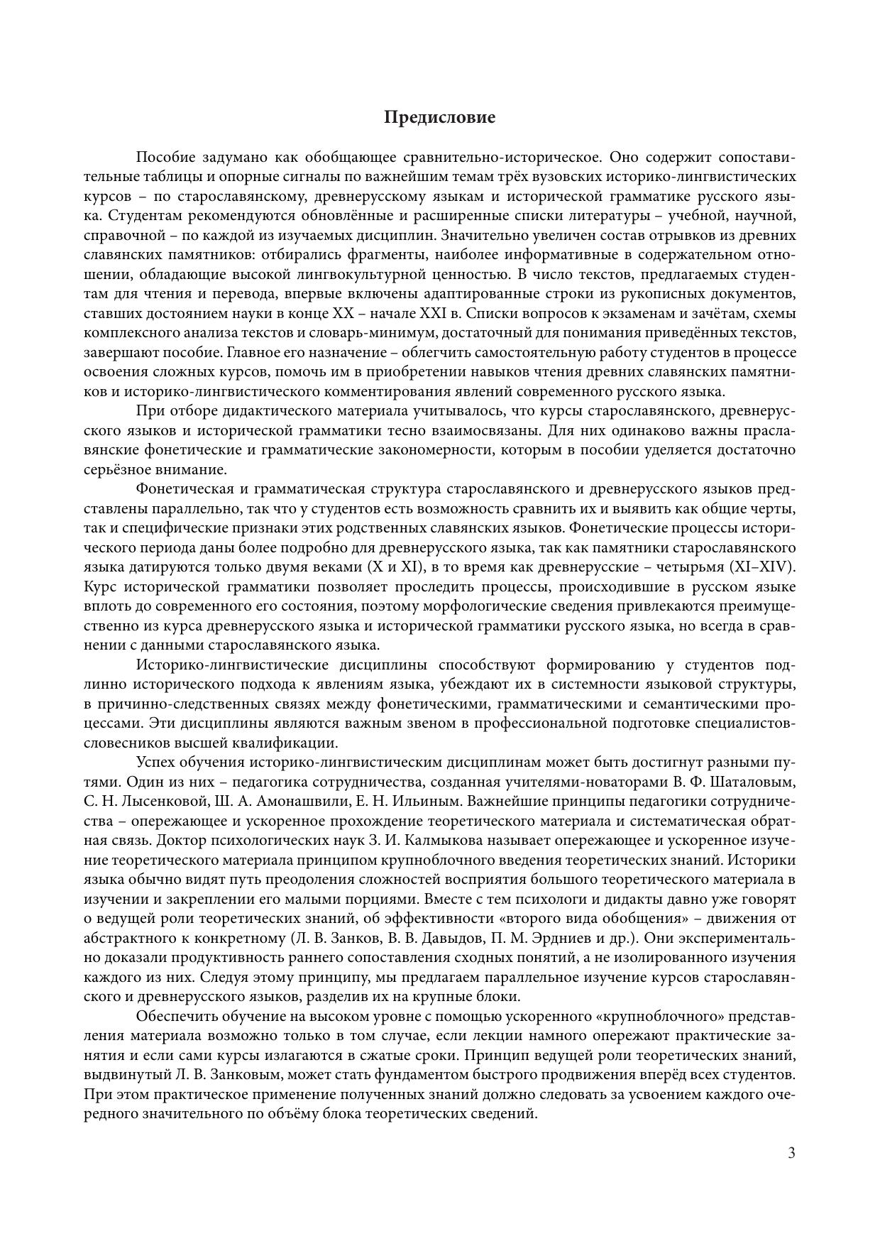 Пособие является вводным, предваряющим выпуск методических рекомендаций и заданий к контрольным работам по историко-лингвистическим дисциплинам. Выполненное в сопоставительном ключе, оно содержит опорные сигналы к основным темам курсов старославянского языка, древнерусского языка и исторической грамматики русского языка, отрывки из старославянских и древнерусских памятников, вопросники к экзаменам и зачётам, обобщающие таблицы, схемы фонетического и грамматического анализа древних текстов, словарь, списки основной, дополнительной и справочной литературы. Для студентов очных и заочных отделений высших учебных заведений, изучающих древние славянские языки и историю русского язык