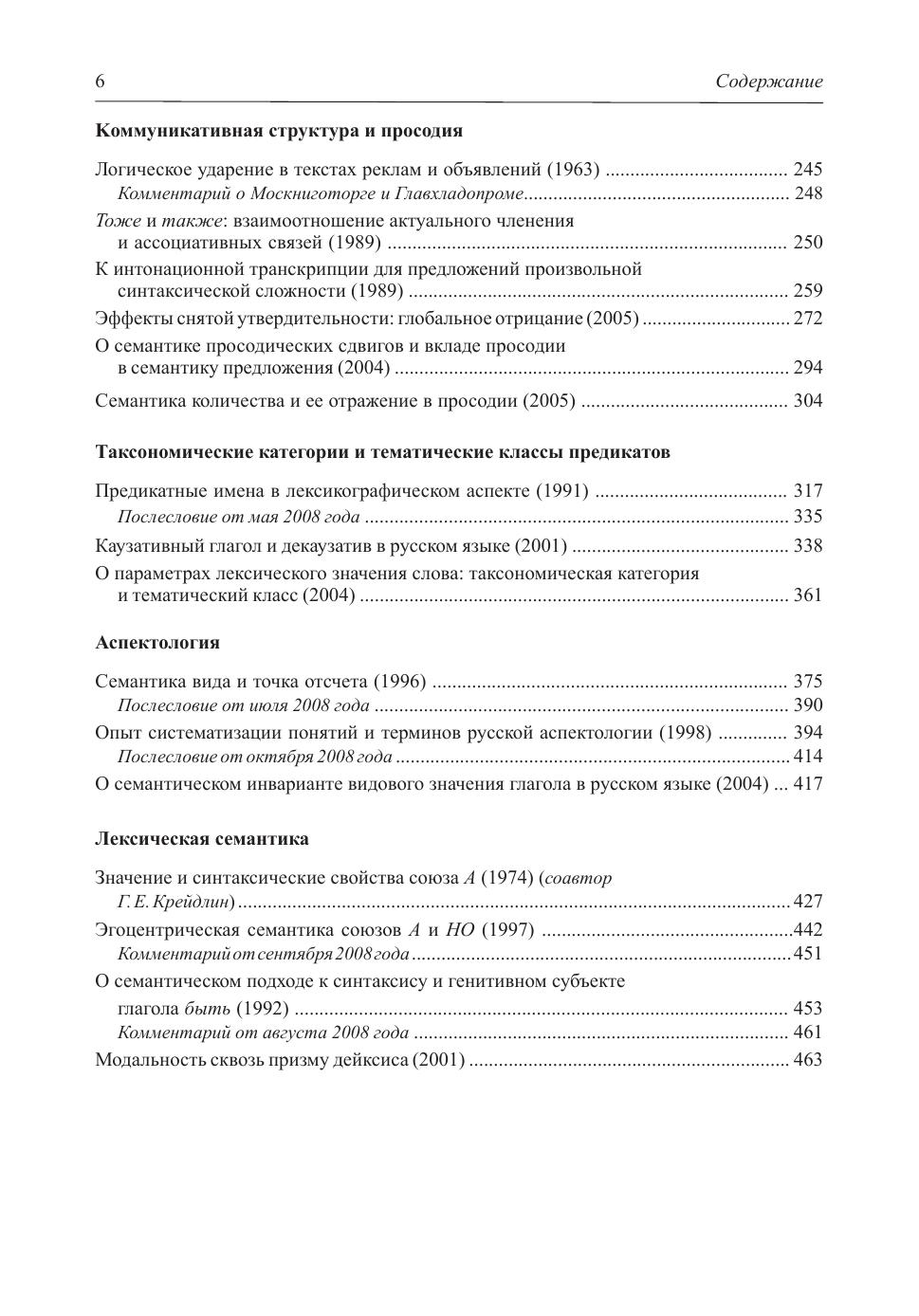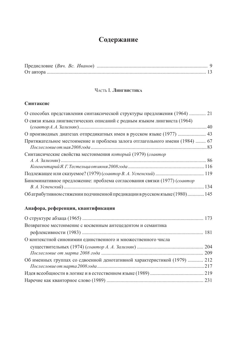 В книге собраны статьи, написанные в разное время (начиная с 1957 года и кончая 2005-м) и посвященные разным темам - синтаксису, референции и анафоре, коммуникативной структуре предложения и просодии, грамматической семантике, в частности аспектологии, лексической семантике - в том числе таксономическим категориям и тематическим классам слов, структурной поэтике и семиотике. В книге представлены разные жанры - не только научные статьи, но и отчеты о конференциях, обзоры, рецензии, предисловия.