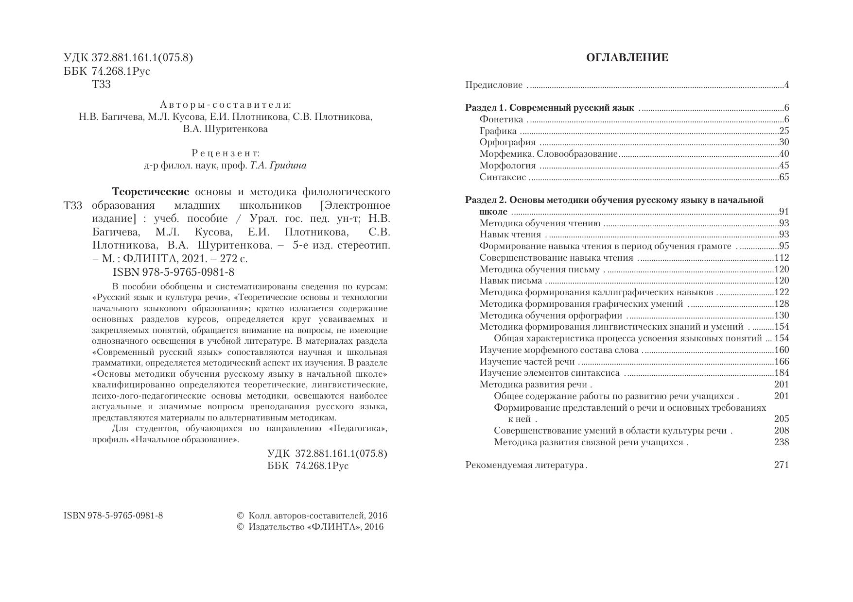 В пособии обобщены и систематизированы сведения по курсам: «Русский язык и культура речи», «Теоретические основы и технологии начального языкового образования»; кратко излагается содержание основных разделов курсов, определяется круг усваиваемых и закрепляемых понятий, обращается внимание на вопросы, не имеющие однозначного освещения в учебной литературе. В материалах раздела «Современный русский язык» сопоставляются научная и школьная грамматики, определяется методический аспект их изуче ния. В разделе «Основы методики обучения русскому языку в начальной школе» квалифицированно определяются теоретические, лингвистические, психо-лого-педагогические основы методики, освещаются наиболее актуальные и значимые вопросы преподавания русского языка, представляются материалы по альтернативным методикам.