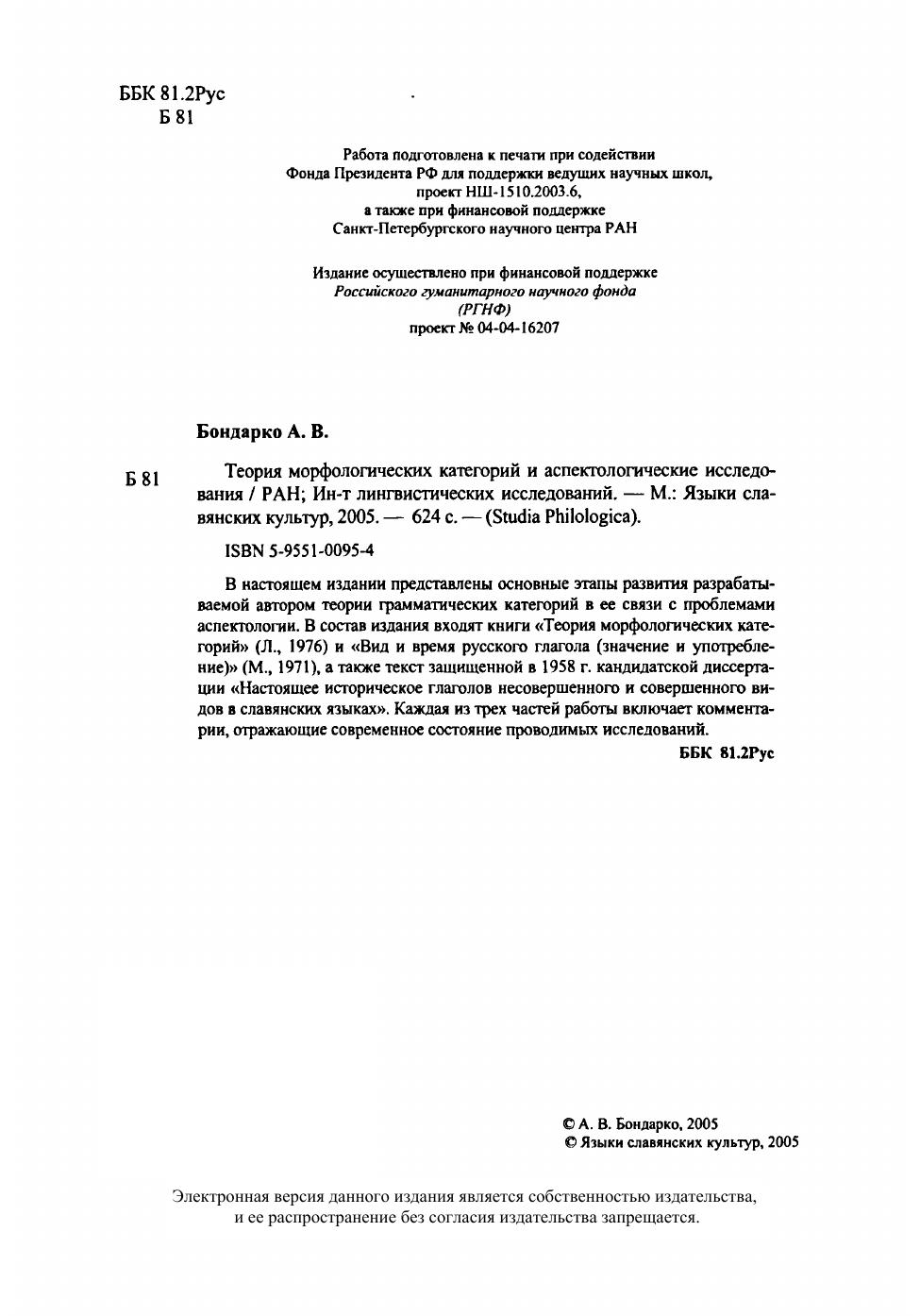 В настоящем издании представлены основные этапы развития разрабатываемой автором теории грамматических категорий в ее связи с проблемами аспектологии. В состав издания входят книги "Теория морфологических категорий" (Л., 1976) и "Вид и время русского глагола (значение и употребление)" (М., 1971), а также текст защищенной в 1958 г. кандидатской диссертации "Настоящее историческое глаголов несовершенного и совершенного видов в славянских языках". Каждая из трех частей работы включает комментарии, отражающие современное состояние проводимых исследований. Для научных работников, широкого круга специалистов.