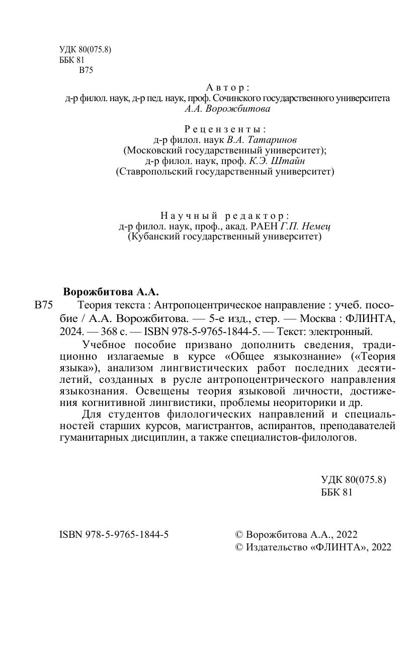 Учебное пособие призвано дополнить сведения, традиционно излагаемые в курсе «Общее языкознание» («Теория языка»), анализом лингвистических работ последних десятилетий, созданных в русле антропоцентрического направления языкознания. Освещены теория языковой личности, достижения когнитивной лингвистики, проблемы неориторики и др. Для студентов филологических направлений и специальностей старших курсов, магистрантов, аспирантов, преподавателей гуманитарных дисциплин, а также специалистов-филологов.