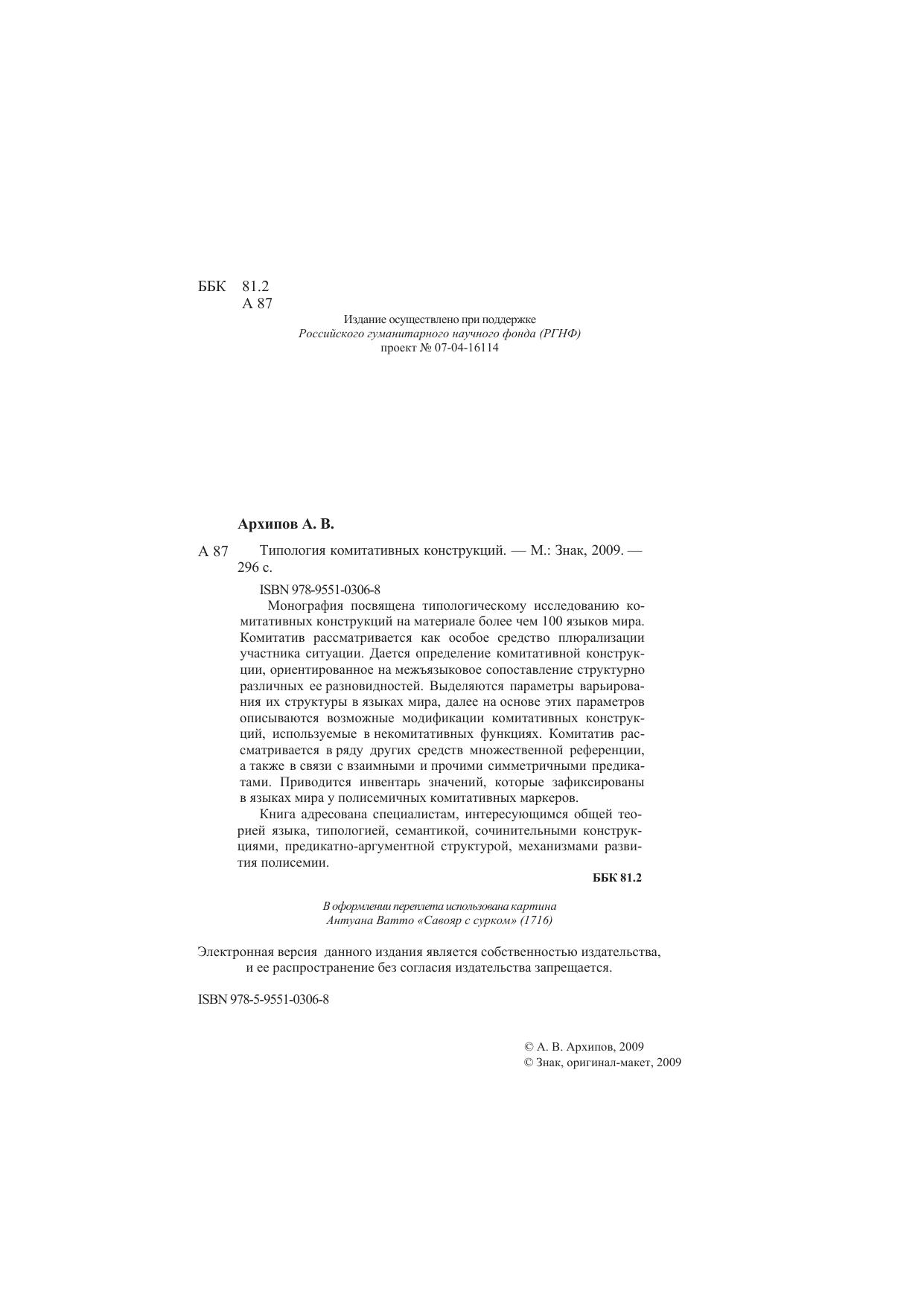 Монография посвящена типологическому исследованию комитативных конструкций на материале более чем 100 языков мира. Комитатив рассматривается как особое средство плюрализации участника ситуации. Дается определение комитативной конструкции, ориентированное на межъязыковое сопоставление структурно различных ее разновидностей. Выделяются параметры варьирования их структуры в языках мира, далее на основе этих параметров описываются возможные модификации комитативных конструкций, используемые в некомитативных функциях. Комитатив рассматривается в ряду других средств множественной референции, а также в связи с взаимными и прочими симметричными предикатами. Приводится инвентарь значений, которые зафиксированы в языках мира у полисемичных комитативных маркеров. Книга адресована специалистам, интересующимся общей теорией языка, типологией, семантикой, сочинительными конструкциями, предикатно-аргументной структурой, механизмами развития полисемии.