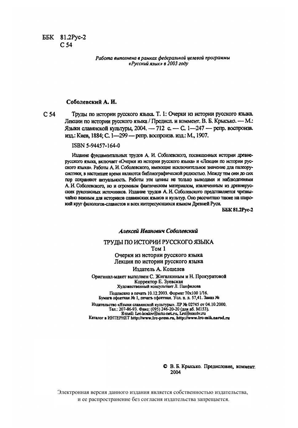 Издание фундаментальных трудов А. И. Соболевского, посвященных истории древнерусского языка, включает «Очерки из истории русского языка» и «Лекции по истории русского языка». Работы А. И. Соболевского, имеющие исключительное значение для палеорусистики, в настоящее время являются библиографической редкостью. Между тем они до сих пор сохраняют актуальность. Работы эти ценны не только выводами и наблюдениями А. И. Соболевского, но и огромным фактическим материалом, извлеченным из древнерусских рукописных источников. Издание трудов А. И. Соболевского представляется чрезвычайно важным для историков славянских языков и культур. Оно рассчитано также на широкий круг филологов-славистов и всех интересующихся языком Древней Руси.