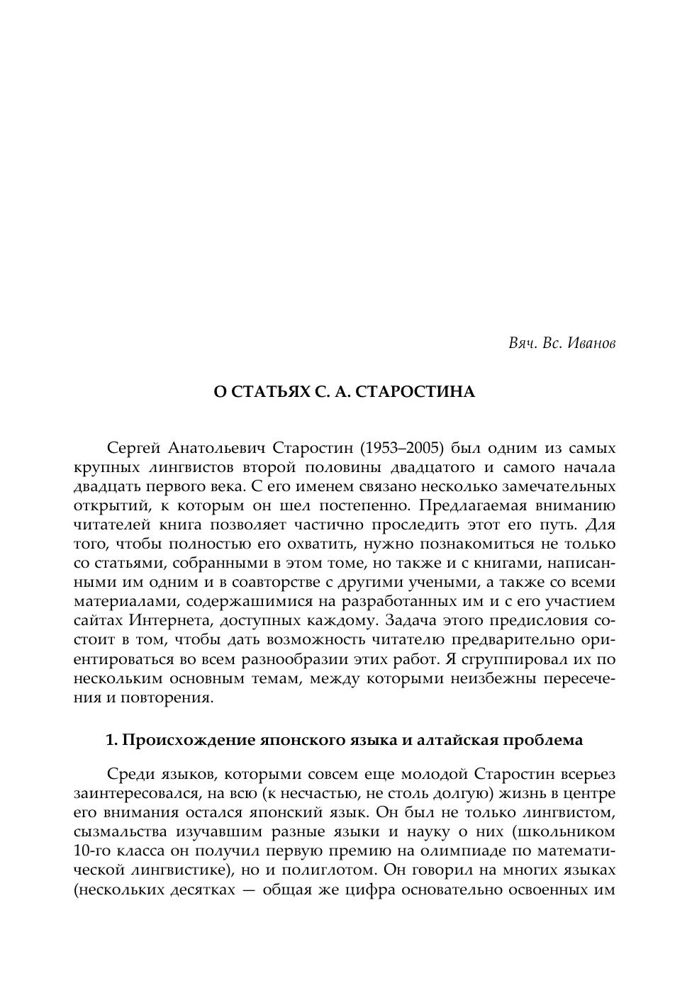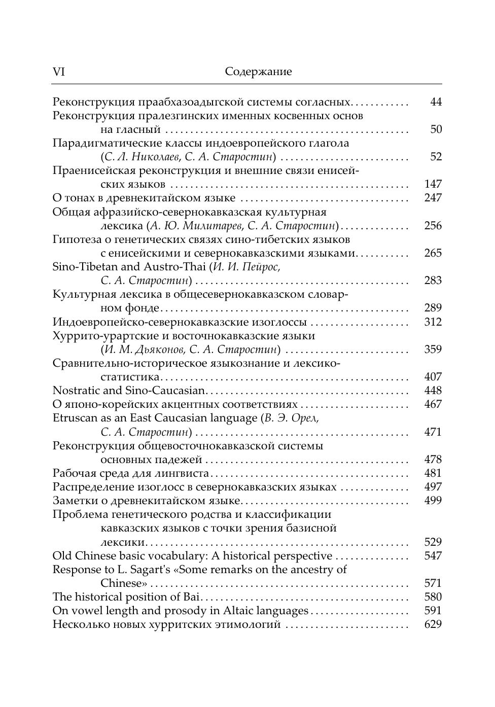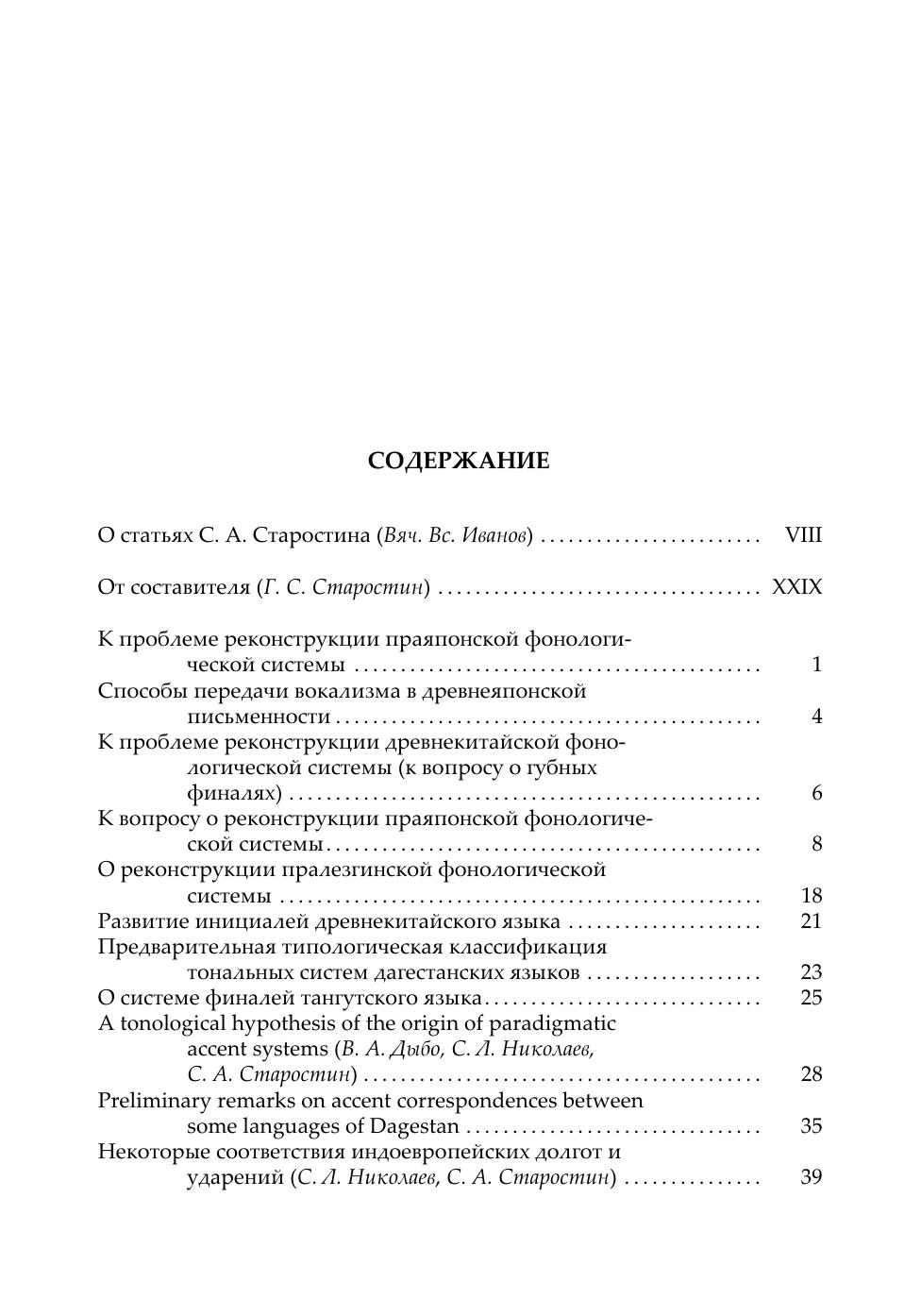 В данном издании трудов Сергея Анатольевича Старостина (1953—2005) собрано большинство работ, написанных им единолично или в соавторстве с начала 70-х гг. и вплоть до его кончины. Как правило, это статьи по конкретным разделам сравнительно-исторического языкознания (индоевропеистика, кавказоведение, синология, алтаистика) и макрокомпаративистике (теории дальнего родства языков), занимавшей привилегированное положение в круге интересов автора. Однако не последнее место среди них занимают и работы по общей теории и методологии компаративистики, а также по компьютерной лингвистике и автоматической обработке текста. Работы расположены в хронологическом порядке, что дает возможность проследить беспрецедентную в мировой лингвистической традиции эволюцию научных интересов автора — от детального исследования исторической фонетики целого ряда семей мелкого уровня до глобальных этимологических изысканий на материале колоссальных языковых макросемей.