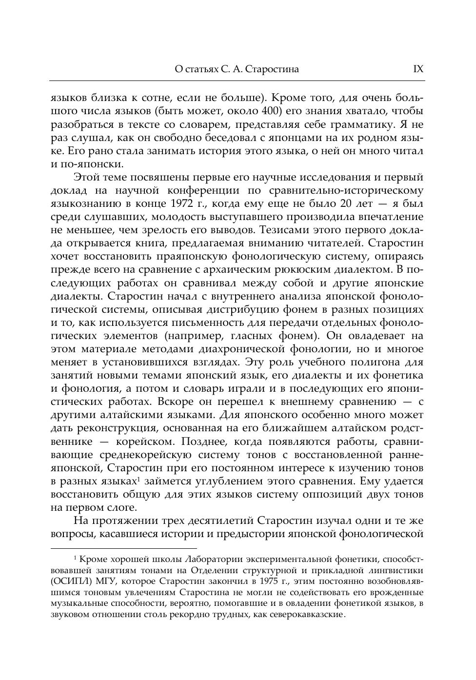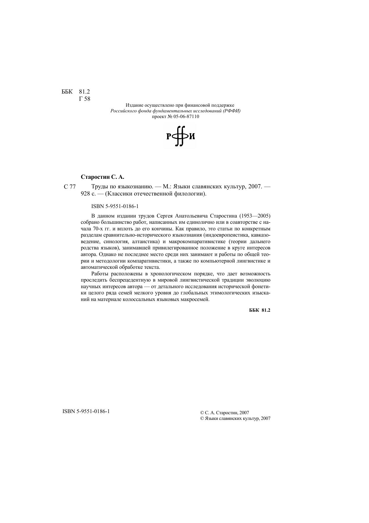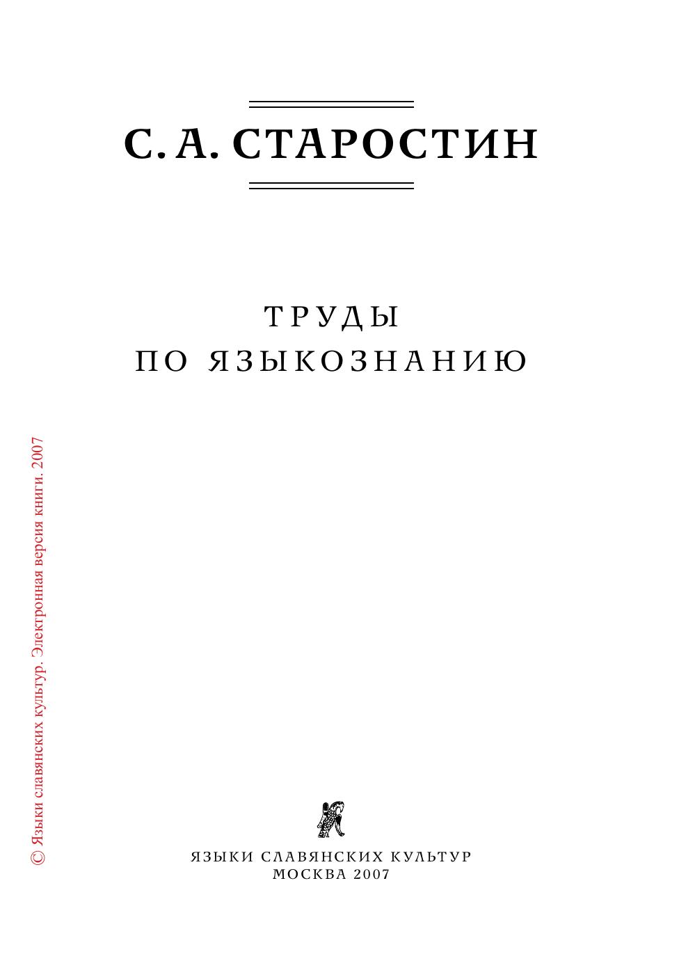 В данном издании трудов Сергея Анатольевича Старостина (1953—2005) собрано большинство работ, написанных им единолично или в соавторстве с начала 70-х гг. и вплоть до его кончины. Как правило, это статьи по конкретным разделам сравнительно-исторического языкознания (индоевропеистика, кавказоведение, синология, алтаистика) и макрокомпаративистике (теории дальнего родства языков), занимавшей привилегированное положение в круге интересов автора. Однако не последнее место среди них занимают и работы по общей теории и методологии компаративистики, а также по компьютерной лингвистике и автоматической обработке текста. Работы расположены в хронологическом порядке, что дает возможность проследить беспрецедентную в мировой лингвистической традиции эволюцию научных интересов автора — от детального исследования исторической фонетики целого ряда семей мелкого уровня до глобальных этимологических изысканий на материале колоссальных языковых макросемей.