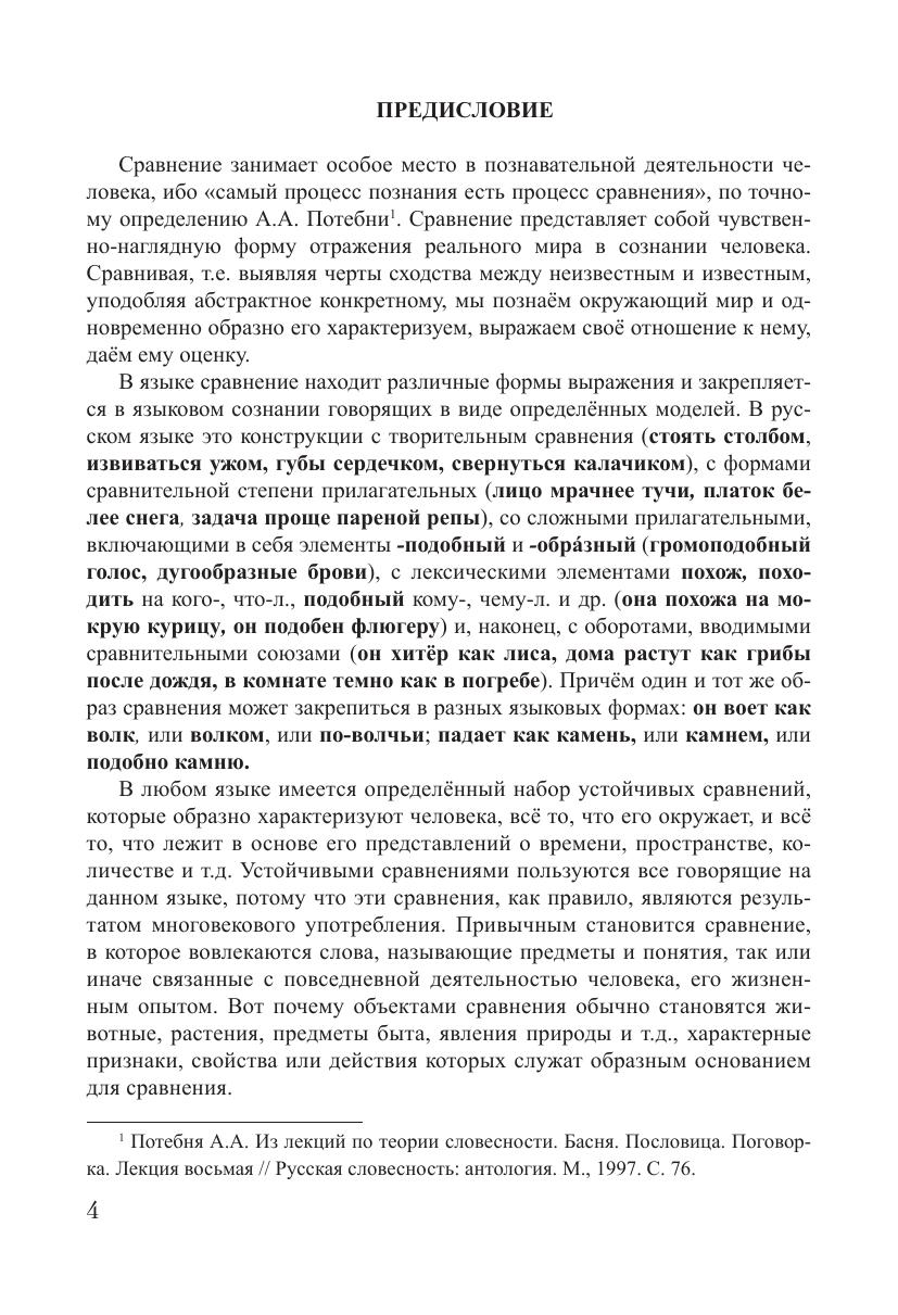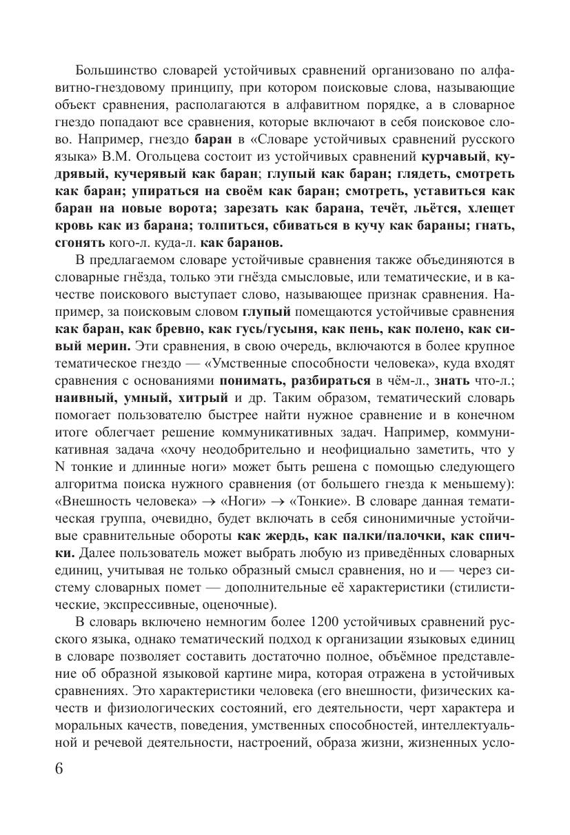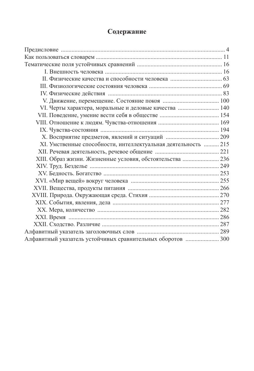 Предлагаемый словарь — один из первых в отечественной лексикографии опытов тематического описания устойчивых сравнений русского языка. Будучи небольшим по объему (около 1200 заголовочных единиц), словарь тем не менее дает достаточно полное представление о тематических сферах, в которых наиболее часто используются устойчивые сравнения: внешность человека, его физические качества и физиологические состояния, речевая и интеллектуальная деятельность, образ жизни, «мир вещей» вокруг человека и т.д.