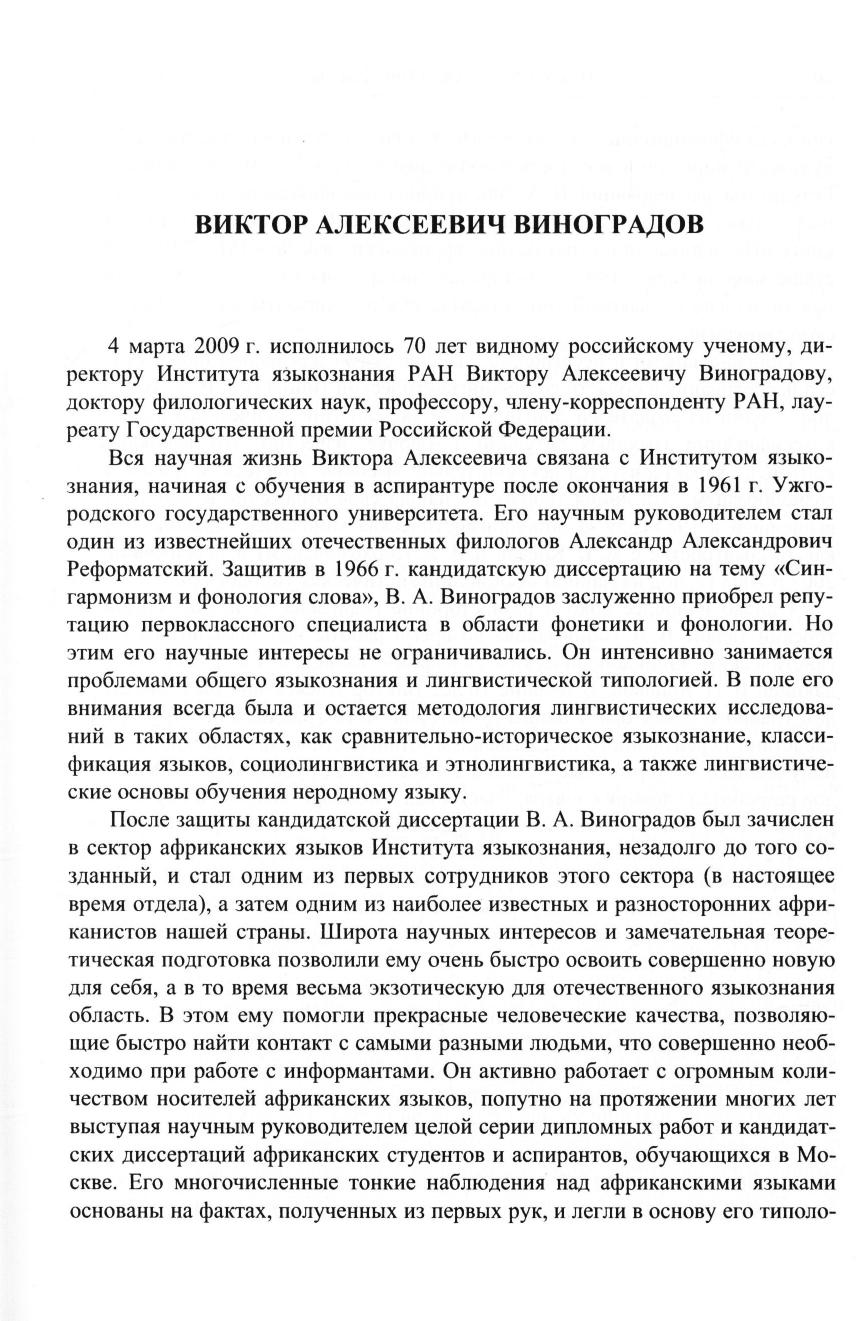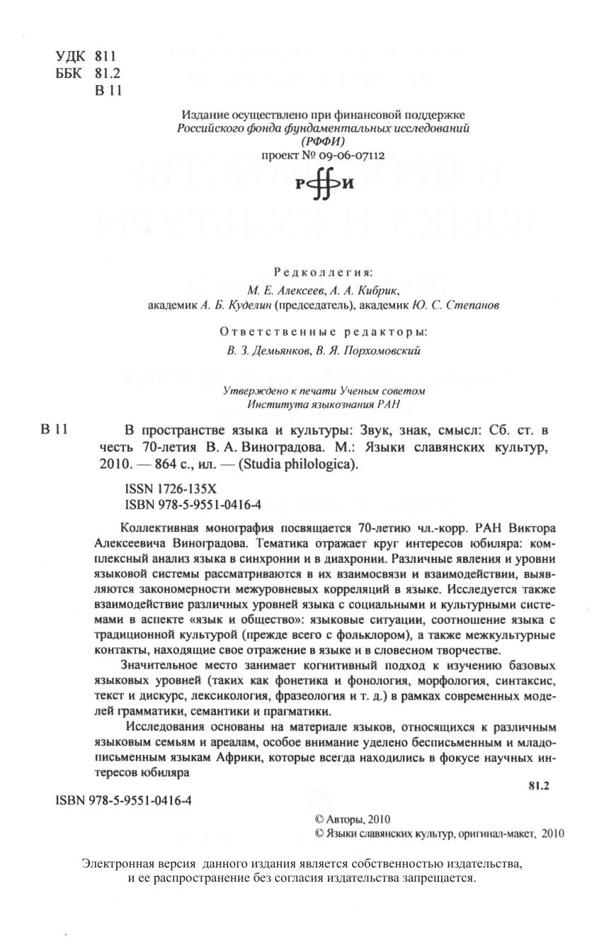 Коллективная монография посвящается 70-летию чл.-корр. РАН Виктора Алексеевича Виноградова. Тематика отражает круг интересов юбиляра: комплексный анализ языка в синхронии и в диахронии. Различные явления и уровни языковой системы рассматриваются в их взаимосвязи и взаимодействии, выявляются закономерности межуровневых корреляций в языке. Исследуется также взаимодействие различных уровней языка с социальными и культурными системами в аспекте «язык и общество»: языковые ситуации, соотношение языка с традиционной культурой (прежде всего с фольклором), а также межкультурные контакты, находящие свое отражение в языке и в словесном творчестве. Значительное место занимает когнитивный подход к изучению базовых языковых уровней (таких как фонетика и фонология, морфология, синтаксис, текст и дискурс, лексикология, фразеология и т. д.) в рамках современных моделей грамматики, семантики и прагматики. Исследования основаны на материале языков, относящихся к различным языковым семьям и ареалам, особое внимание уделено бесписьменным и младописьменным языкам Африки, которые всегда находились в фокусе научных интересов юбиляра.