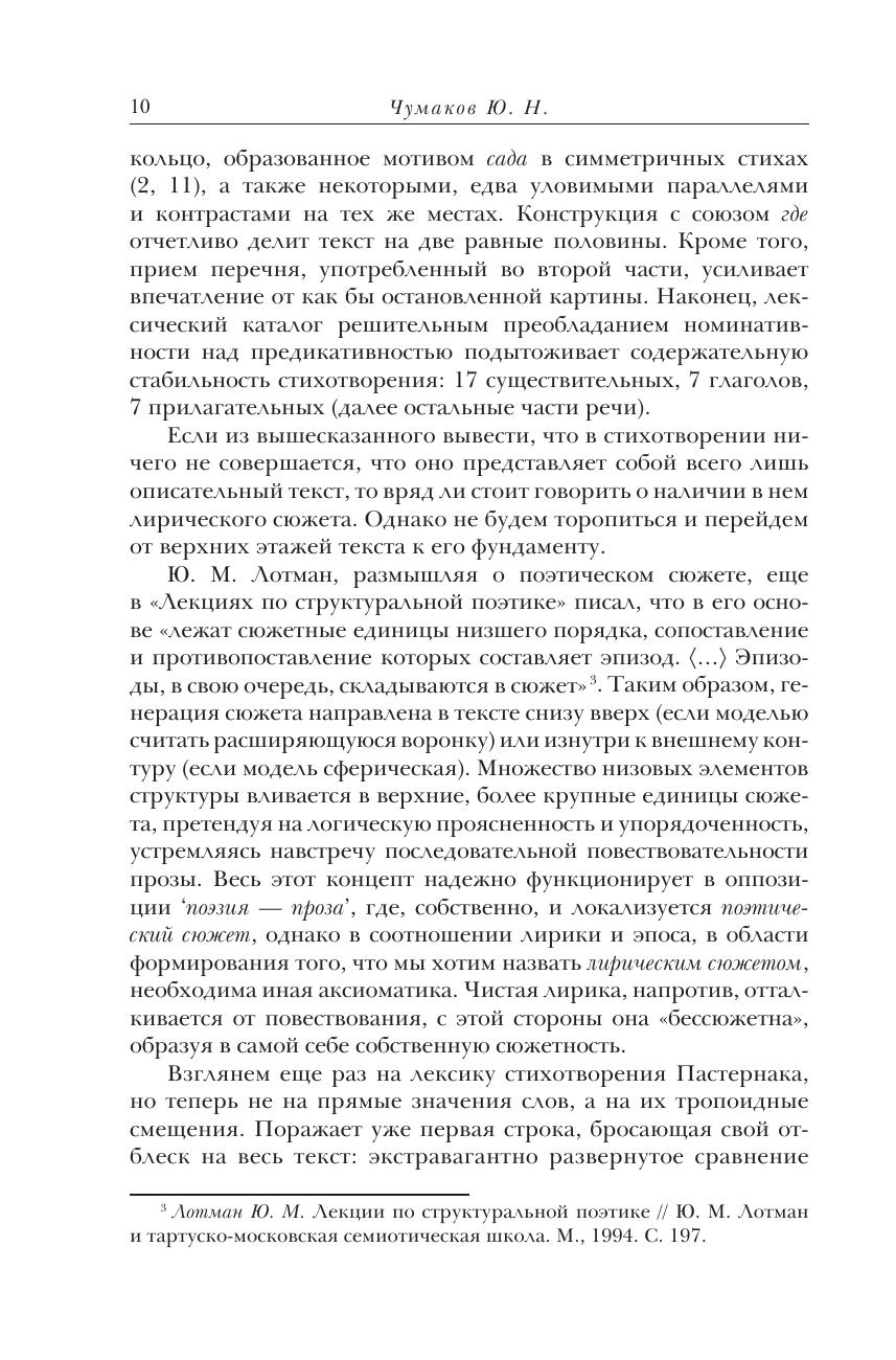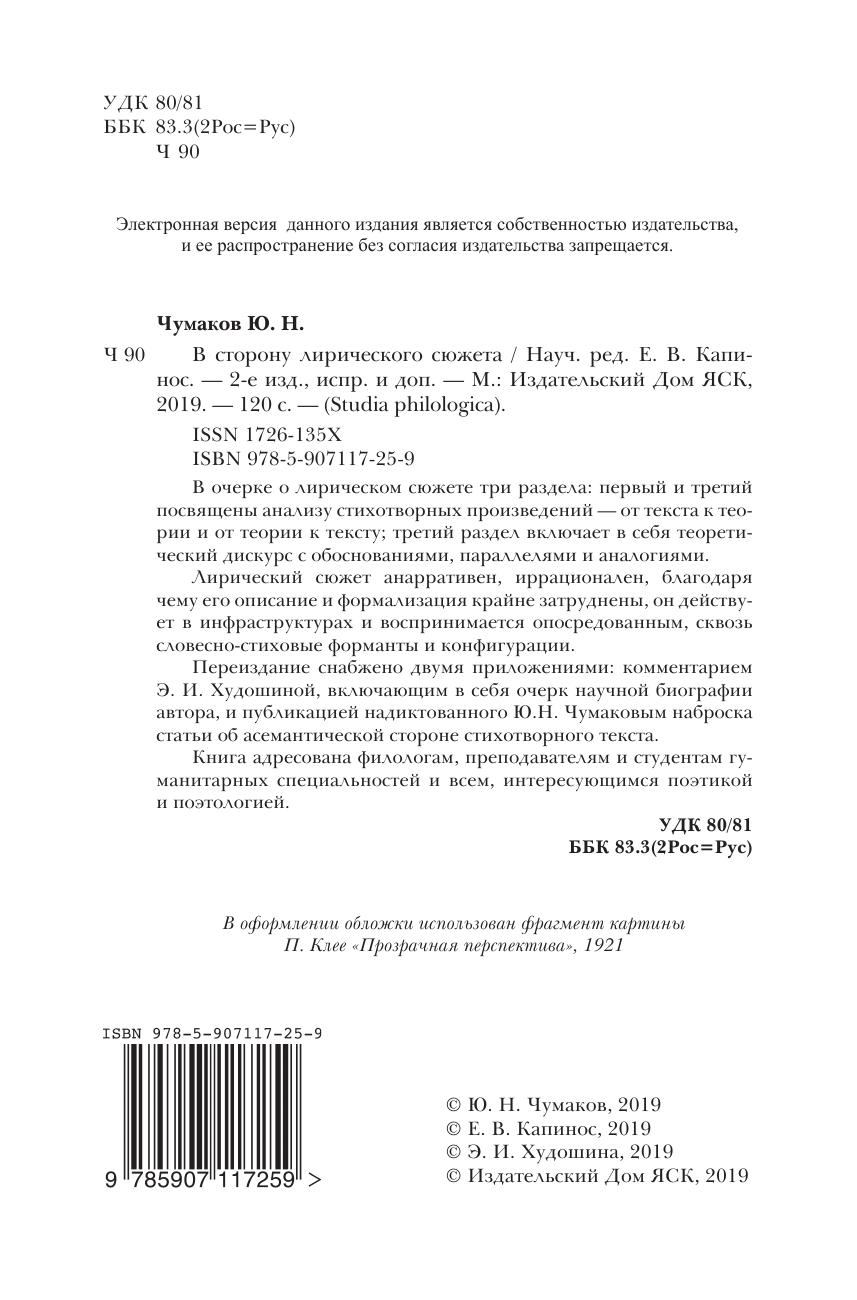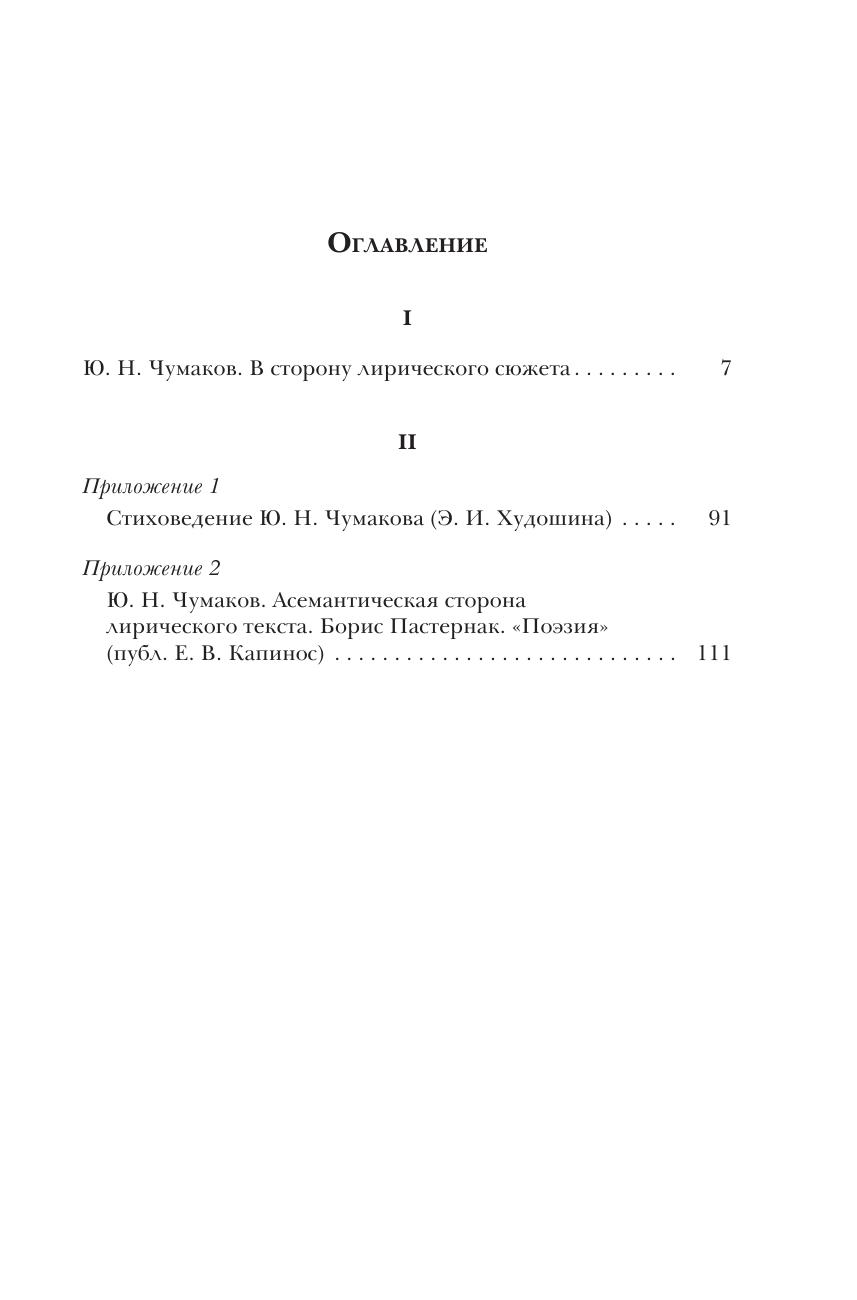 В очерке о лирическом сюжете три раздела: первый и третий посвящены анализу стихотворных произведений — от текста к теории и от теории к тексту, третий раздел включает в себя теоретический дискурс с обоснованиями, параллелями и аналогиями. Лирический сюжет анарративен, иррационален, благодаря чему его описание и формализация крайне затруднены, он действует в инфраструктурах и воспринимается опосредованным, сквозь словесно-стиховые форманты и конфигурации. Переиздание снабжено двумя приложениями: комментарием Э.И. Худошиной, включающим в себя очерк научной биографии автора, и публикацией надиктованного Ю.Н. Чумаковым наброска статьи об асемантической стороне стихотворного текста. Книга адресована филологам, преподавателям и студентам гуманитарных специальностей и всем, интересующимся поэтикой и поэтологией.