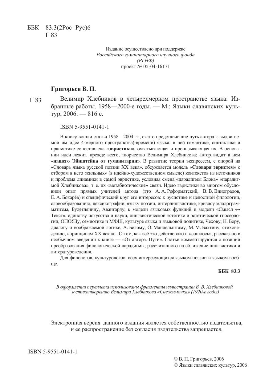 В книгу вошли статьи 1958—2004 годов, сжато представившие путь автора к выдвигаемой им идее 4-мерного пространства(-времени) языка: в ней семантике, синтактике и прагматике сопоставлена «эвристика», охватывающая и пронизывающая их. В основании идеи лежит, прежде всего, творчество Велимира Хлебникова, автор видит в нем «нашего Эйнштейна от гуманитарии». В развитие теории экспрессем, с опорой на «Словарь языка русской поэзии XX века», обсуждается модель «Словаря эвристем» с отбором в него «сильных» (в идейно-художественном смысле) контекстов из источников и проблема динамики в самой эвристике, условная смена «парадигмы Блока» «парадигмой Хлебникова», то есть их «метабиотические» связи. Идею эвристики во многом обусловили опыт прямых учителей автора (это А.А. Реформатский, В.В. Виноградов, Е.А. Бокарев) и специфический круг его интересов: к русистике и целостной филологии, словообразованию, лексикографии, языку поэзии, интерлингвистике, кризису младограмматизма, Будетлянину, Авангарду, у модели языковых функций и модели «Смысл – Текст», единству искусства и науки, лингвистической эстетике и эстетической гносеологии, ОПОЯЗу, семиотике МФШ, культуре языка и языковой политике, Чехову, Н. Бору, диалогу и воображаемой логике, А. Белому, О. Мандельштаму, М.М. Бахтину, стиховедению, «принципам ХХ века»… О том, как всё это действовало и «сошлось», рассказано в необычном введении к книге – «От автора. Пути». Статьи комментируются с позиций преобразования филологической парадигмы, рассчитанного на сближение лингвистики и литературоведения. Для филологов, культурологов, всех интересующихся языком поэзии и языком вообще.