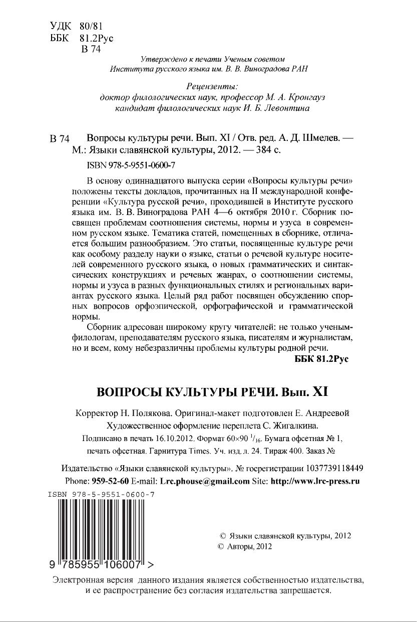 В основу одиннадцатого выпуска серии "Вопросы культуры речи" положены тексты докладов, прочитанных на II международной конференции "Культура русской речи", проходившей в Институте русского языка им. В. В. Виноградова РАН 4-6 октября 2010 г. Сборник посвящен проблемам соотношения системы, нормы и узуса в современном русском языке. Тематика статей, помещенных в сборнике, отличается большим разнообразием. Это статьи, посвященные культуре речи как особому разделу науки о языке, статьи о речевой культуре носителей современного русского языка, о новых грамматических и синтаксических конструкциях и речевых жанрах, о соотношении системы, нормы и узуса в разных функциональных стилях и региональных вариантах русского языка. Целый ряд работ посвящен обсуждению спорных вопросов орфоэпической, орфографической и грамматической нормы. Сборник адресован широкому кругу читателей: не только ученым-филологам, преподавателям русского языка, писателям и журналистам, но и всем, кому небезразличны проблемы культуры родной речи.