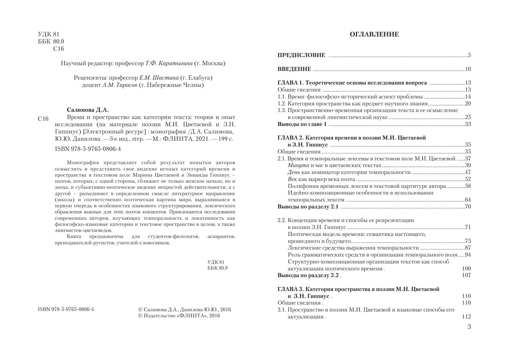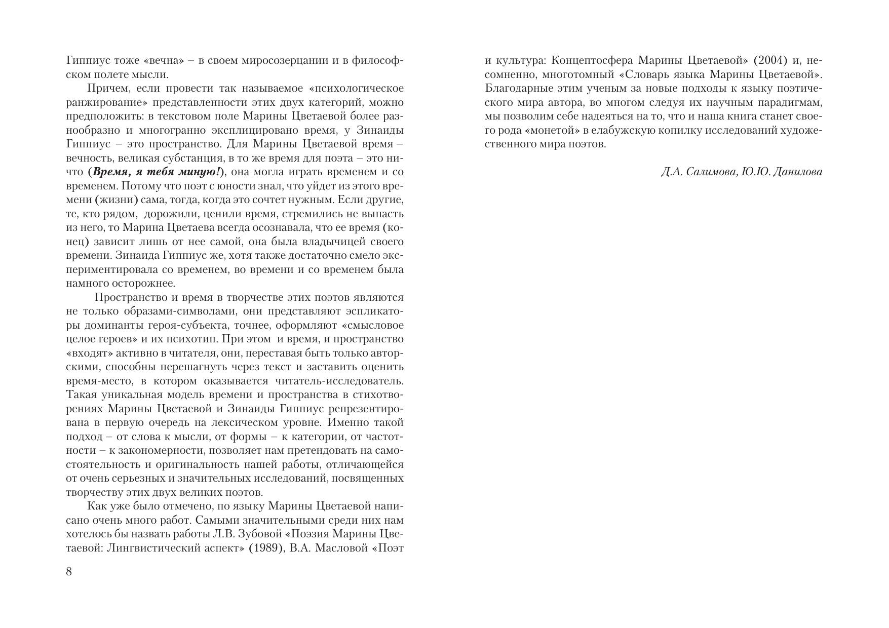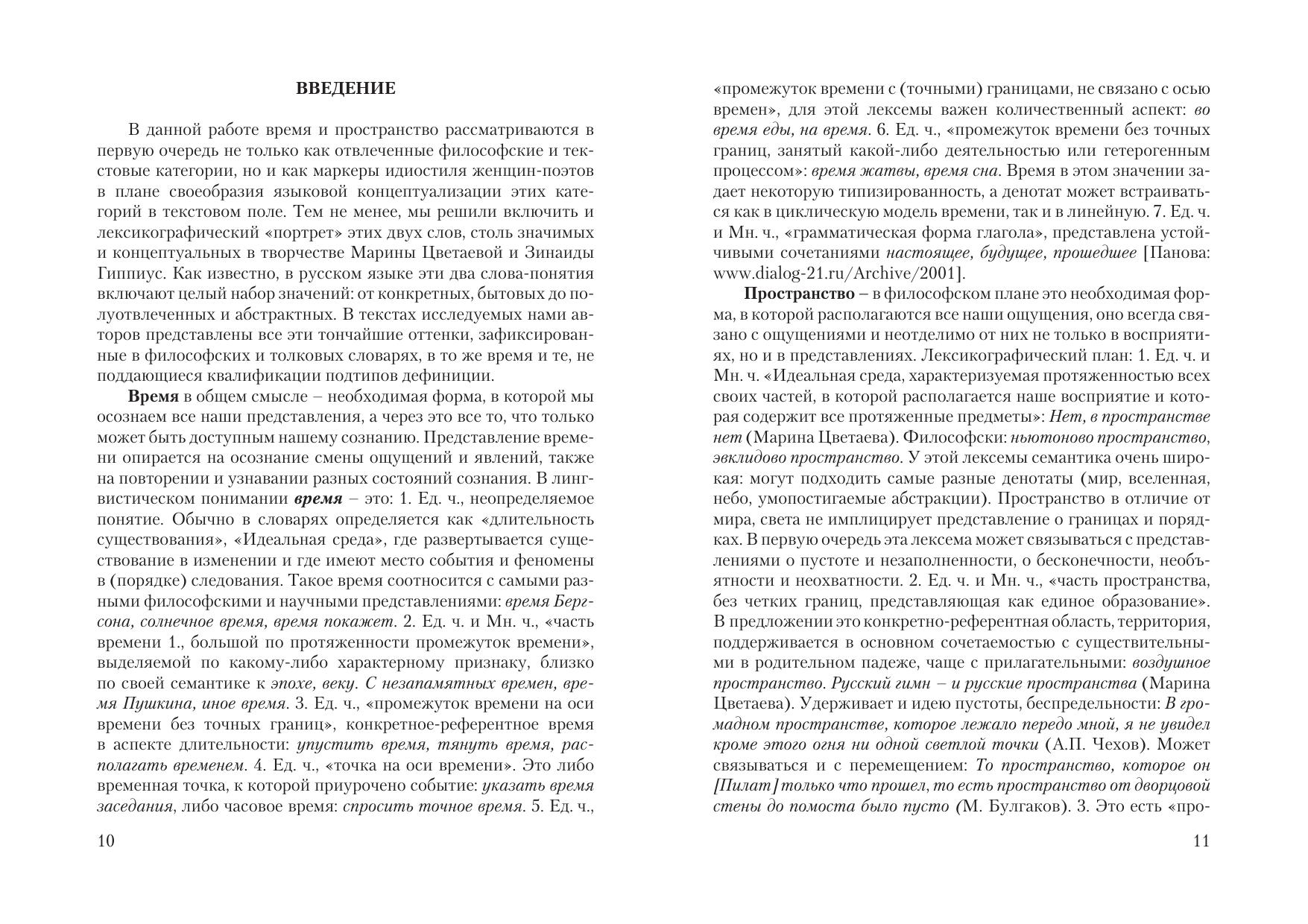Монография представляет собой результат попытки авторов осмыслить и представить свое видение вечных категорий времени и пространства в текстовом поле Марины Цветаевой и Зинаиды Гиппиус – поэтов, которых, с одной стороны, сближает не только женское начало, но и эпоха, и субъективно-поэтическое видение непростой действительности; а с другой – разъединяет в определенном смысле литературное направление (школа) и соответственно поэтическая картина мира, выразившаяся в первую очередь в особенностях языкового структурирования, лексического обрамления важных для этих поэтов концептов. Привлекаются исследования современных авторов, изучающих темпоральность и локативность как философско-языковые категории и текстовое пространство в целом, а также лингвистов-цветаеведов.