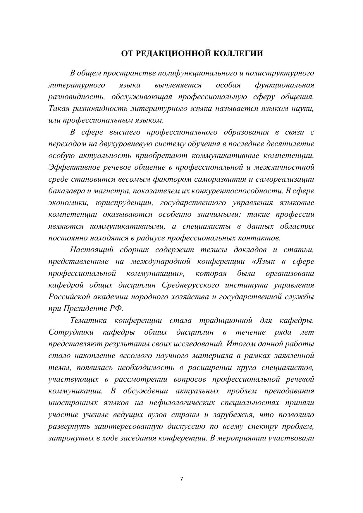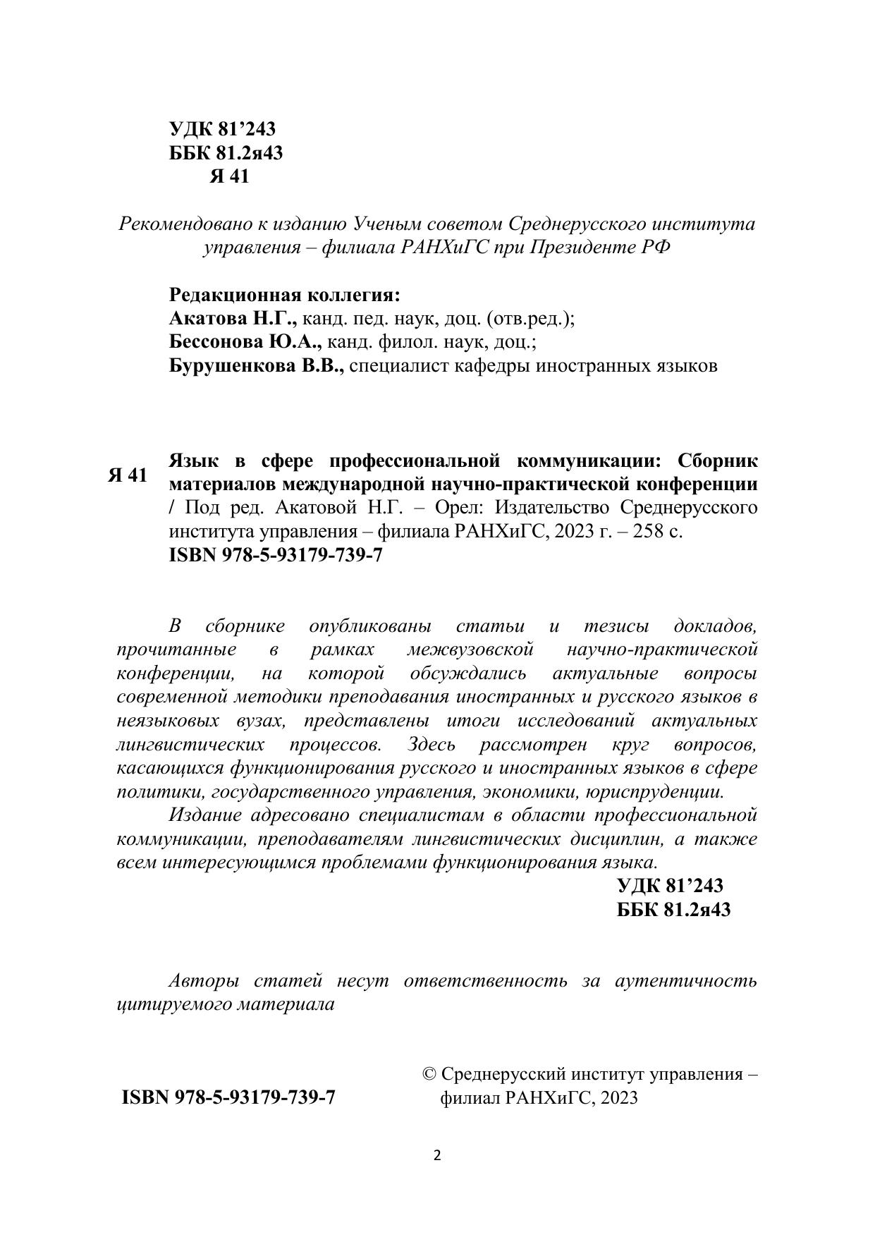 В сборнике опубликованы статьи и тезисы докладов, прочитанные в рамках межвузовской научно-практической конференции, на которой обсуждались актуальные вопросы современной методики преподавания иностранных и русского языков в неязыковых вузах, представлены итоги исследований актуальных лингвистических процессов. Здесь рассмотрен круг вопросов, касающихся функционирования русского и иностранных языков в сфере политики, государственного управления, экономики, юриспруденции. Издание адресовано специалистам в области профессиональной коммуникации, преподавателям лингвистических дисциплин, а также всем интересующимся проблемами функционирования языка.