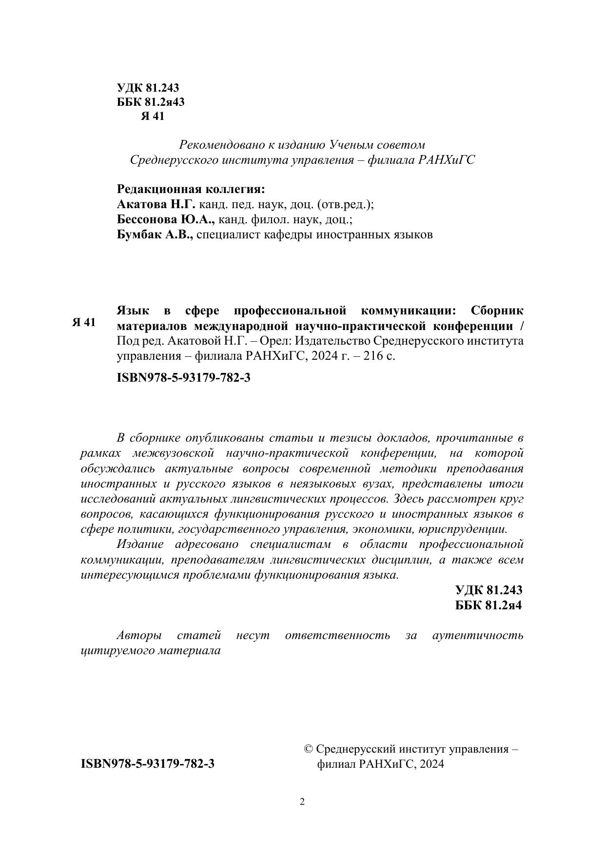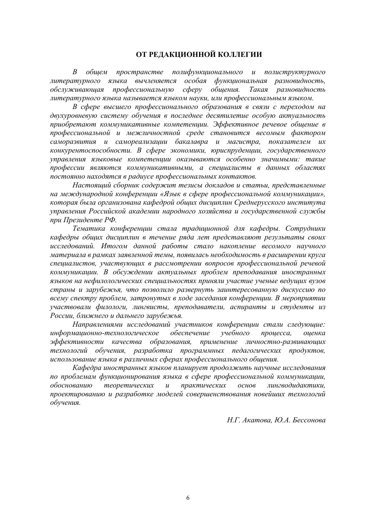 В сборнике опубликованы статьи и тезисы докладов, прочитанные в рамках межвузовской научно-практической конференции, на которой обсуждались актуальные вопросы современной методики преподавания иностранных и русского языков в неязыковых вузах, представлены итоги исследований актуальных лингвистических процессов. Здесь рассмотрен круг вопросов, касающихся функционирования русского и иностранных языков в сфере политики, государственного управления, экономики, юриспруденции. Издание адресовано специалистам в области профессиональной коммуникации, преподавателям лингвистических дисциплин, а также всем интересующимся проблемами функционирования языка.