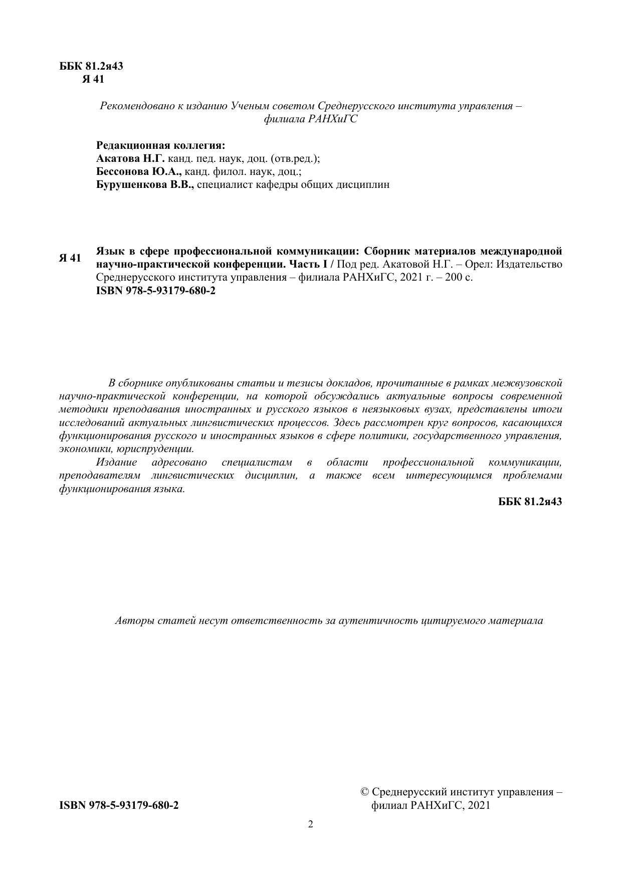 В сборнике опубликованы статьи и тезисы докладов, прочитанные в рамках межвузовской научно-практической конференции, на которой обсуждались актуальные вопросы современной методики преподавания иностранных и русского языков в неязыковых вузах, представлены итоги исследований актуальных лингвистических процессов. Здесь рассмотрен круг вопросов, касающихся функционирования русского и иностранных языков в сфере политики, государственного управления, экономики, юриспруденции. Издание адресовано специалистам в области профессиональной коммуникации, преподавателям лингвистических дисциплин, а также всем интересующимся проблемами функционирования языка.