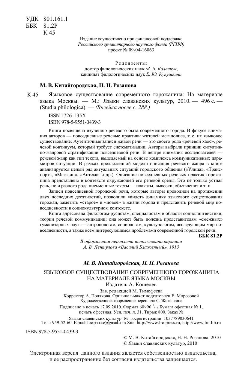 Книга посвящена изучению речевого быта современного города. В фокусе внимания авторов - повседневные речевые практики жителей мегаполиса, т.е. их языковое существование. Аутентичные записи живой речи - это своего рода "речевой хаос", речевой континуум, который требует систематизации. Авторы выбрали принцип ситуативно-жанровой стратификации повседневной речи. В центре внимания исследователей - речевой жанр как тип текста, выделяемый па основе комплекса коммуникативных параметров ситуации. В рамках предложенной модели описания речевого жанра в книге анализируется целый ряд актуальных ситуаций городского общения ("Улица". "Транспорт", "Магазин", "Аптека" и др.). Описание повседневных речевых практик горожанина представлено в контексте окружающей его речевой среды. Это не только устная речь, но и разного рода письменные тексты - плакаты, вывески, объявления и т.п. Записи повседневной городской речи, которые авторы проводили на протяжении двух последних десятилетий, позволили увидеть динамику языкового существования горожан, заметить "старое" и "новое" в жизни города и представить речевой мир повседневности в социокультурном контексте. Книга адресована филологам-русистам, специалистам в области социолингвистики, теории речевой коммуникации, она может быть полезна представителям "смежных" гуманитарных наук - антропологам, социологам, культурологам, исследующим мир повседневности, а также всем интересующимся проблемами современной городской речи.