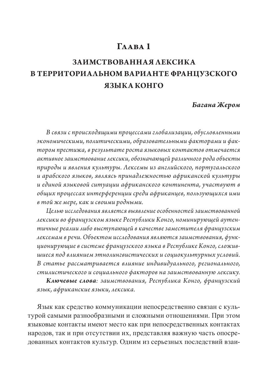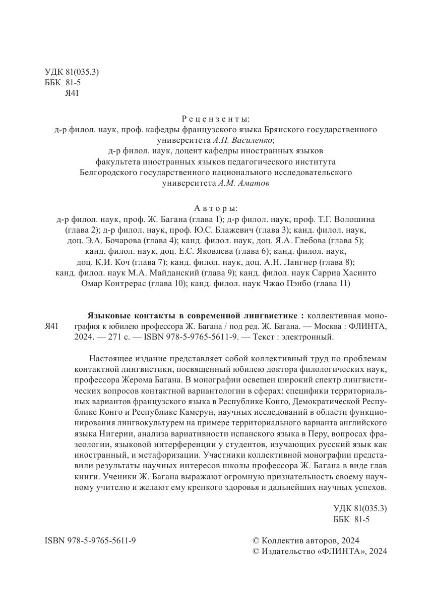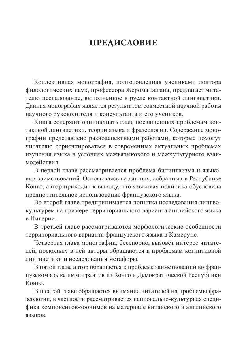 Настоящее издание представляет собой коллективный труд по проблемам контактной лингвистики, посвященный юбилею доктора филологических наук, профессора Жерома Багана. В монографии освещен широкий спектр лингвистических вопросов контактной вариантологии в сферах: специфики территориальных вариантов французского языка в Республике Конго, Демократической Республике Конго и Республике Камерун, научных исследований в области функционирования лингвокультурем на примере территориального варианта английского языка Нигерии, анализа вариативности испанского языка в Перу, вопросах фразеологии, языковой интерференции у студентов, изучающих русский язык как иностранный, и метафоризации. Участники коллективной монографии представили результаты научных интересов школы профессора Ж. Багана в виде глав книги. Ученики Ж. Багана выражают огромную признательность своему научному учителю и желают ему крепкого здоровья и дальнейших научных успехов.