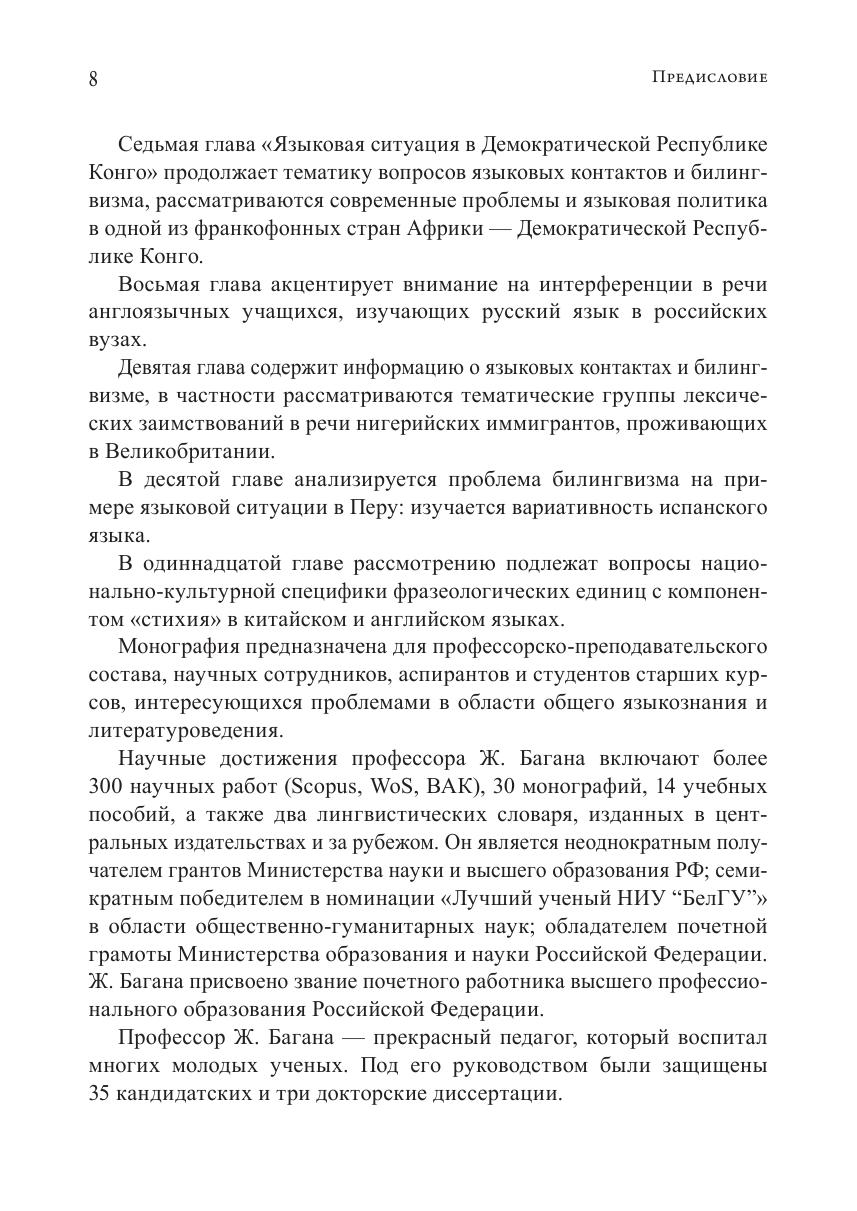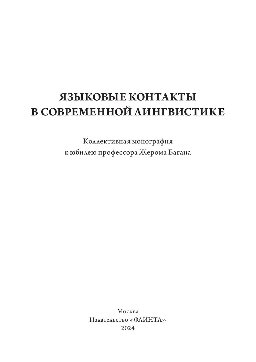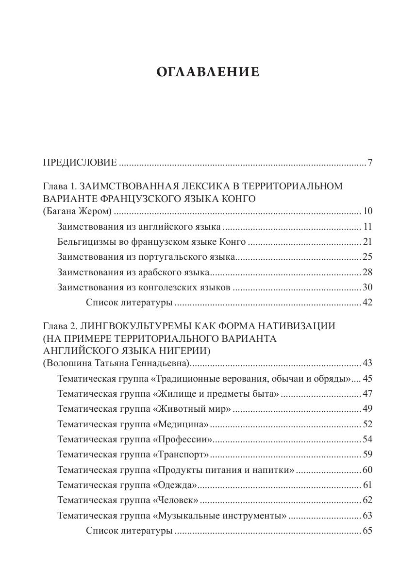 Настоящее издание представляет собой коллективный труд по проблемам контактной лингвистики, посвященный юбилею доктора филологических наук, профессора Жерома Багана. В монографии освещен широкий спектр лингвистических вопросов контактной вариантологии в сферах: специфики территориальных вариантов французского языка в Республике Конго, Демократической Республике Конго и Республике Камерун, научных исследований в области функционирования лингвокультурем на примере территориального варианта английского языка Нигерии, анализа вариативности испанского языка в Перу, вопросах фразеологии, языковой интерференции у студентов, изучающих русский язык как иностранный, и метафоризации. Участники коллективной монографии представили результаты научных интересов школы профессора Ж. Багана в виде глав книги. Ученики Ж. Багана выражают огромную признательность своему научному учителю и желают ему крепкого здоровья и дальнейших научных успехов.