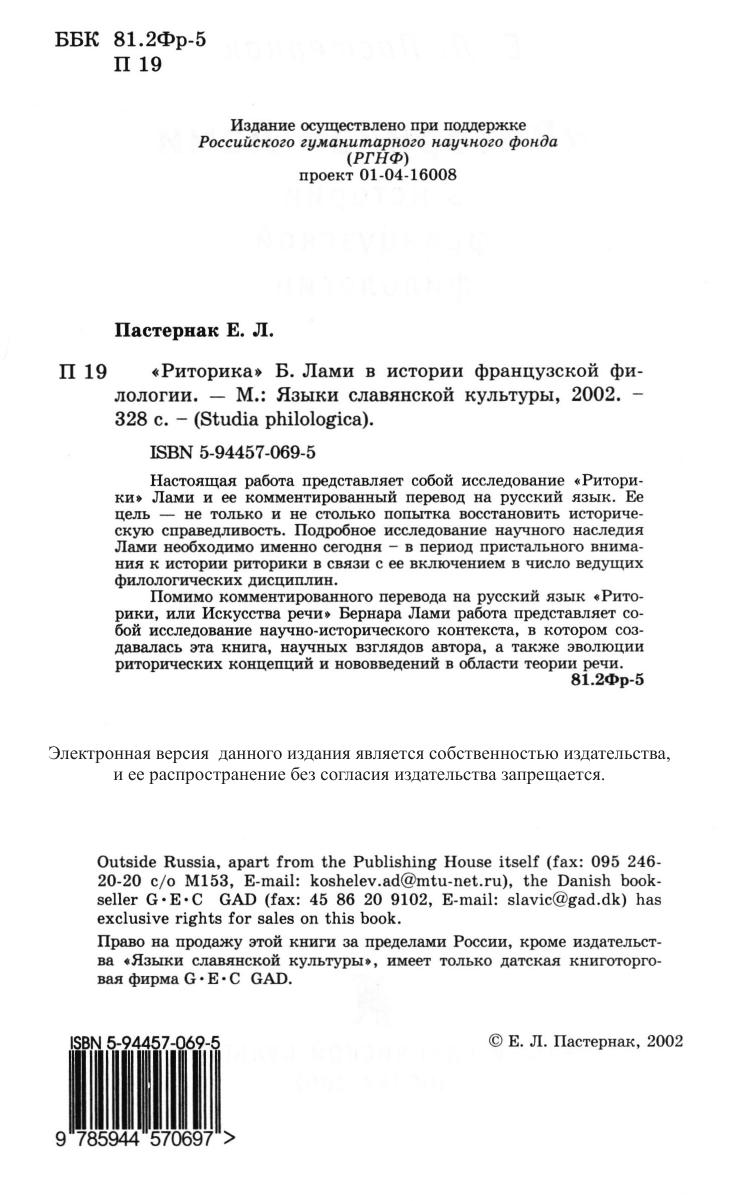 Настоящая работа представляет собой исследование `Риторики` Лами и ее комментированный перевод на русский язык. Ее цель - не только и не столько попытка восстановить историческую справедливость. Подробное исследование научного наследия Лами необходимо именно сегодня - в период пристального внимания к истории риторики в связи с ее включением в число ведущих филологических дисциплин. Помимо комментированного перевода на русский язык `Риторики, или Искусства речи` Бернара Лами работа представляет собой исследование научно-исторического контекста, в котором создавалась эта книга, научных взглядов автора, а также эволюции риторических концепций и нововведений в области теории речи.