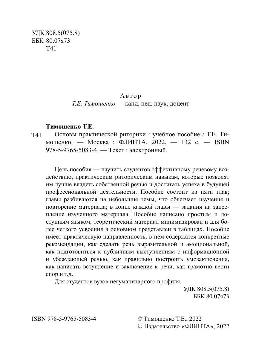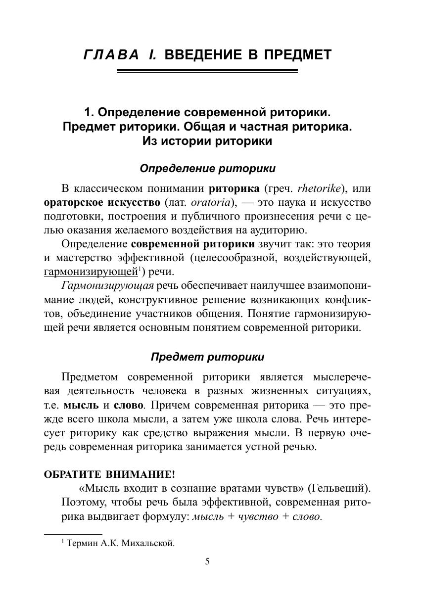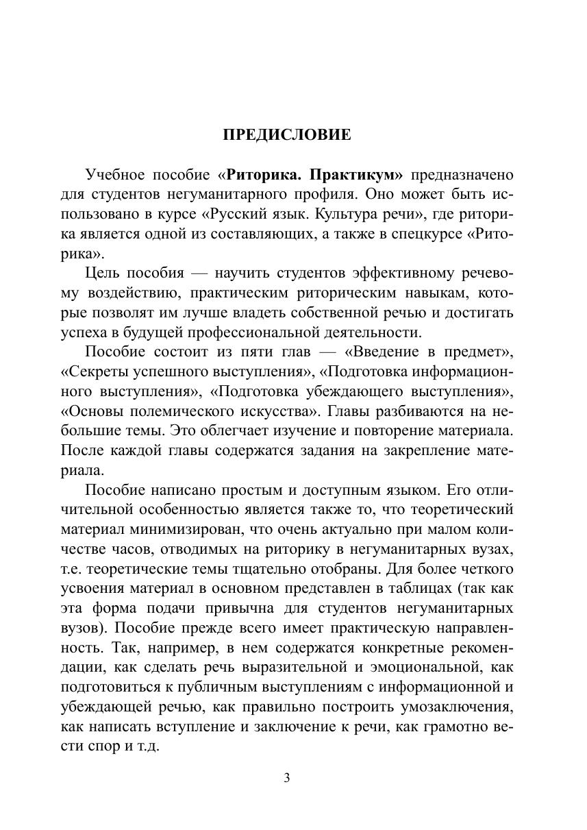 Цель пособия — научить студентов эффективному речевому воздействию, практическим риторическим навыкам, которые позволят им лучше владеть собственной речью и достигать успеха в будущей профессиональной деятельности. Пособие состоит из пяти глав; главы разбиваются на небольшие темы, что облегчает изучение и повторение материала; в конце каждой главы — задания на закрепление изученного материала. Пособие написано простым и доступным языком, теоретический материал минимизирован и для более четкого усвоения в основном представлен в таблицах. Пособие имеет практическую направленность, в нем содержатся конкретные рекомендации, как сделать речь выразительной и эмоциональной, как подготовиться к публичным выступлениям с информационной и убеждающей речью, как правильно построить умозаключения, как написать вступление и заключение к речи, как грамотно вести спор и т.д.