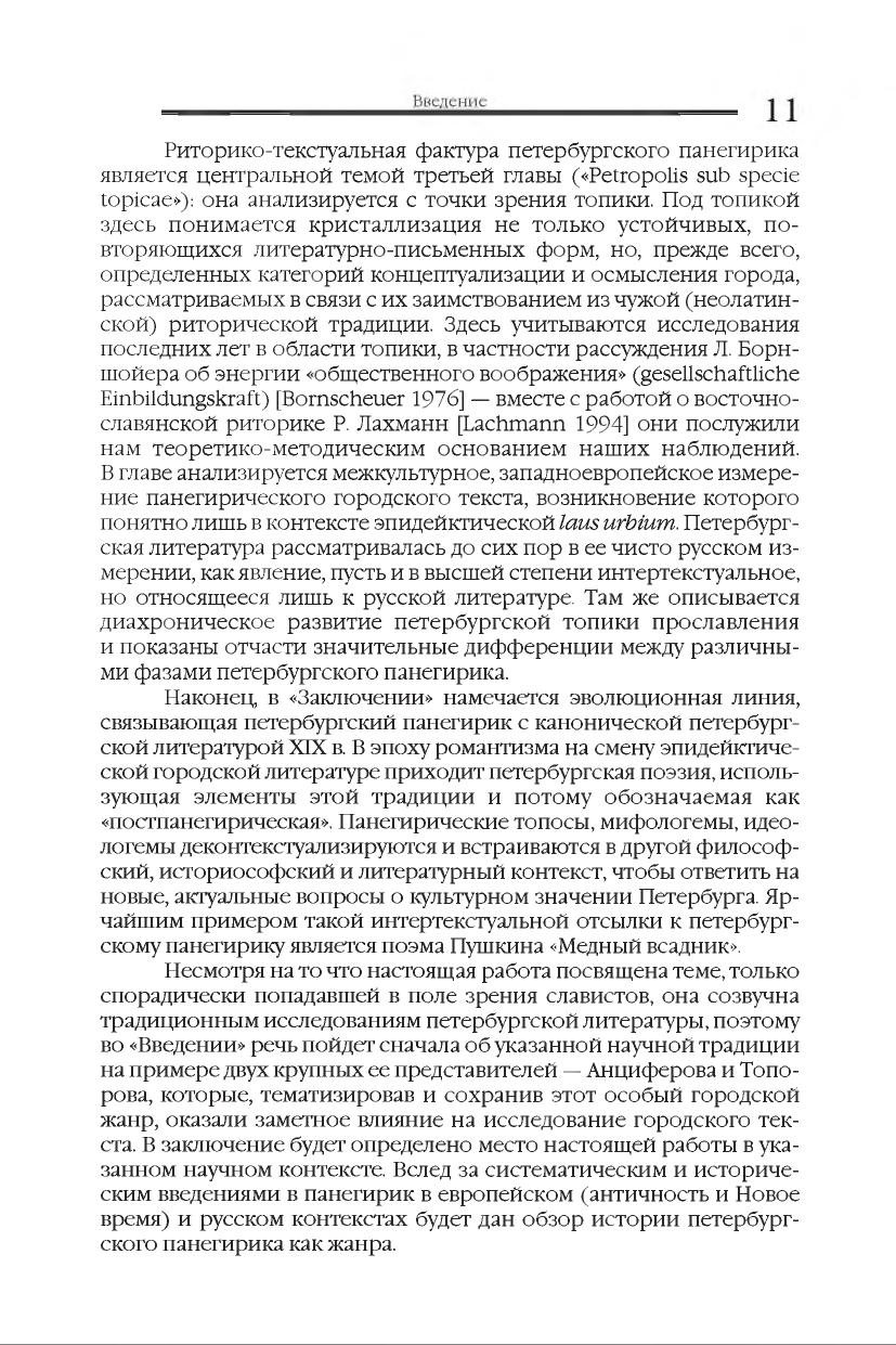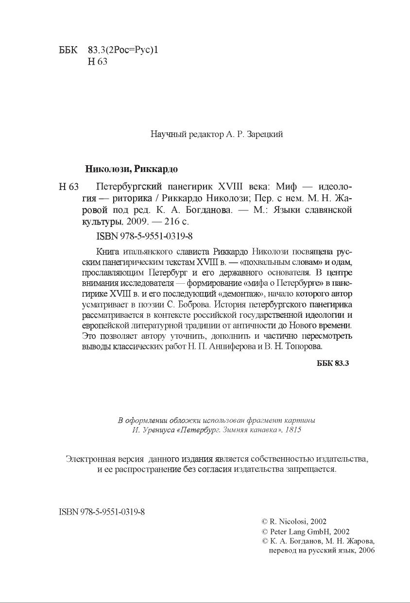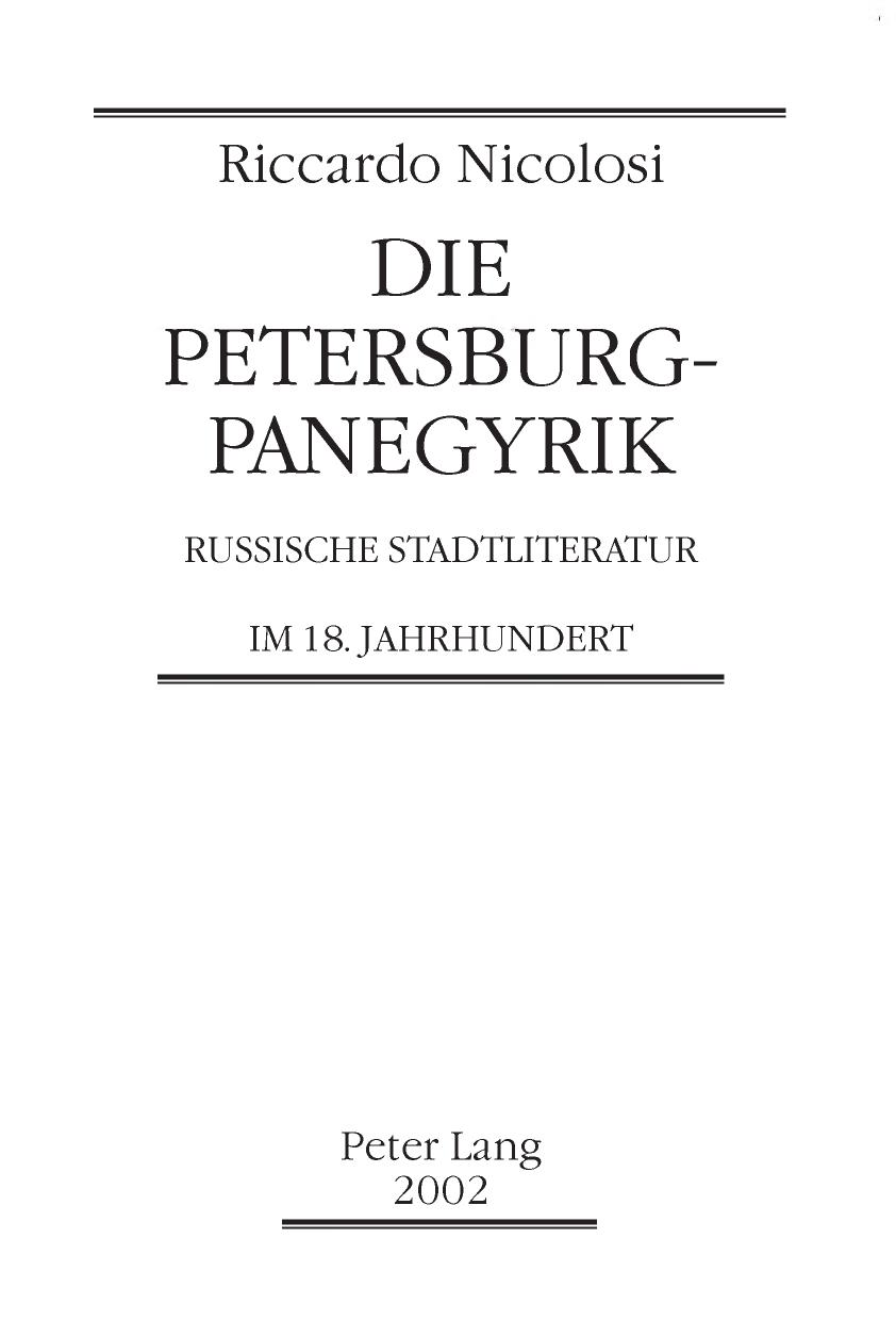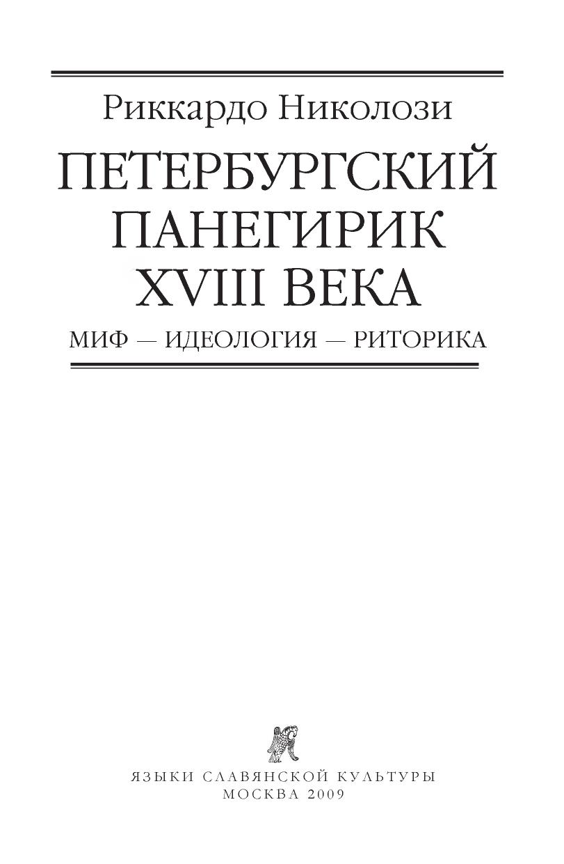 Книга итальянского слависта Риккардо Николози посвящена русским панегирическим текстам XVIII в. — «похвальным словам» и одам, прославляющим Петербург и его державного основателя. В центре внимания исследователя — формирование «мифа о Петербурге» в панегирике XVIII в. и его последующий «демонтаж», начало которого автор усматривает в поэзии С. Боброва. История петербургского панегирика рассматривается в контексте российской государственной идеологии и европейской литературной традиции от античности до Нового времени. Это позволяет автору уточнить, дополнить и частично пересмотреть выводы классических работ Н. П. Анциферова и В. Н. Топорова