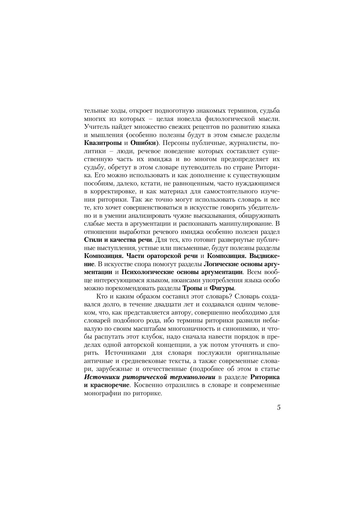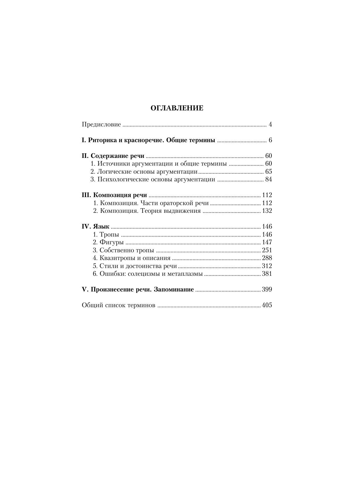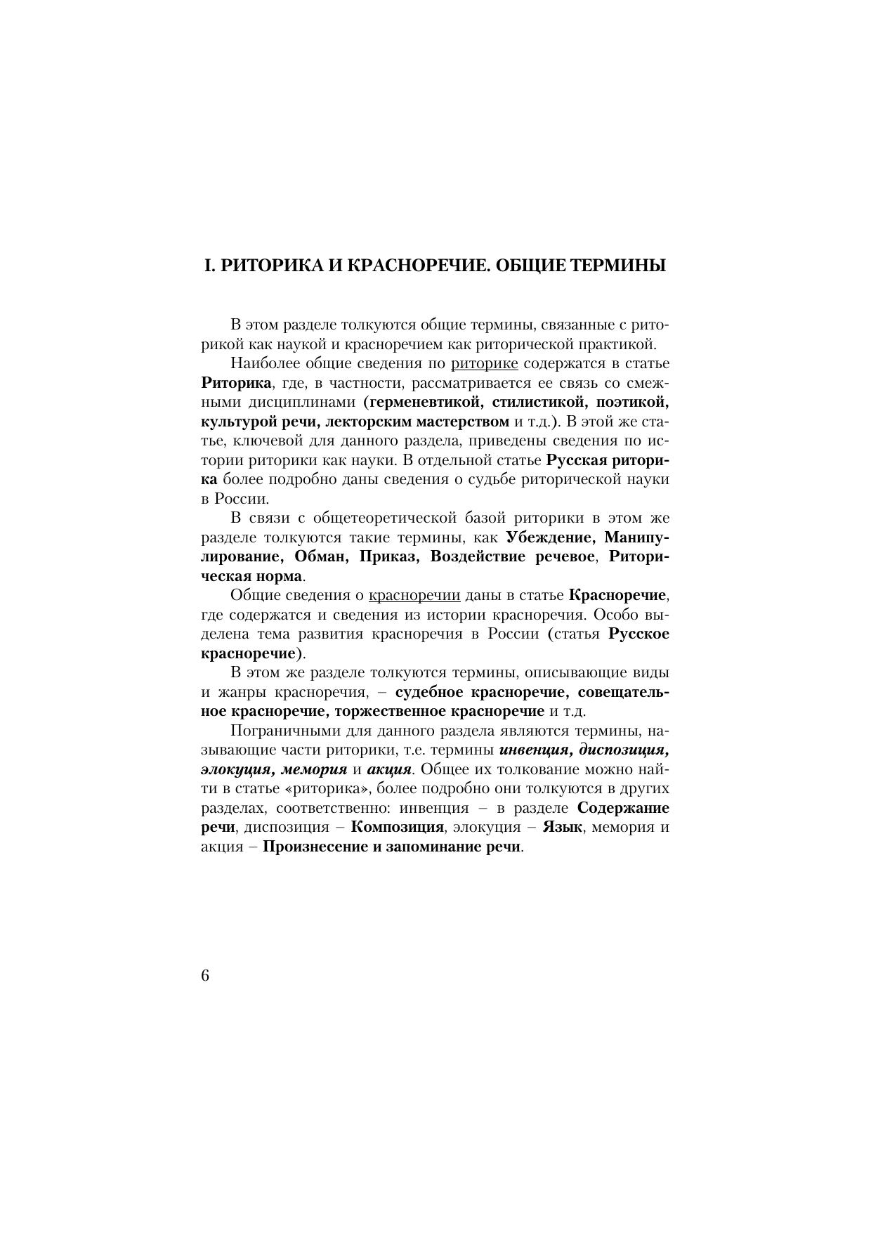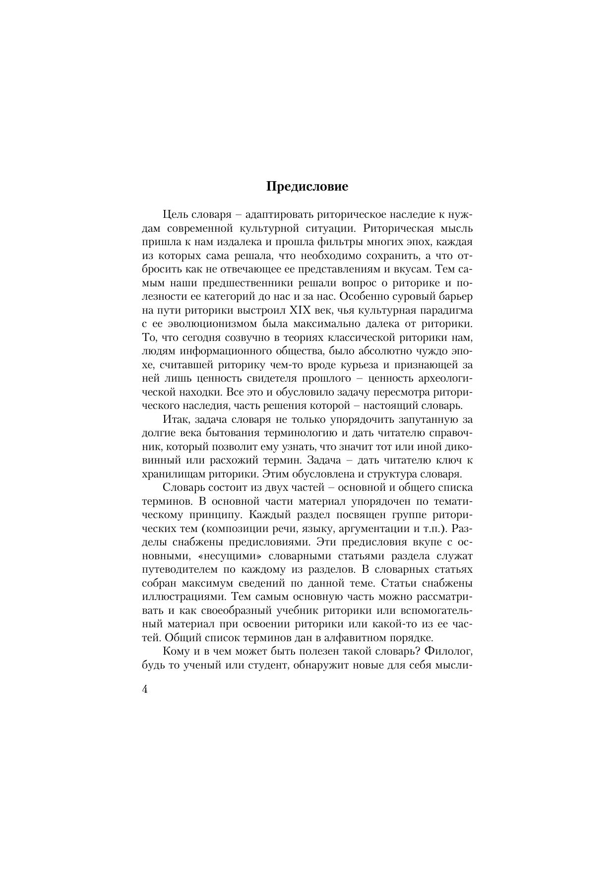 Словарь состоит из двух частей: основной и справочной. В основной материал упорядочен по тематическому принципу. Каждый раздел посвящен группе риторических тем (композиции речи, языку, аргументации и т.п.). Разделы снабжены предисловиями, которые вкупе с основными словарными статьями раздела служат путеводителем по каждому из разделов. В словарных статьях, снабженных иллюстрациями, собран максимум сведений по данной теме, поэтому основную часть можно рассматривать и как своеобразный учебник риторики, или вспомогательный материал при освоении риторики, или какой-то из ее частей. Вторая часть содержит общий список терминов, снабженных лишь этимологией, определениями и отсылками к основной части.