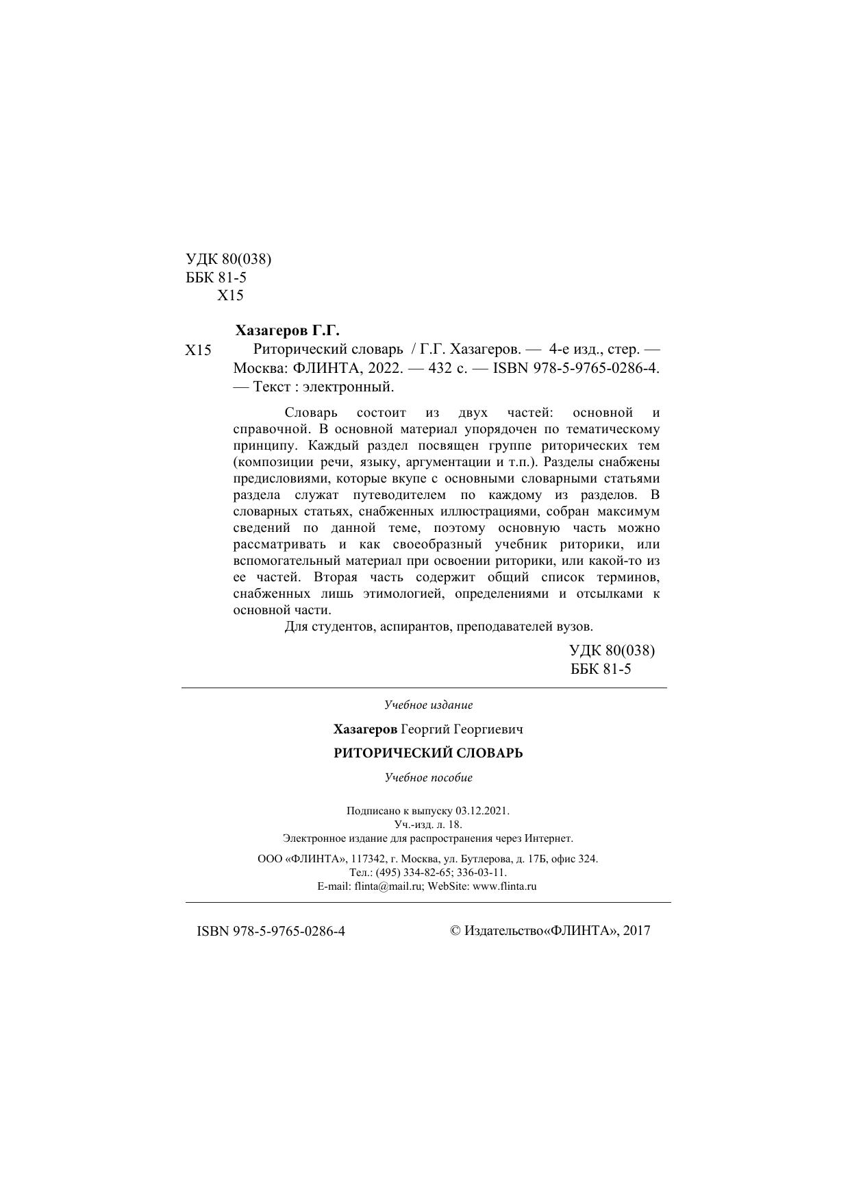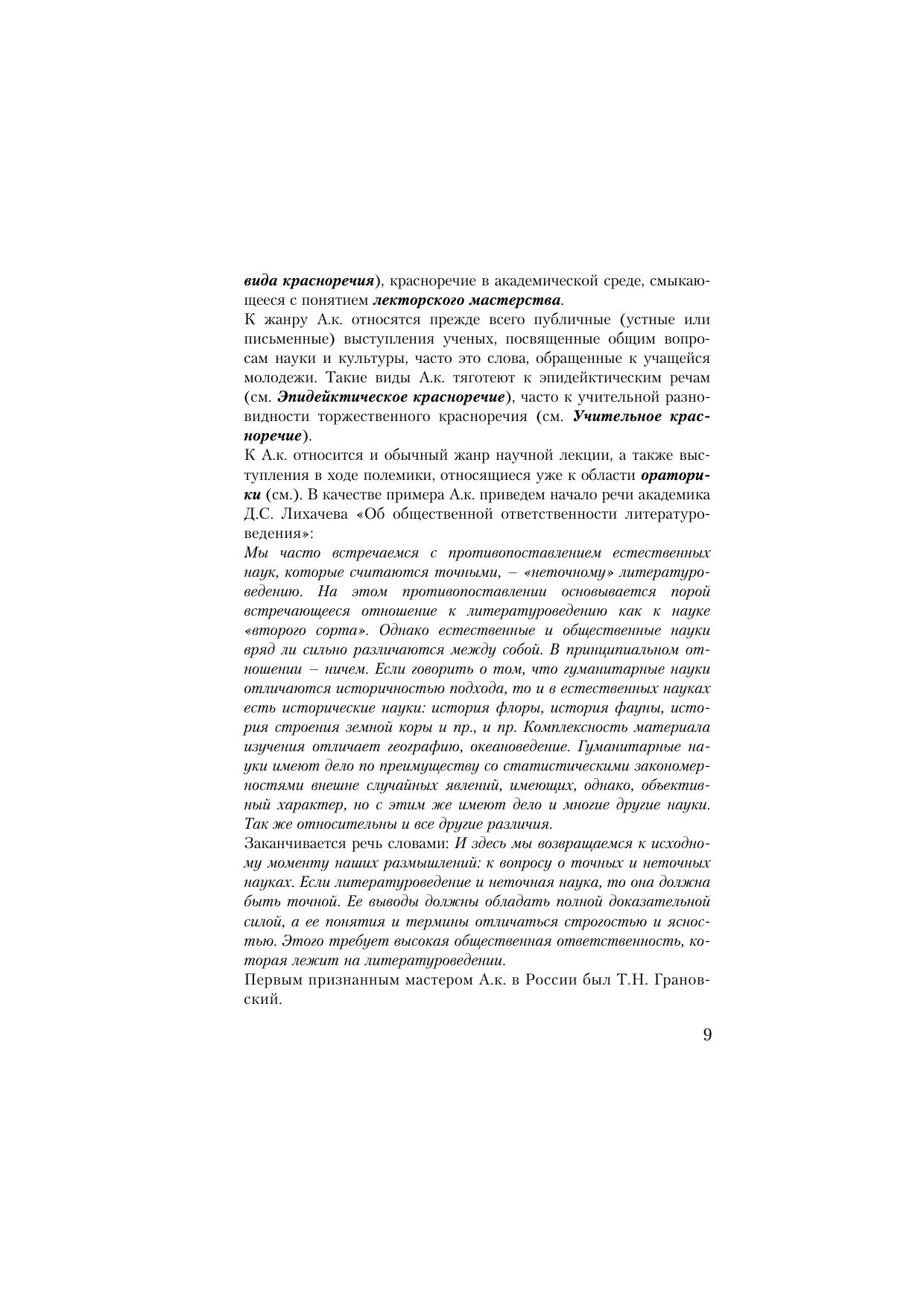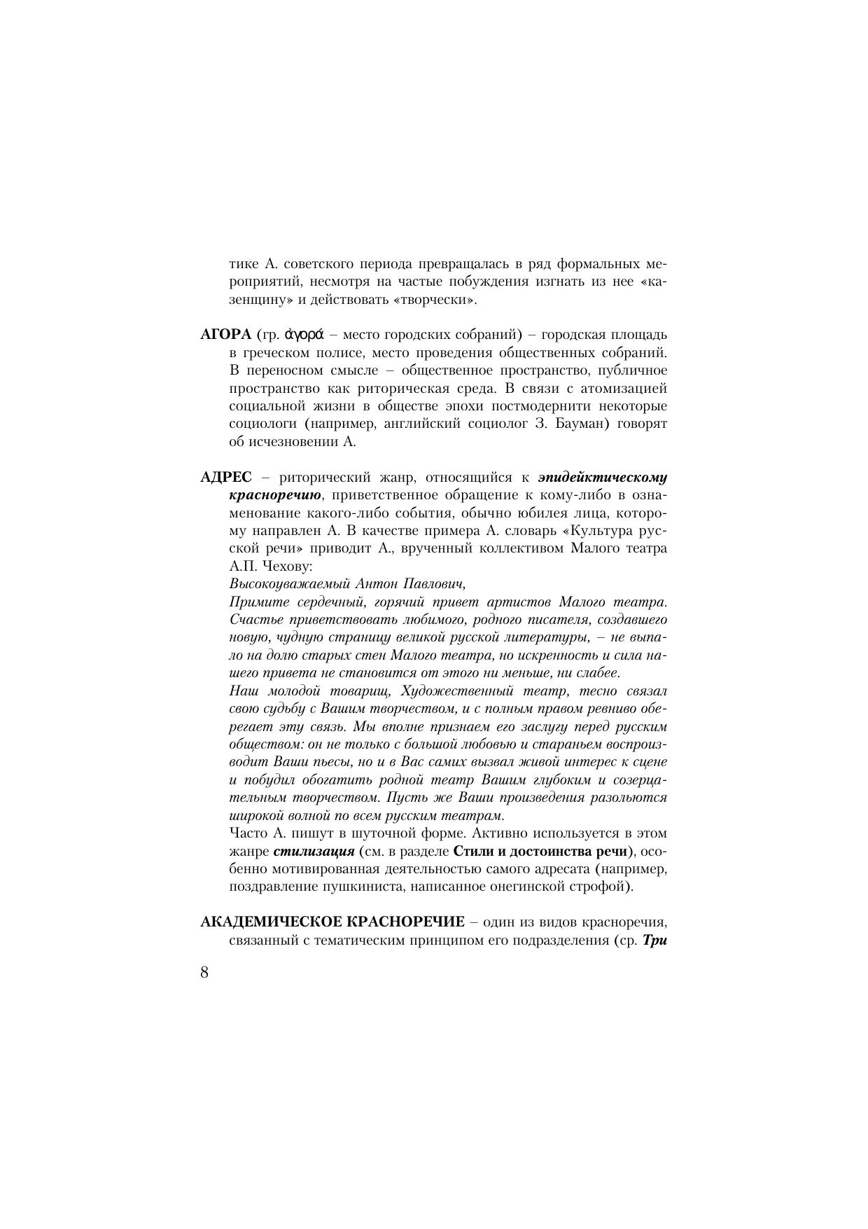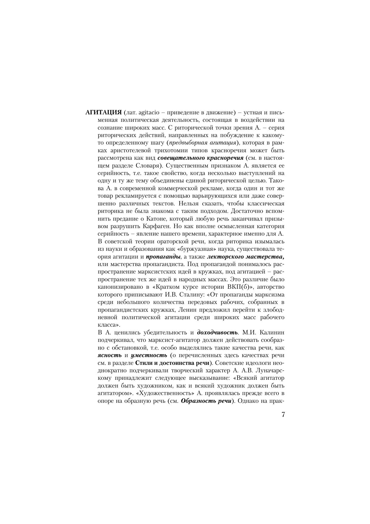 Словарь состоит из двух частей: основной и справочной. В основной материал упорядочен по тематическому принципу. Каждый раздел посвящен группе риторических тем (композиции речи, языку, аргументации и т.п.). Разделы снабжены предисловиями, которые вкупе с основными словарными статьями раздела служат путеводителем по каждому из разделов. В словарных статьях, снабженных иллюстрациями, собран максимум сведений по данной теме, поэтому основную часть можно рассматривать и как своеобразный учебник риторики, или вспомогательный материал при освоении риторики, или какой-то из ее частей. Вторая часть содержит общий список терминов, снабженных лишь этимологией, определениями и отсылками к основной части.