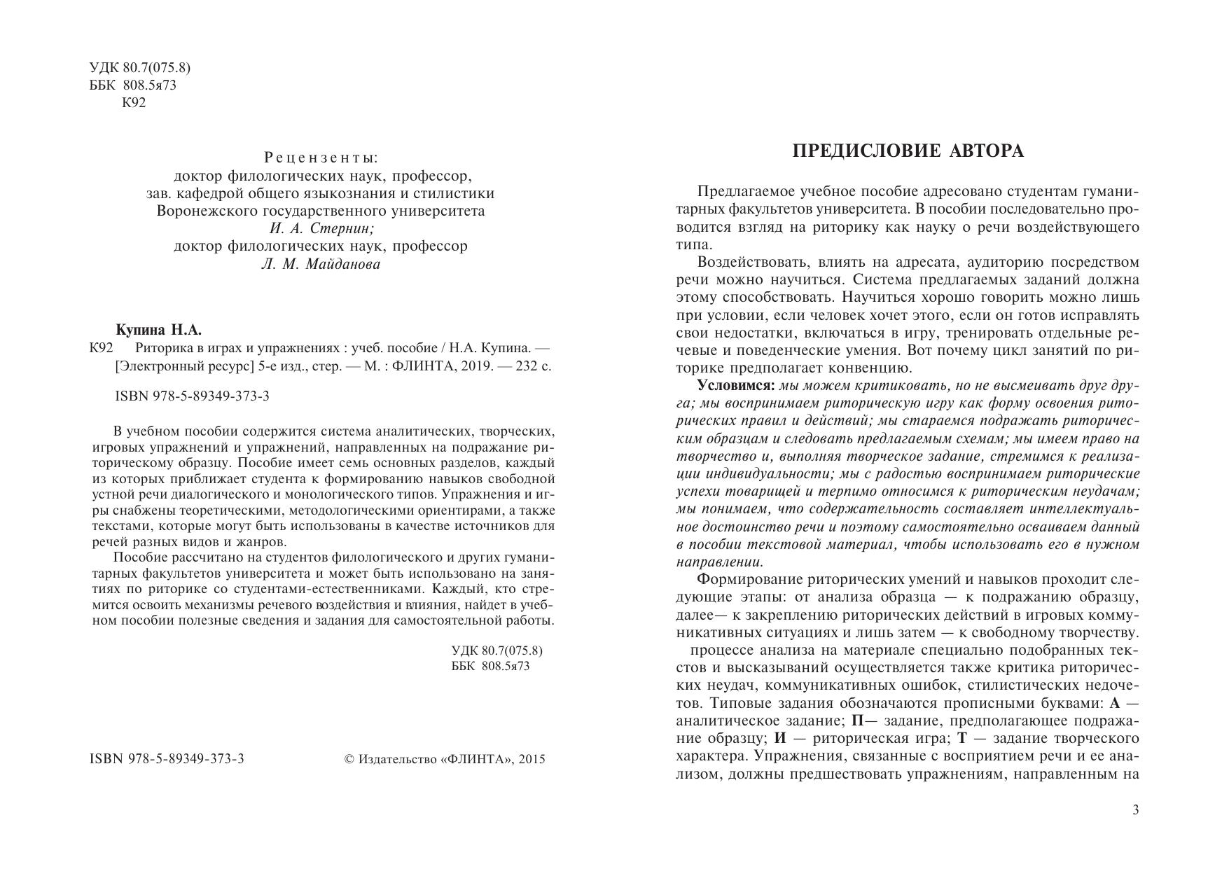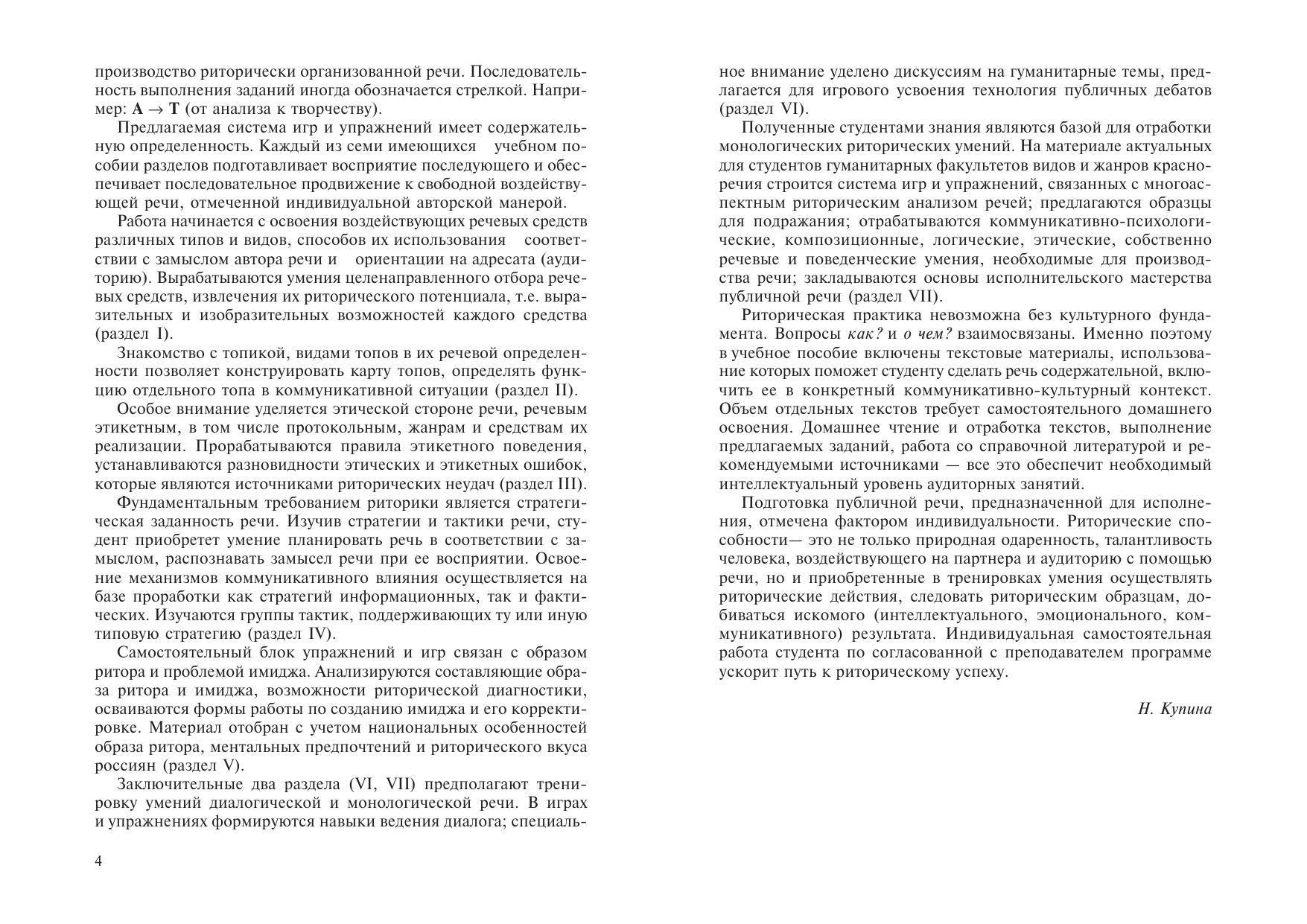 В учебном пособии содержится система аналитических, творческих, игровых упражнений и упражнений, направленных на подражание риторическому образцу. Пособие имеет семь основных разделов, каждый из которых приближает студента к формированию навыков свободной устной речи диалогического и монологического типов. Упражнения и игры снабжены теоретическими, методологическими ориентирами, а также текстами, которые могут быть использованы в качестве источников для речей разных видов и жанров. Пособие рассчитано на студентов филологического и других гуманитарных факультетов университета и может быть использовано на занятиях по риторике со студентами-естественниками. Каждый, кто стремится освоить механизмы речевого воздействия и влияния, найдет в учебном пособии полезные сведения и задания для самостоятельной работы.