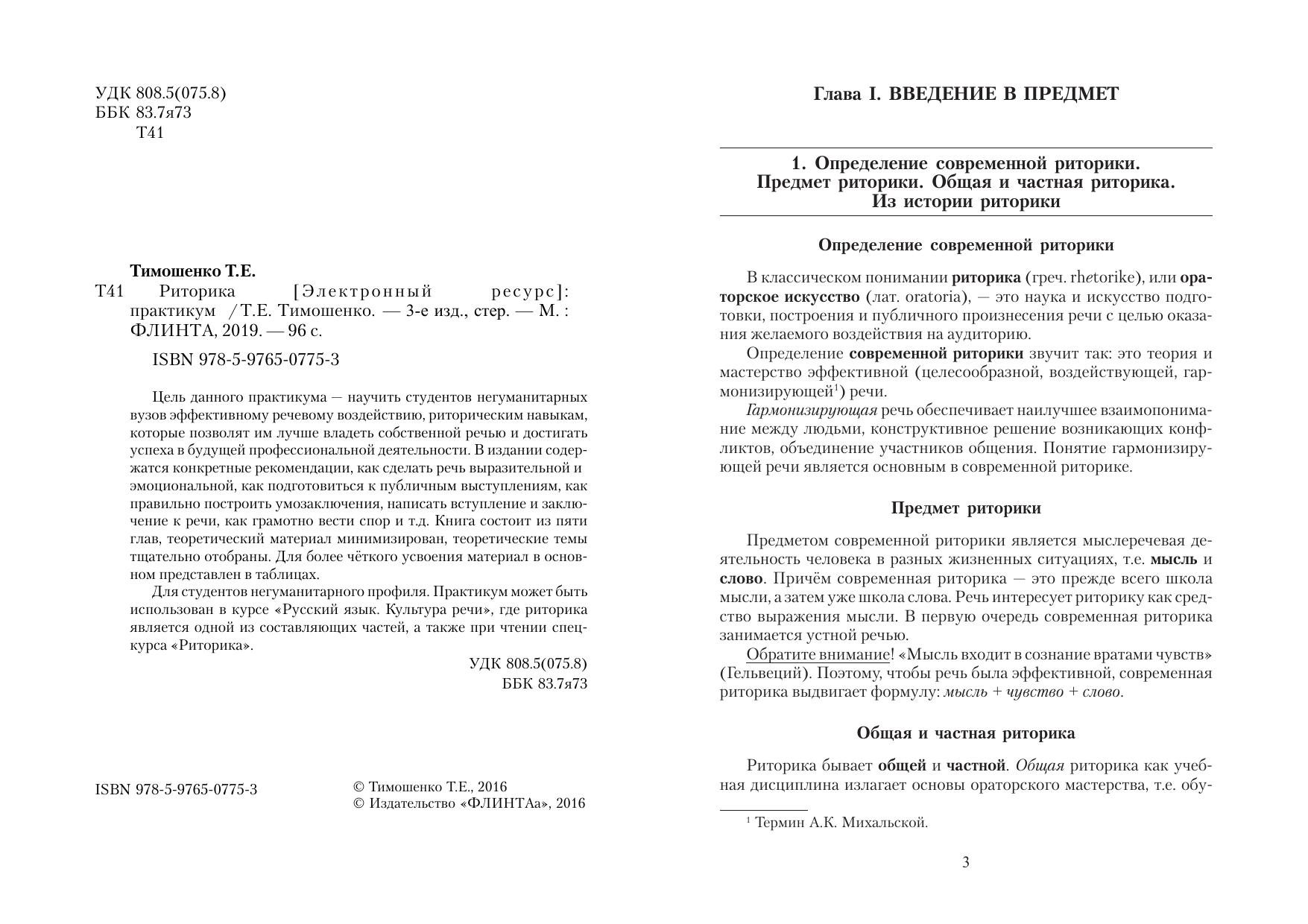 Цель данного практикума — научить студентов негуманитарных вузов эффективному речевому воздействию, риторическим навыкам, которые позволят им лучше владеть собственной речью и достигать успеха в будущей профессиональной деятельности. В издании содержатся конкретные рекомендации, как сделать речь выразительной и эмоциональной, как подготовиться к публичным выступлениям, как правильно построить умозаключения, написать вступление и заключение к речи, как грамотно вести спор и т.д. Книга состоит из пяти глав, теоретический материал минимизирован, теоретические темы тщательно отобраны. Для более чёткого усвоения материал в основном представлен в таблицах. Для студентов негуманитарного профиля. Практикум может быть использован в курсе «Русский язык. Культура речи», где риторика является одной из составляющих частей, а также при чтении спецкурса «Риторика».