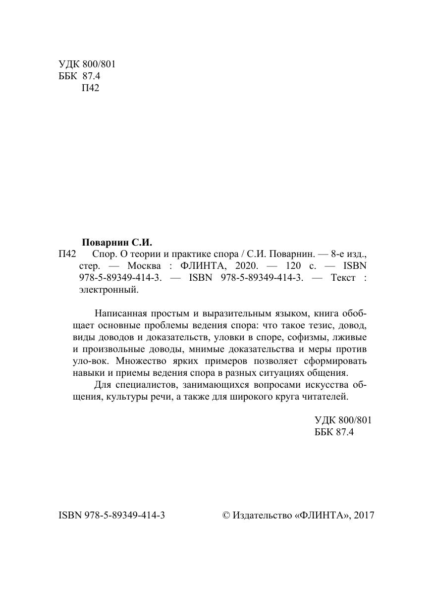 Написанная простым и выразительным языком, книга обобщает основные проблемы ведения спора: что такое тезис, довод, виды доводов и доказательств, уловки в споре, софизмы, лживые и произвольные доводы, мнимые доказательства и меры против уловок. Множество ярких примеров позволяет сформировать навыки и приемы ведения спора в разных ситуациях общения.